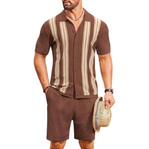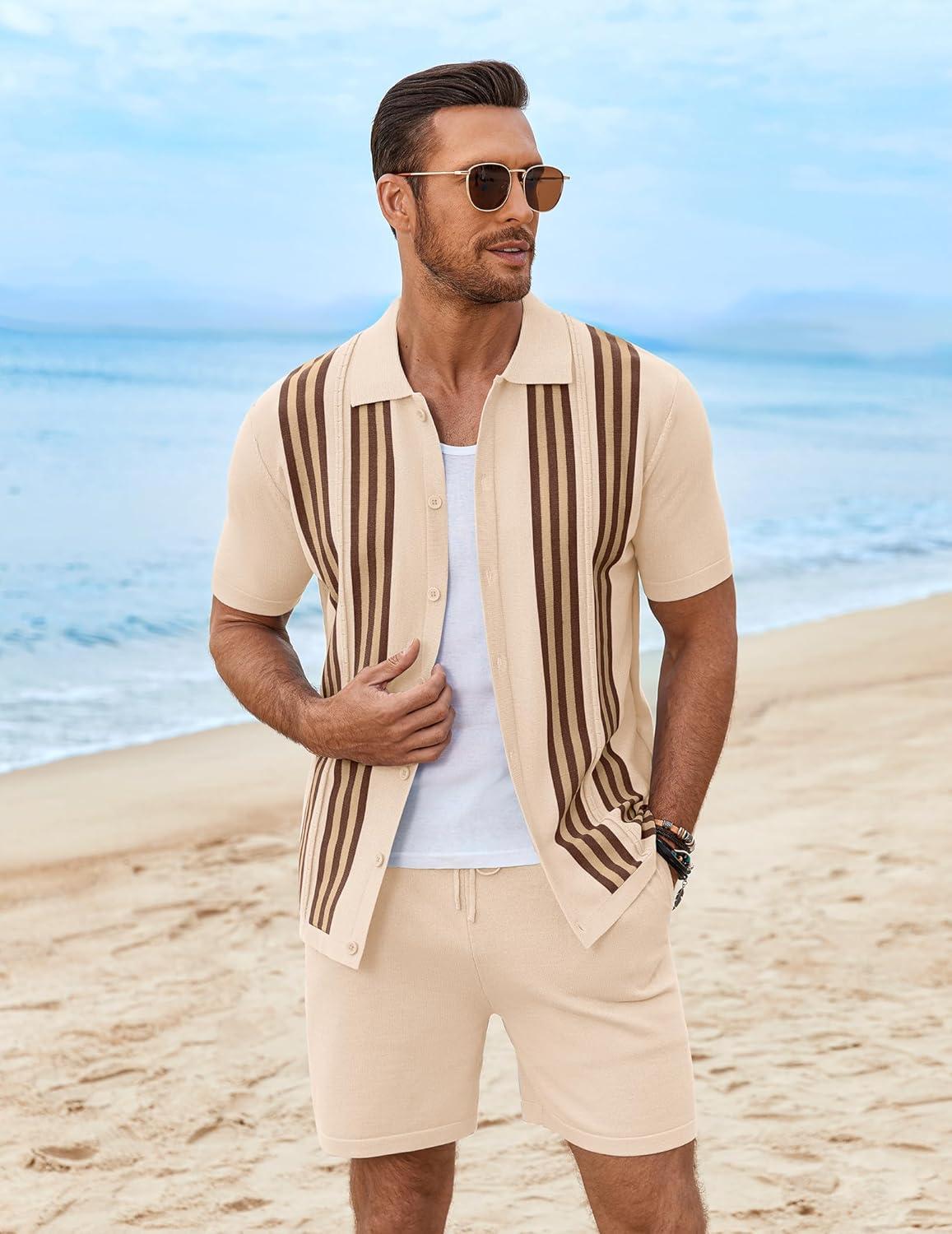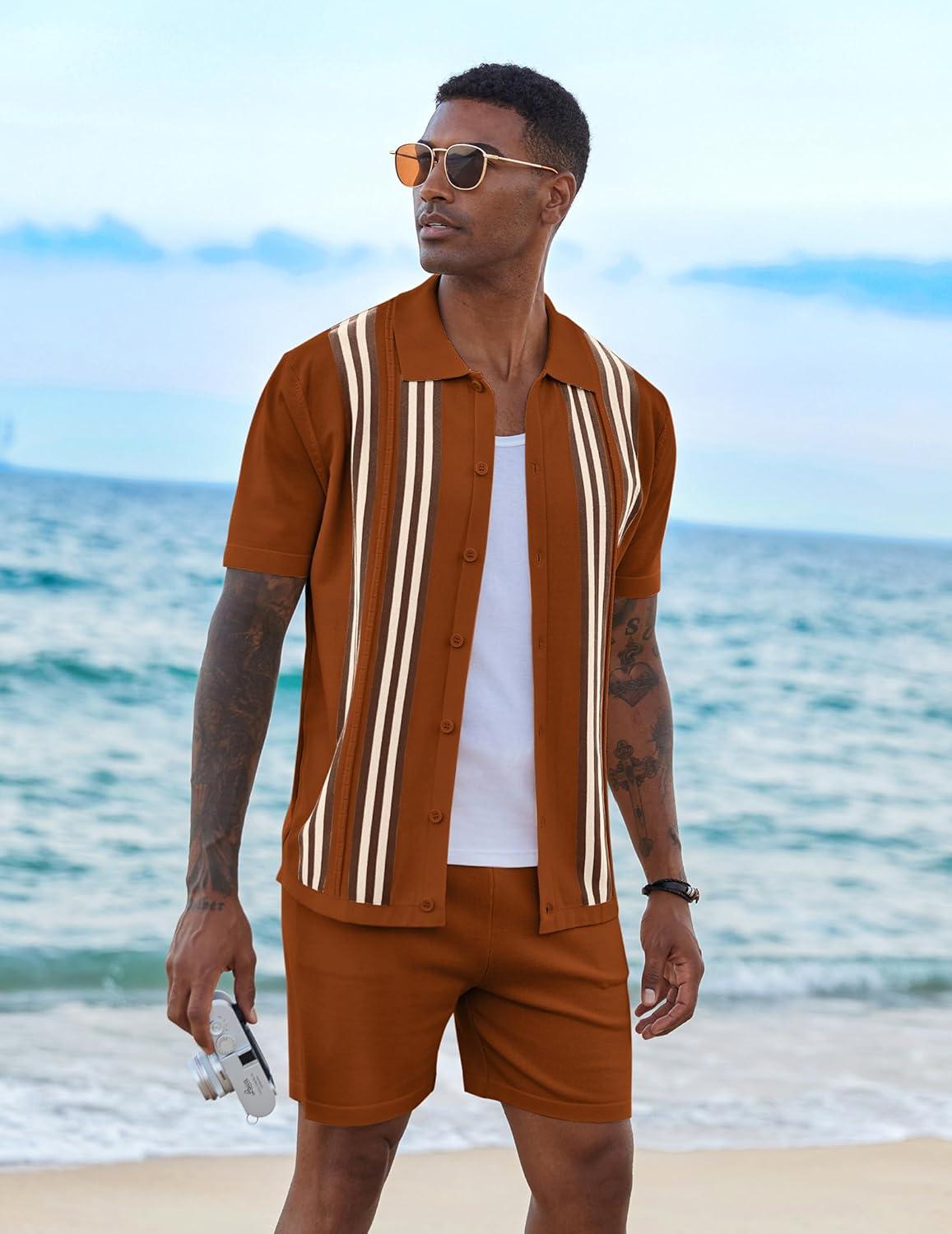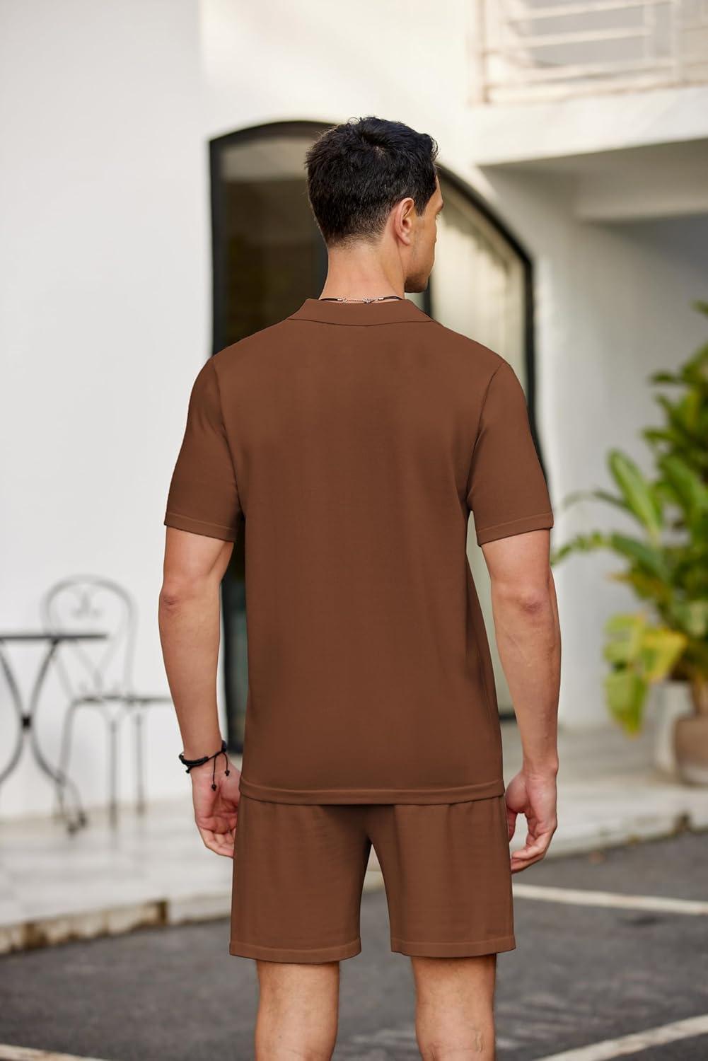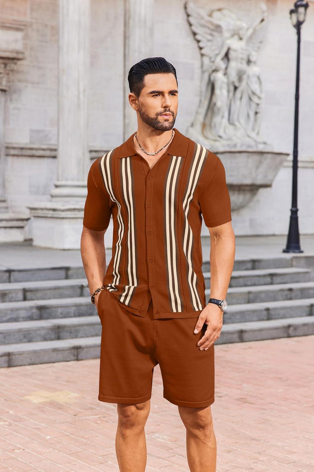 COOFANDY Men’s 2 Piece Outfits Sets Casual Short Sleeve Button Down Knit Shirt and Shorts Sets Summer Beach Outfits(Brown)