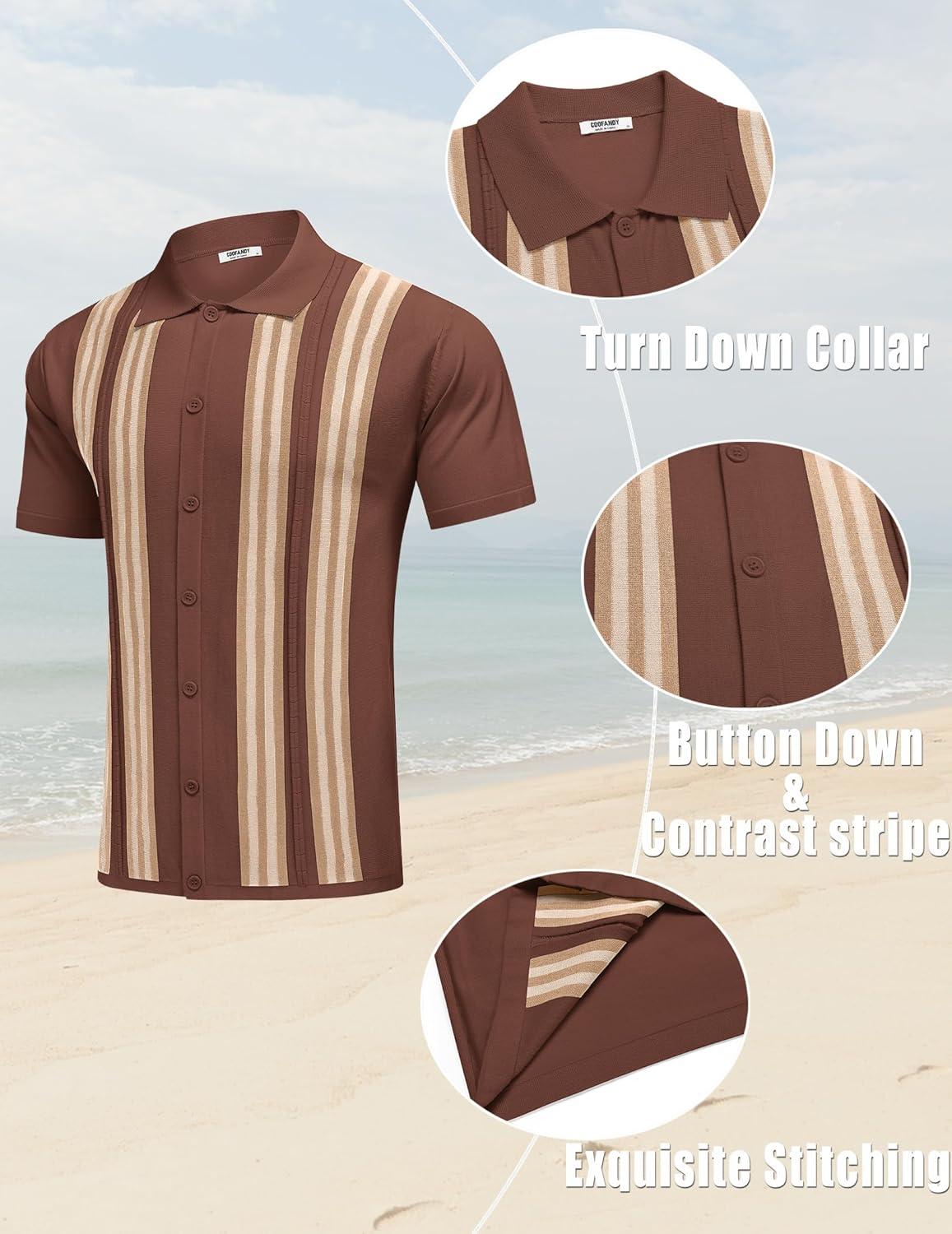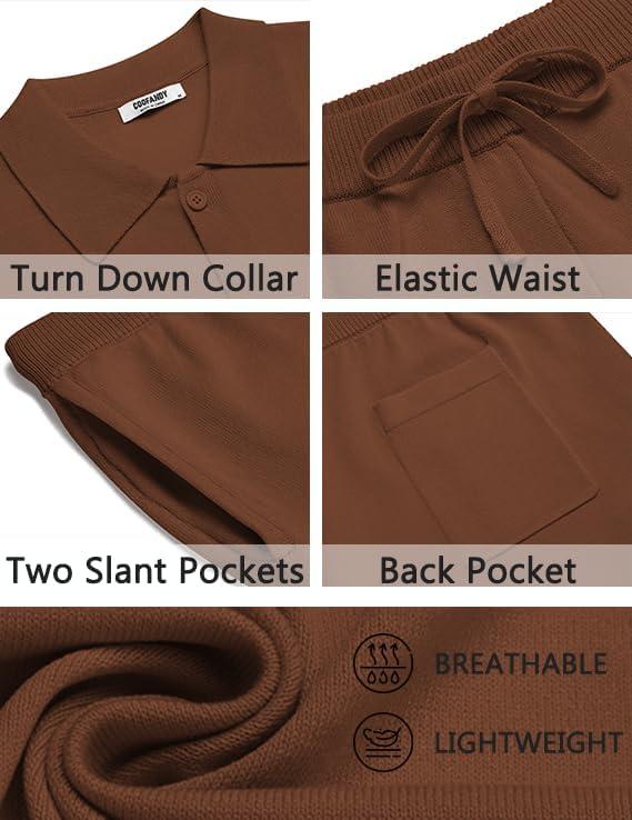 COOFANDY Men’s 2 Piece Outfits Summer Short Sets Vintage Knit Button Down Shirt Short Sleeve Polo Casual Beach Suits(Brown)