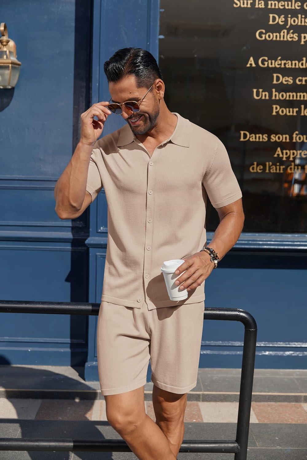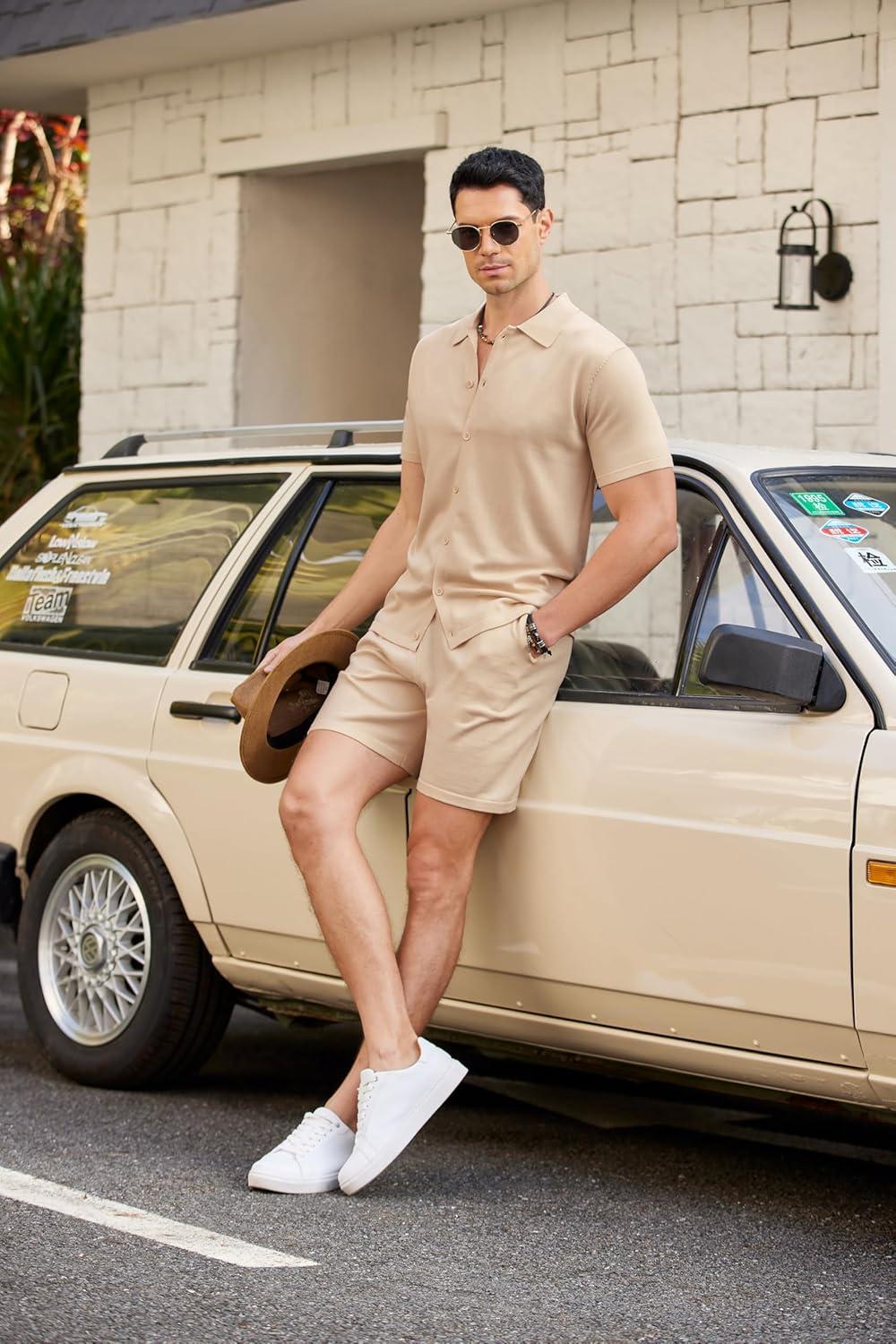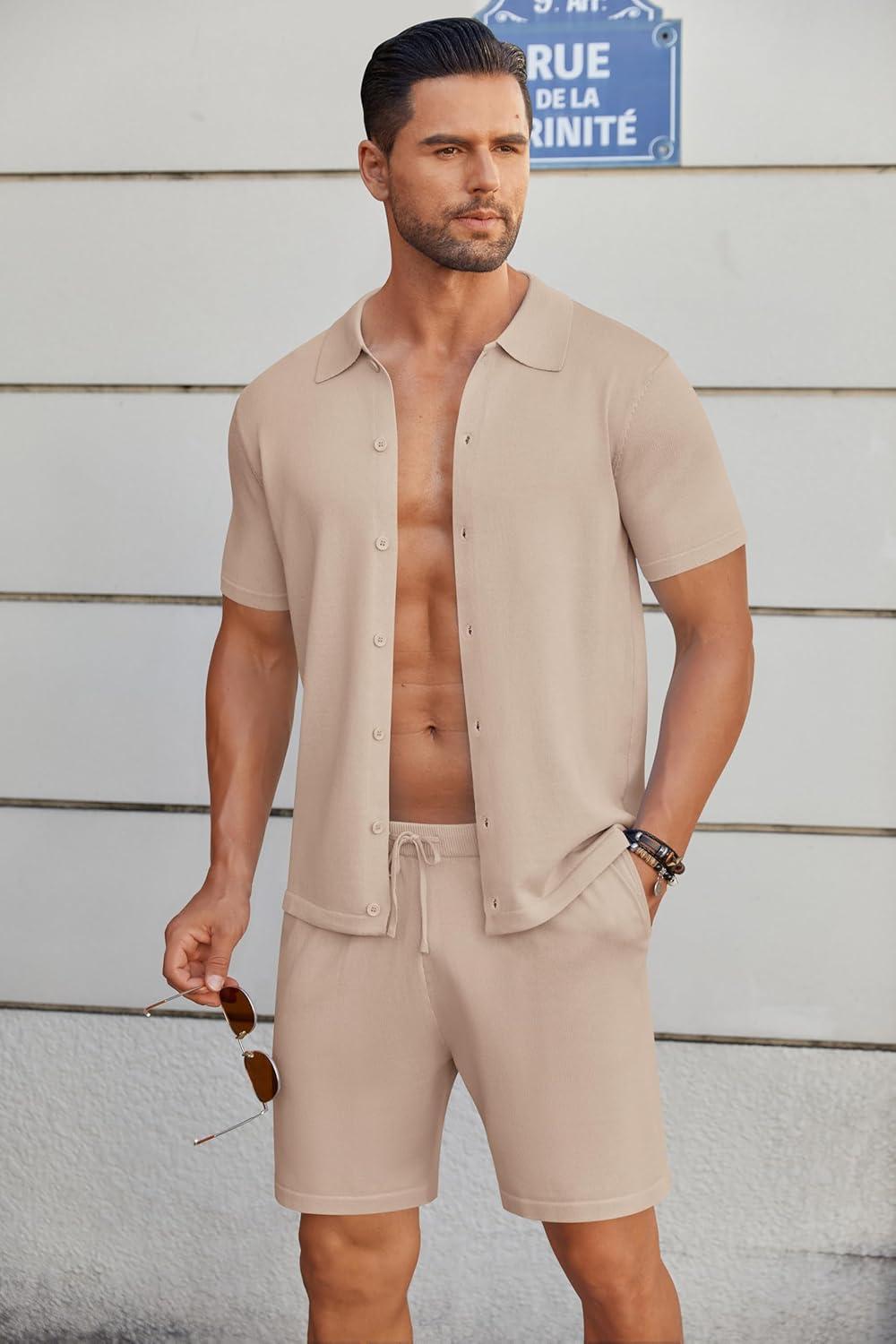 COOFANDY Men’s 2 Piece Outfits Sets Casual Short Sleeve Button Down Knit Shirt and Shorts Sets Summer Beach Outfits(Light Khaki)