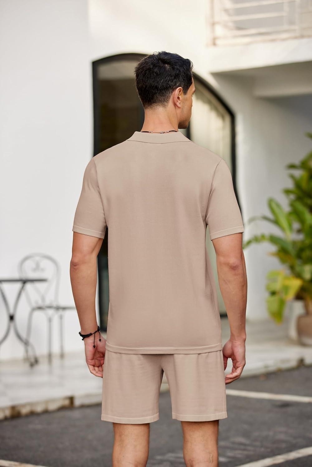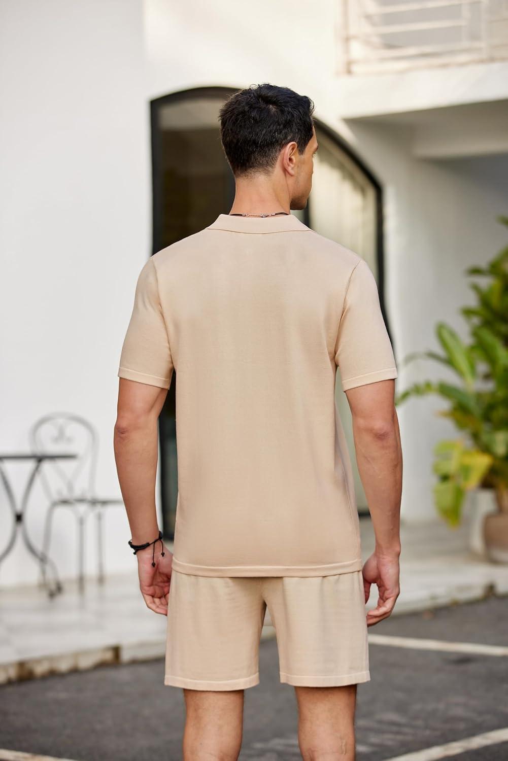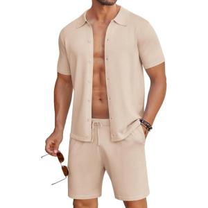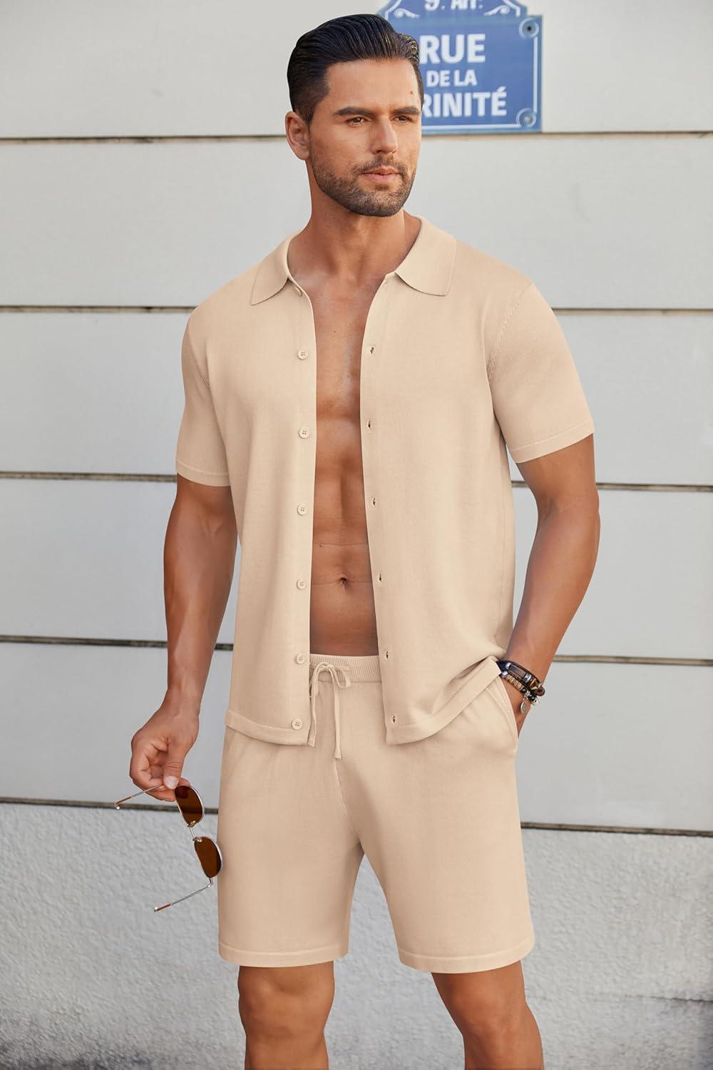COOFANDY Men’s 2 Piece Outfits Sets Casual Short Sleeve Button Down Knit Shirt and Shorts Sets Summer Beach Outfits(Light Khaki)