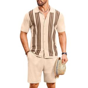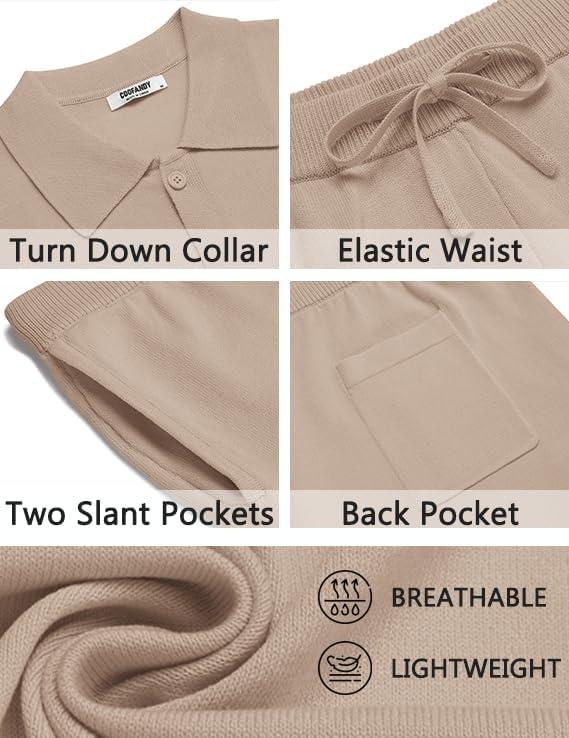 COOFANDY Men’s 2 Piece Outfits Summer Short Sets Vintage Knit Button Down Shirt Short Sleeve Polo Casual Beach Suits(Light Khaki)
