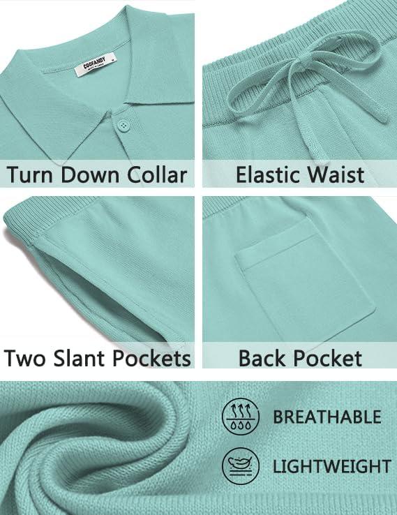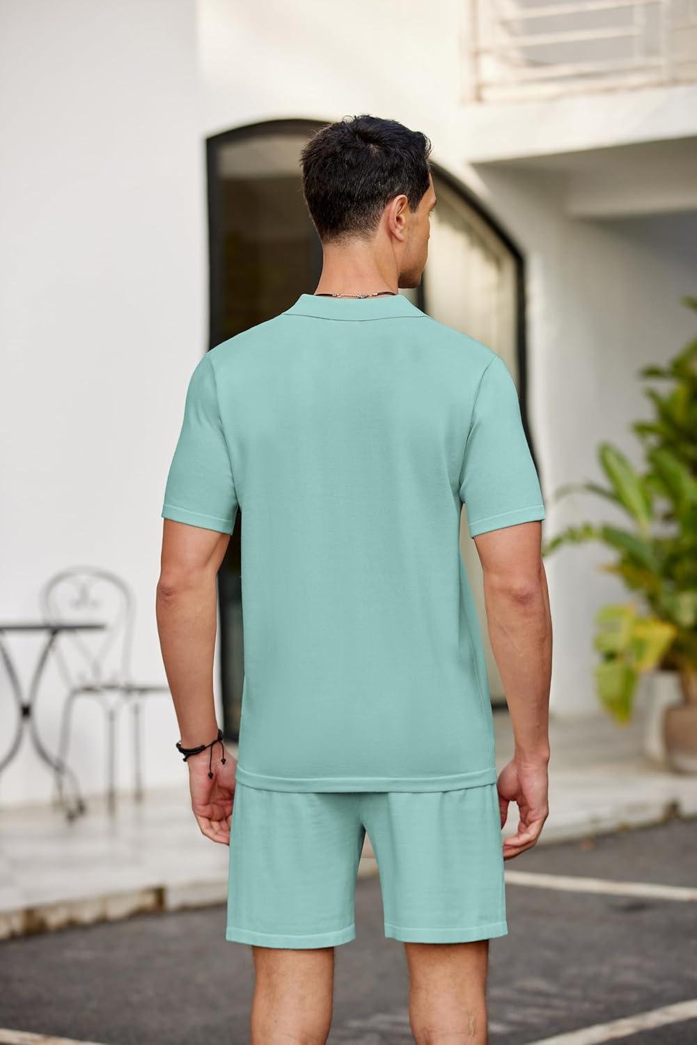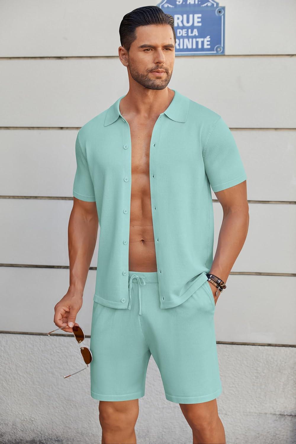COOFANDY Men’s 2 Piece Outfits Sets Casual Short Sleeve Button Down Knit Shirt and Shorts Sets Summer Beach Outfits(Light Green)