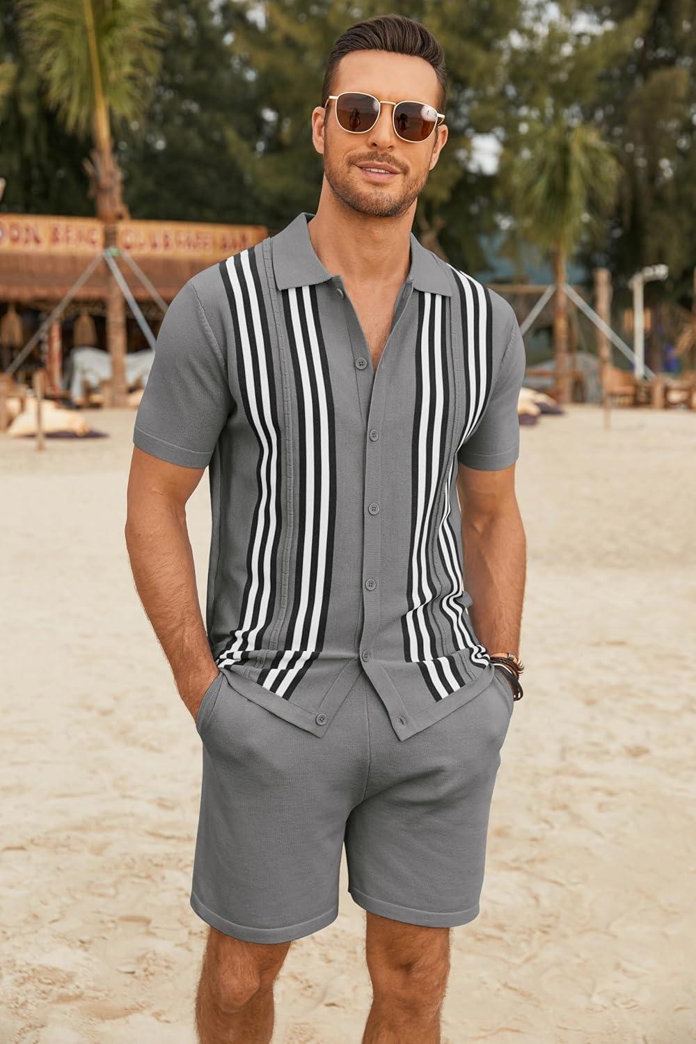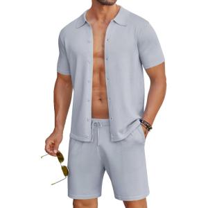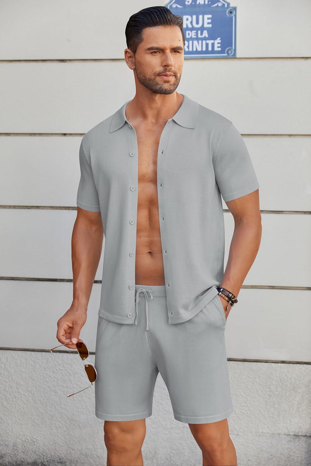 COOFANDY Men’s 2 Piece Outfits Sets Casual Short Sleeve Button Down Knit Shirt and Shorts Sets Summer Beach Outfits(Light Grey)