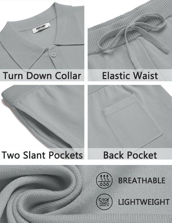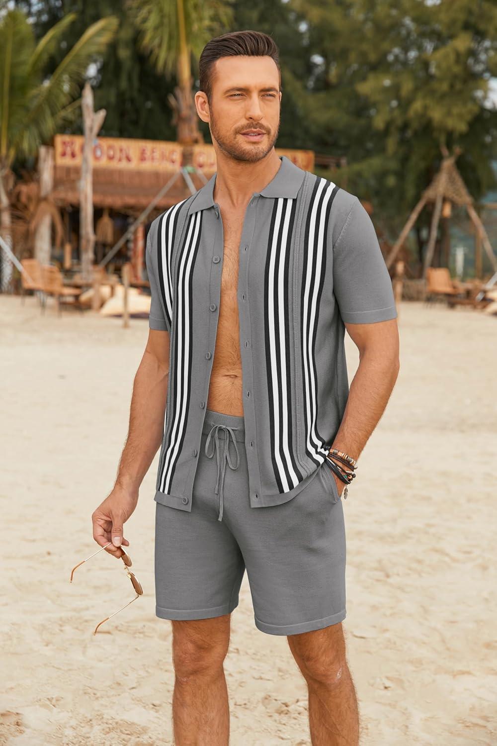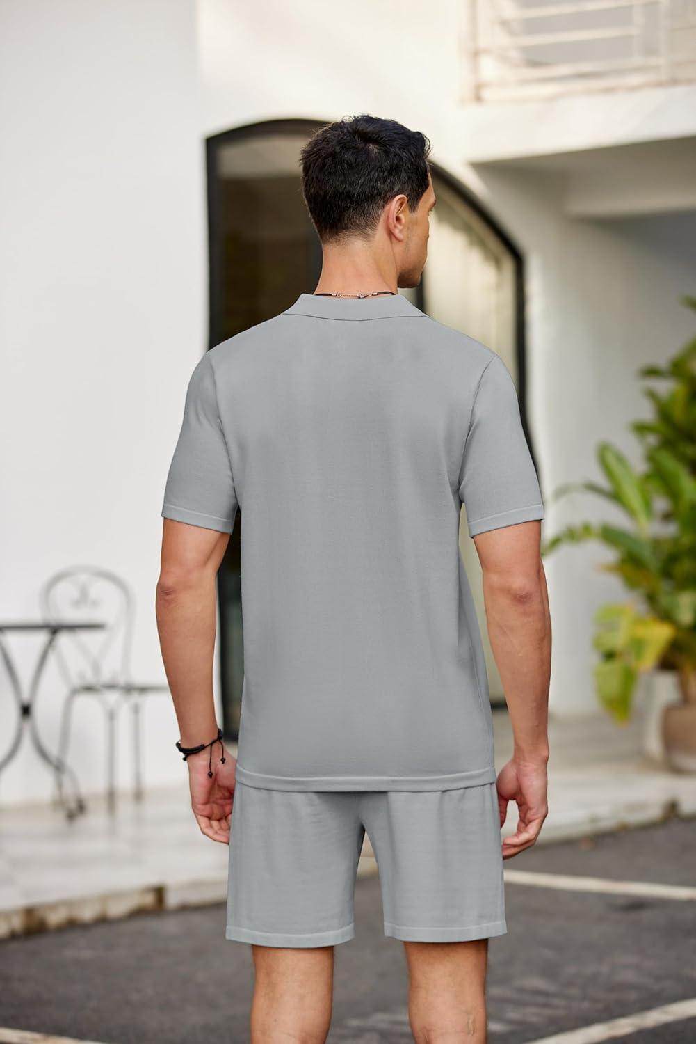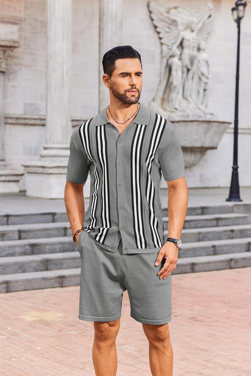 COOFANDY Men’s 2 Piece Outfits Summer Short Sets Vintage Knit Button Down Shirt Short Sleeve Polo Casual Beach Suits(Grey)