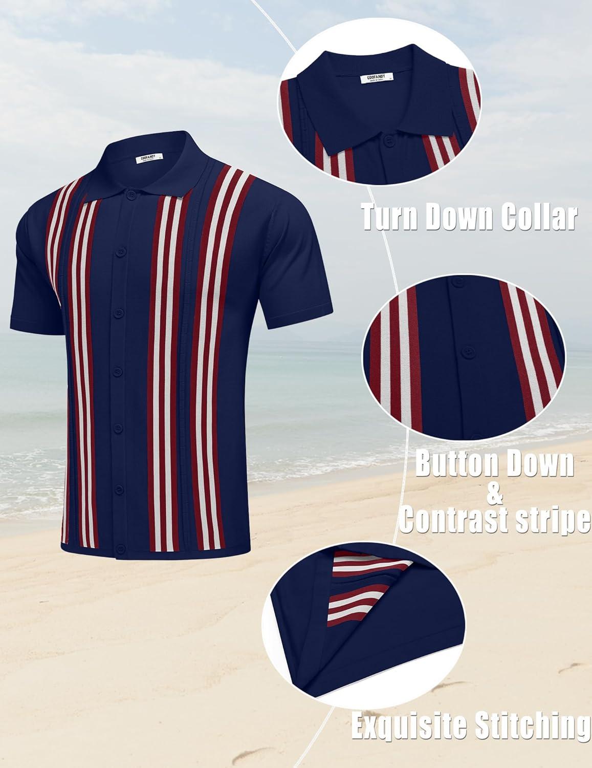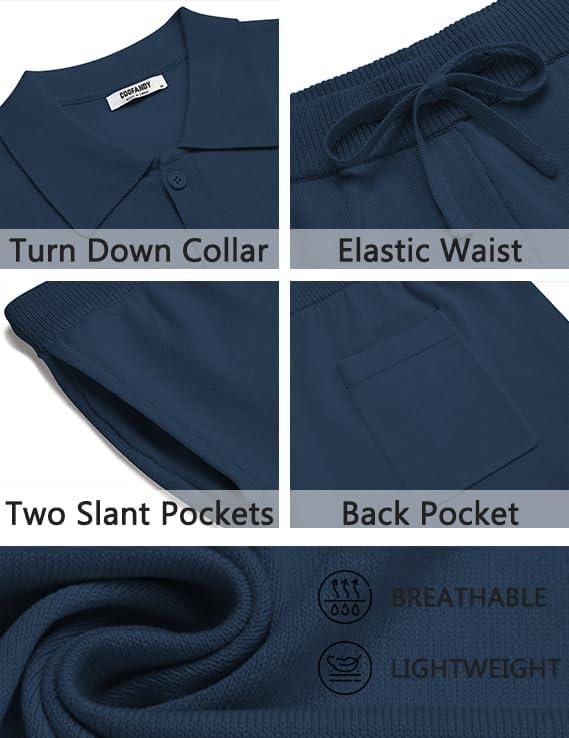 COOFANDY Men’s 2 Piece Outfits Summer Short Sets Vintage Knit Button Down Shirt Short Sleeve Polo Casual Beach Suits(Navy Blue)