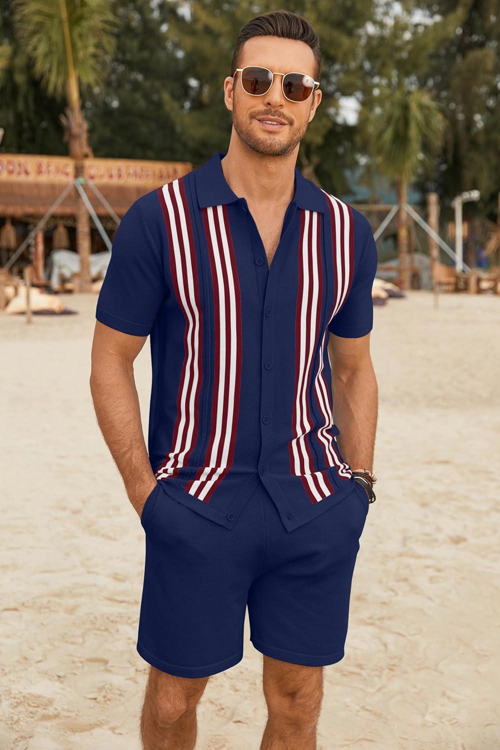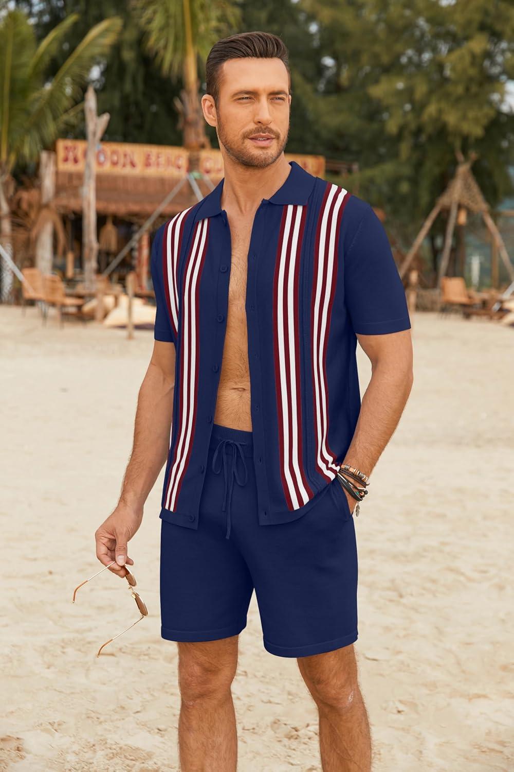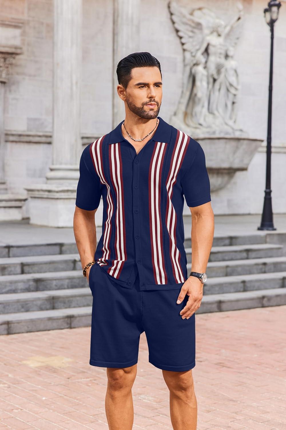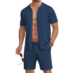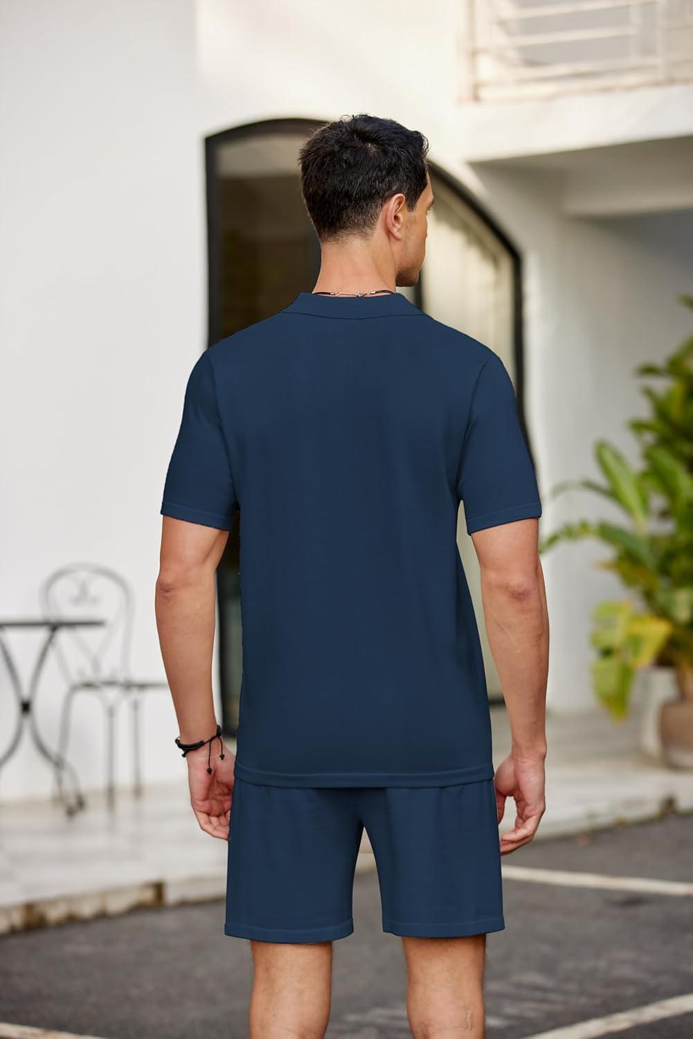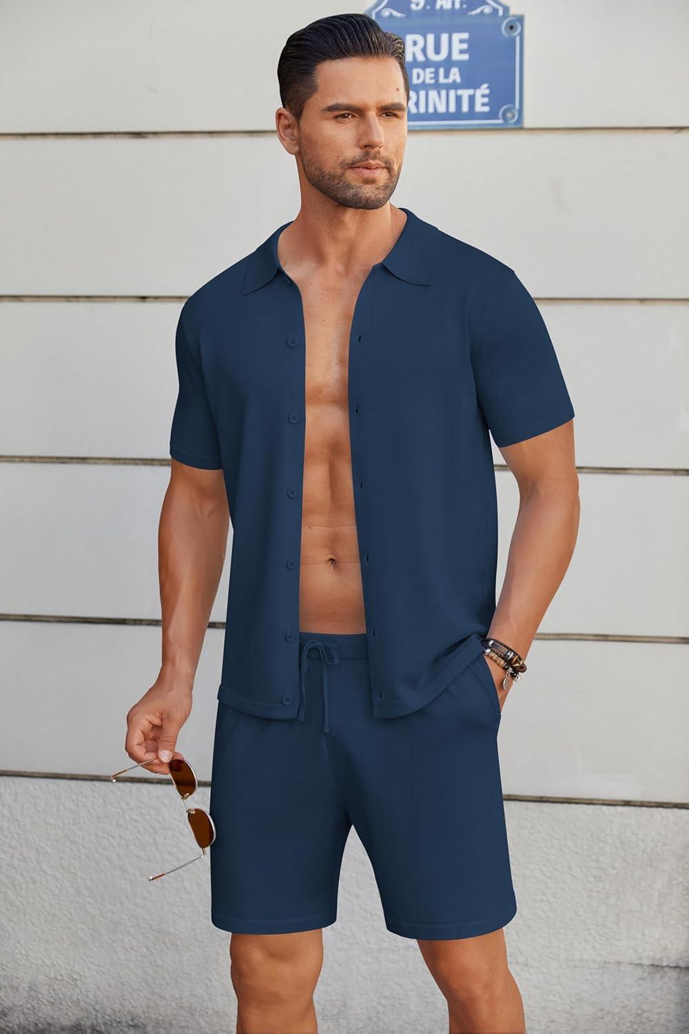COOFANDY Men’s 2 Piece Outfits Sets Casual Short Sleeve Button Down Knit Shirt and Shorts Sets Summer Beach Outfits(Navy Blue)