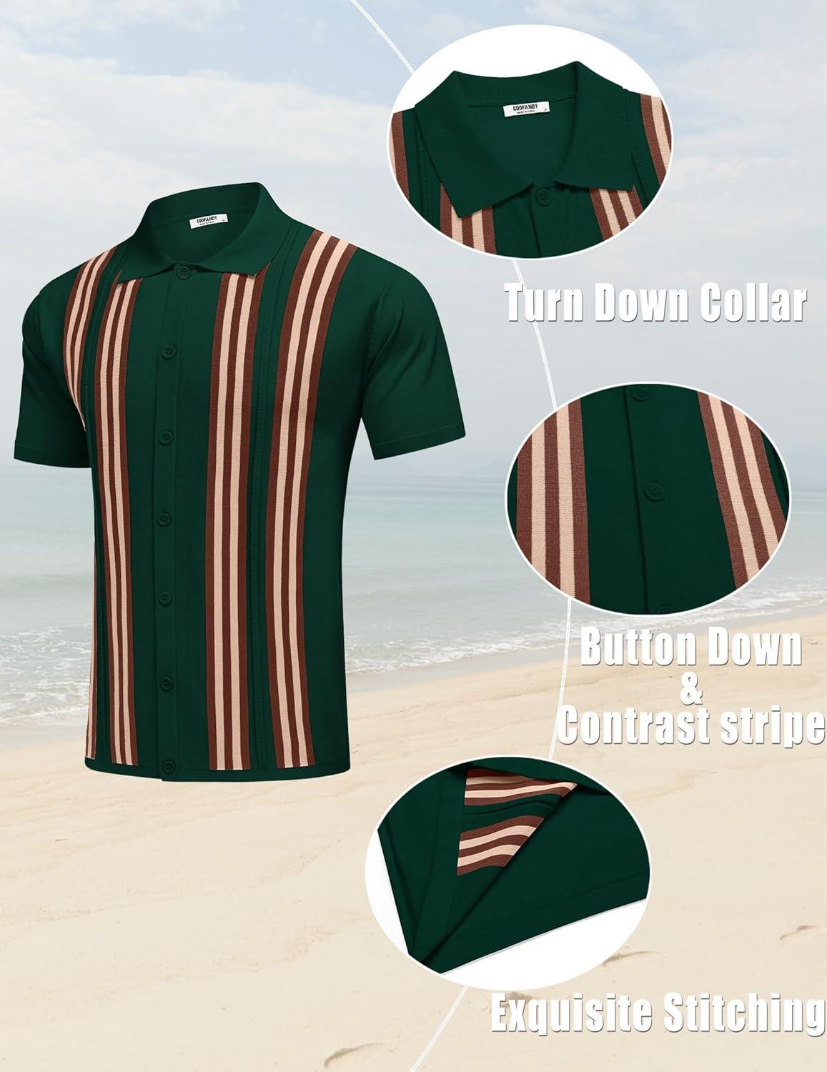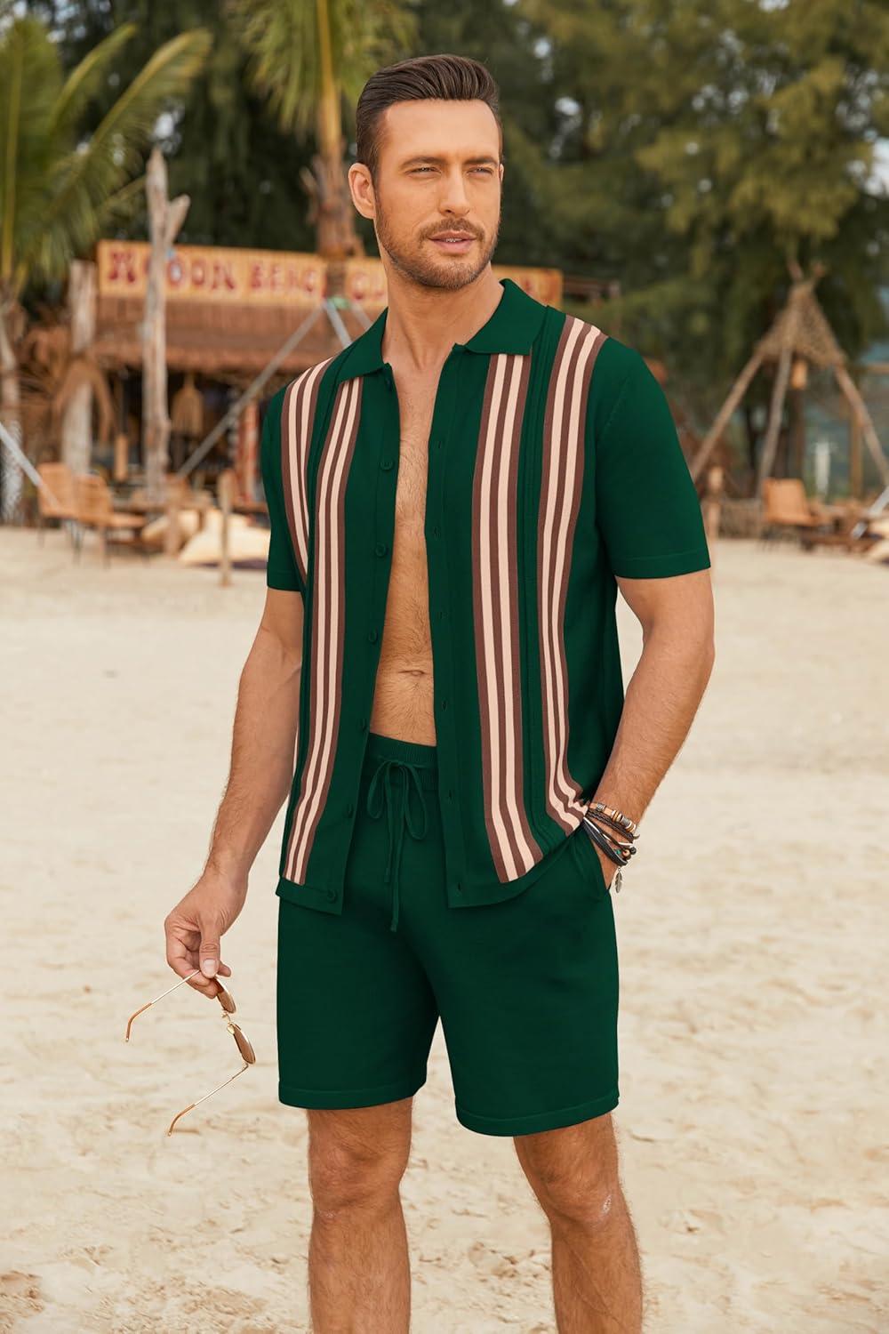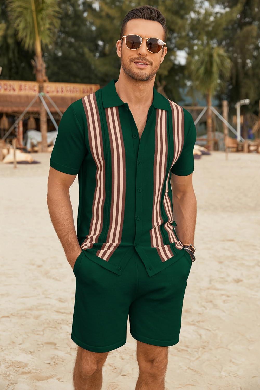 COOFANDY Men’s 2 Piece Outfits Summer Short Sets Vintage Knit Button Down Shirt Short Sleeve Polo Casual Beach Suits(Dark Green)