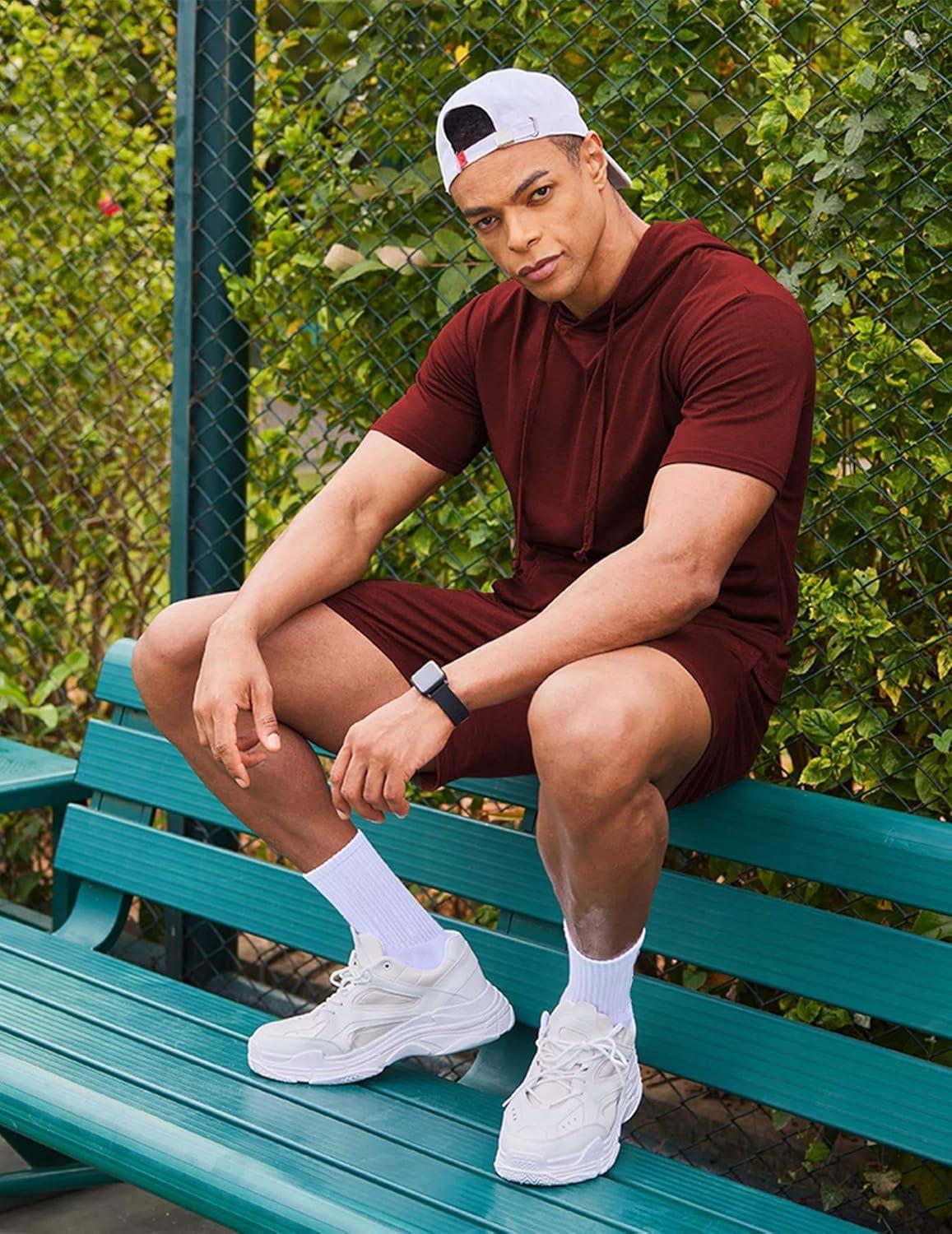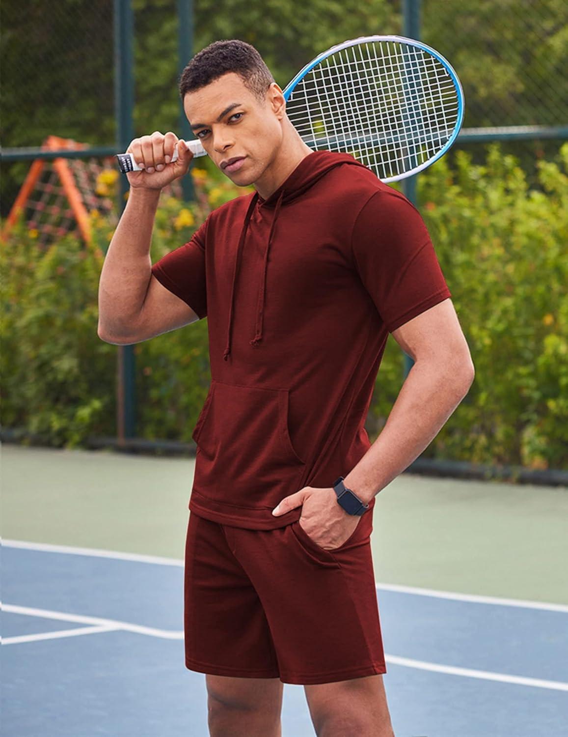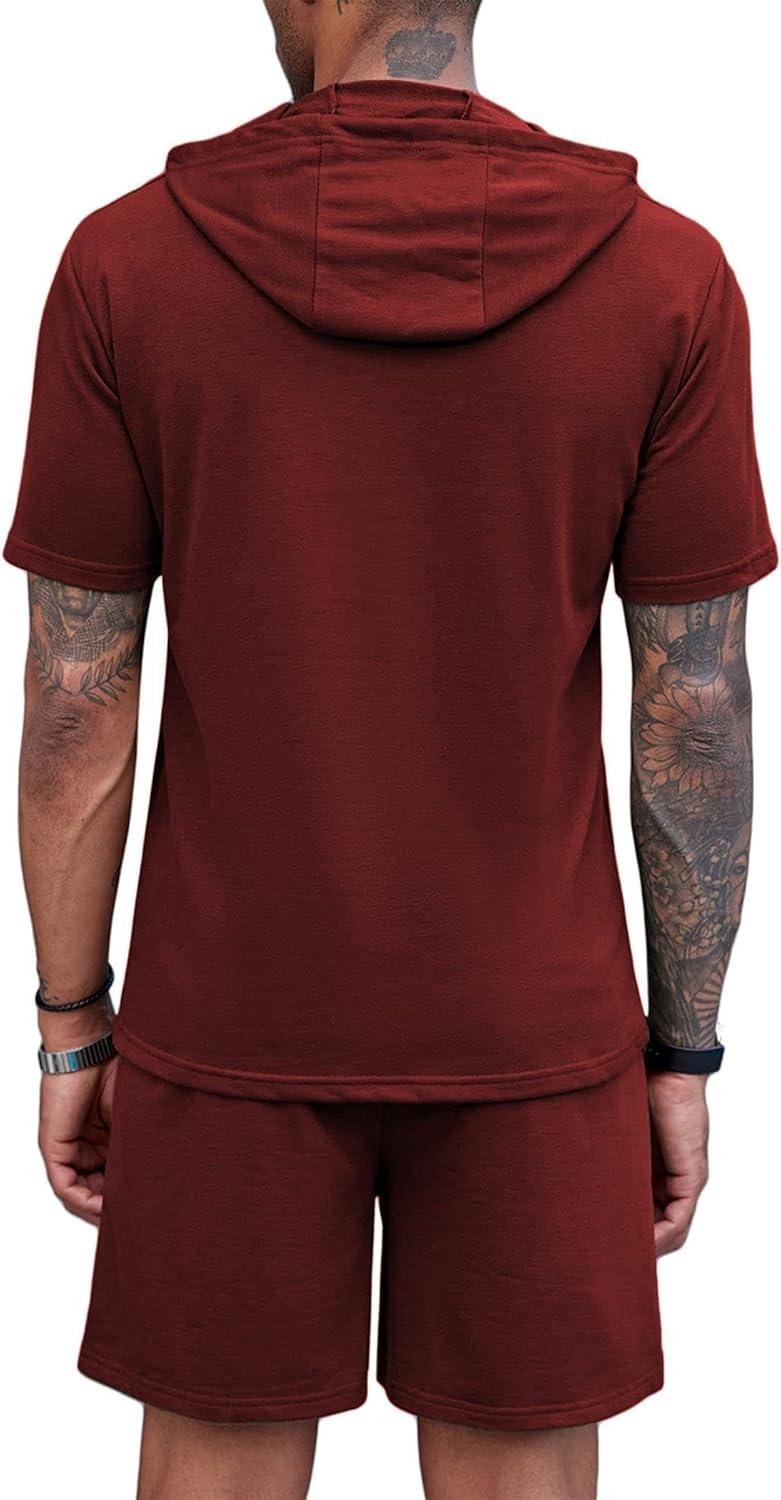 COOFANDY Men’s Tracksuit 2 Piece Hooded Athletic Sweatsuit Short Sleeve Casual Sports Hoodie Shorts Set(Wine Red)