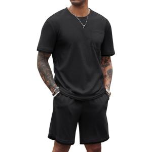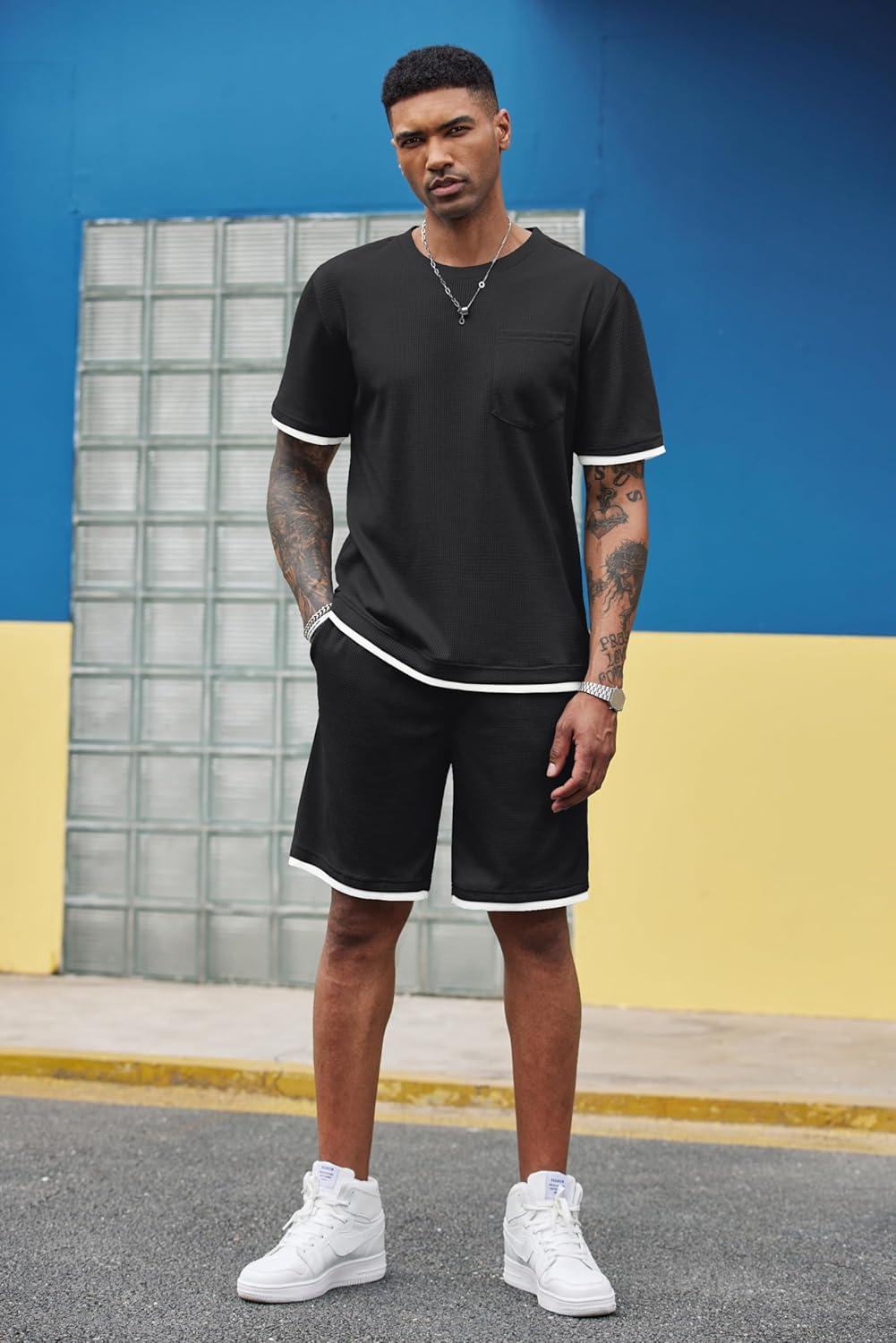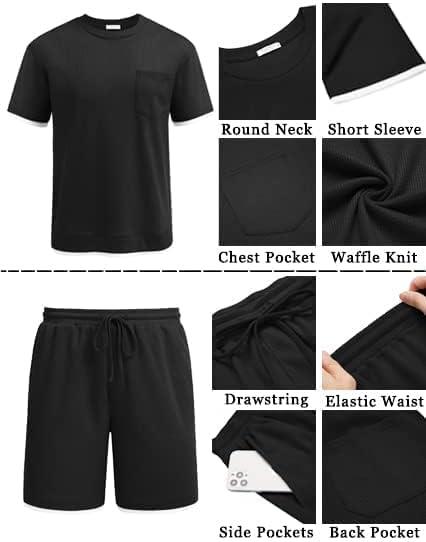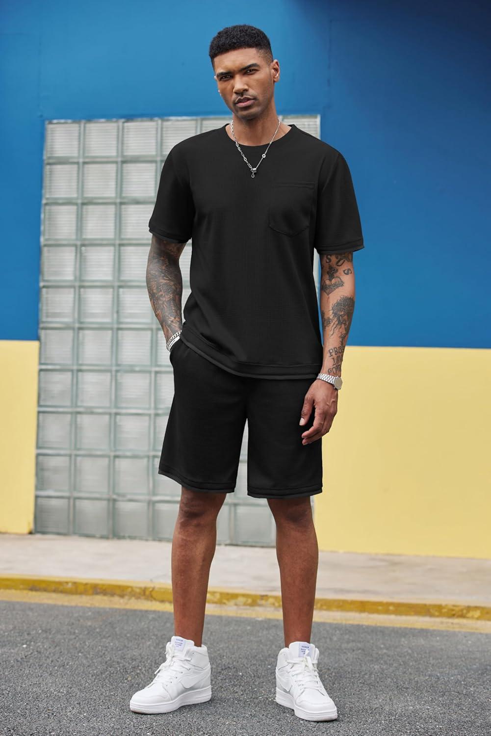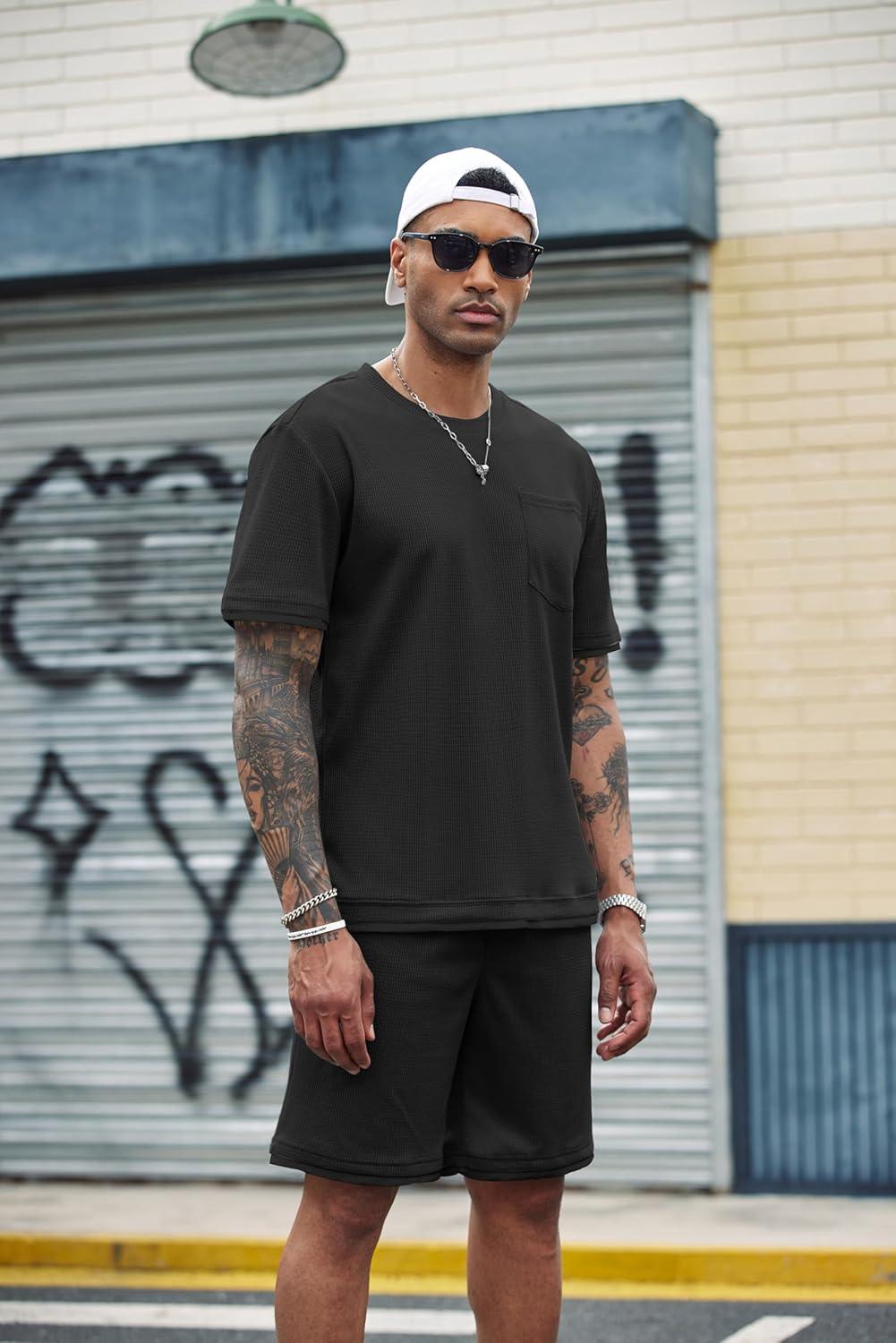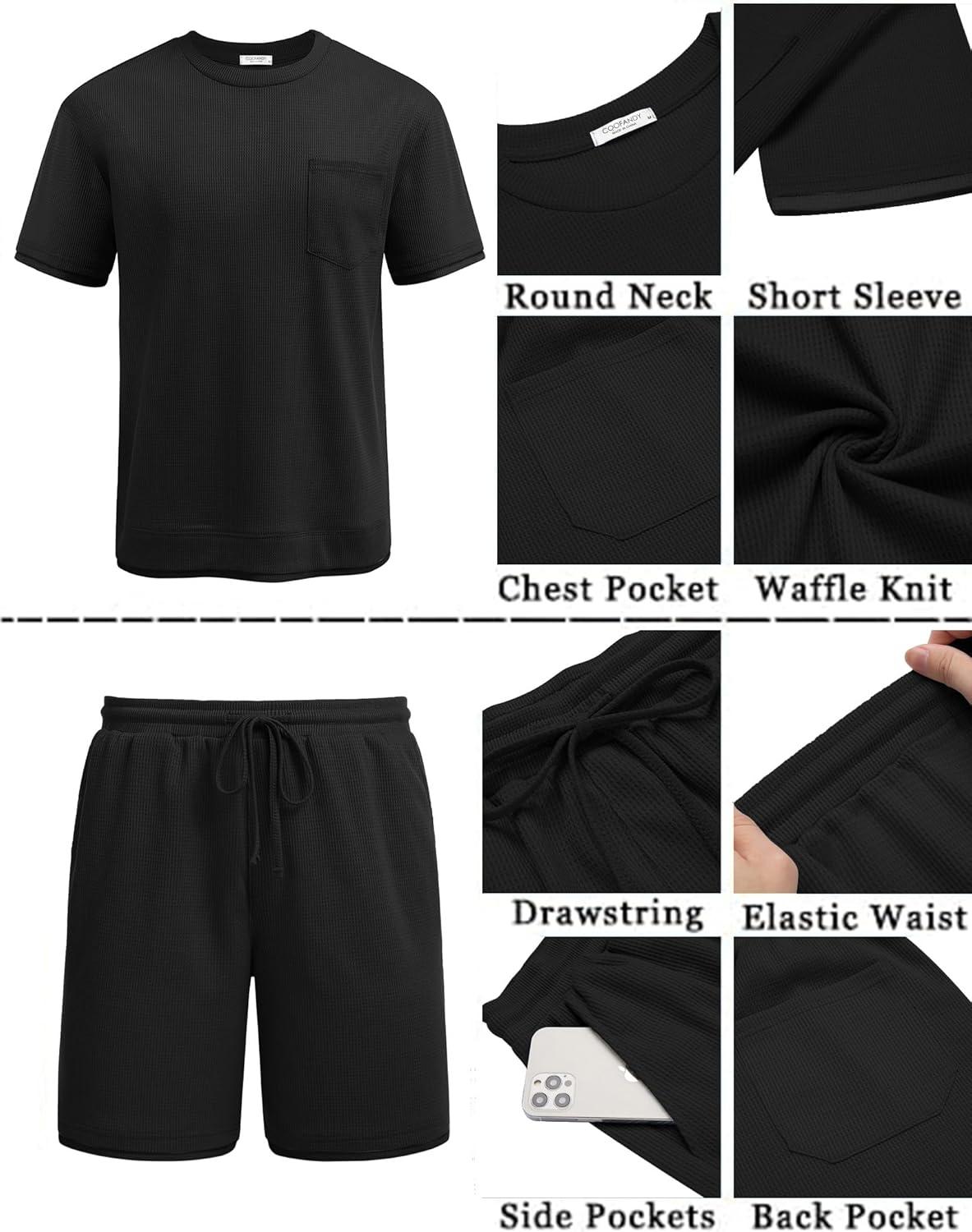 COOFANDY Men’s Waffle Shirt and Shorts Set 2 Piece Outfits Casual Summer Tracksuits Set with Pockets(A-black)