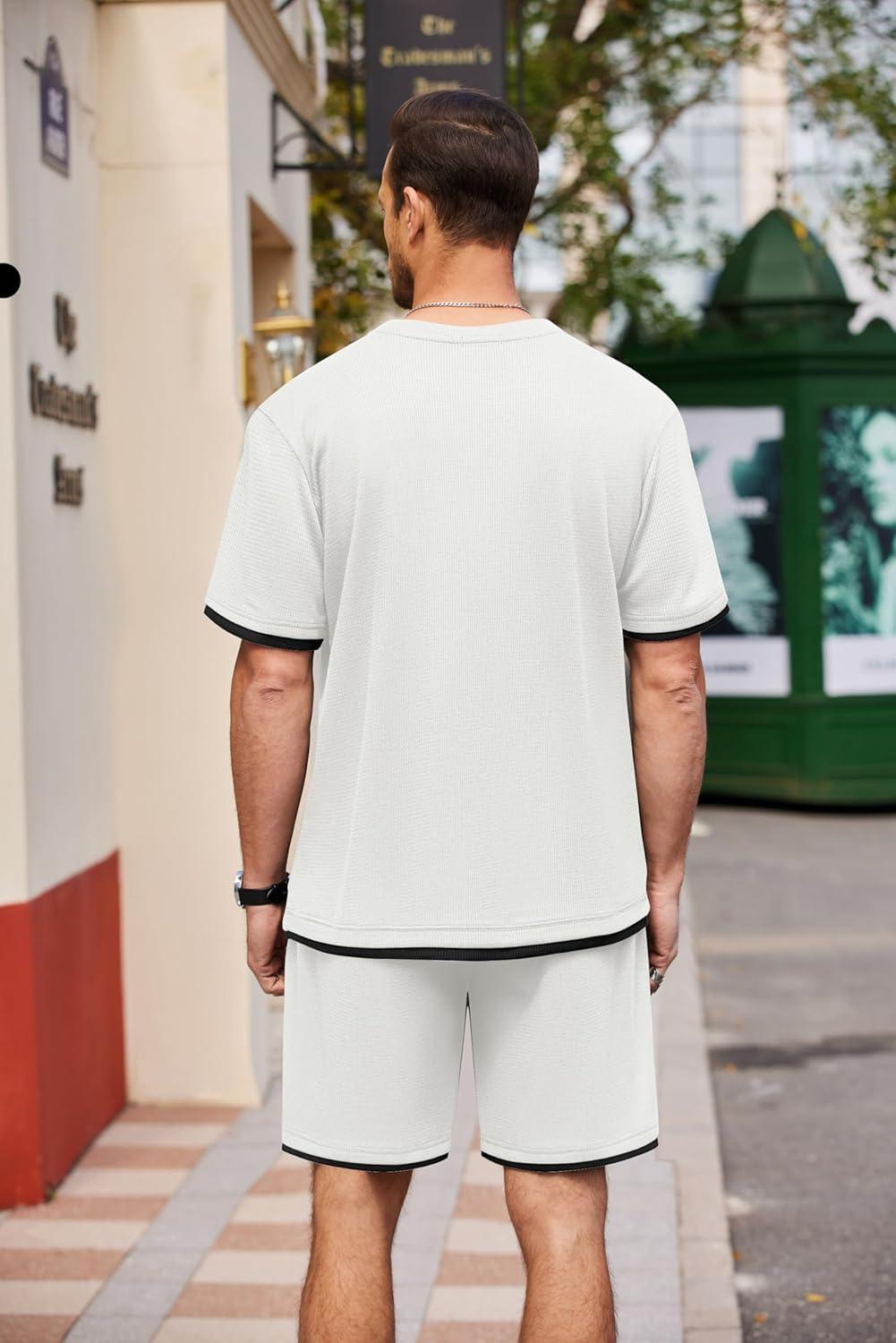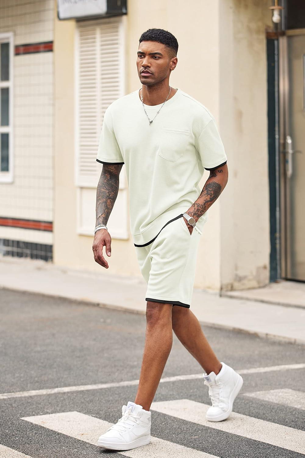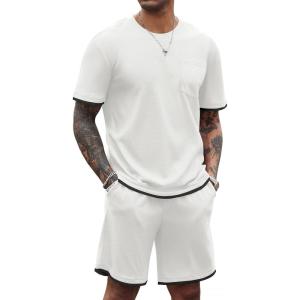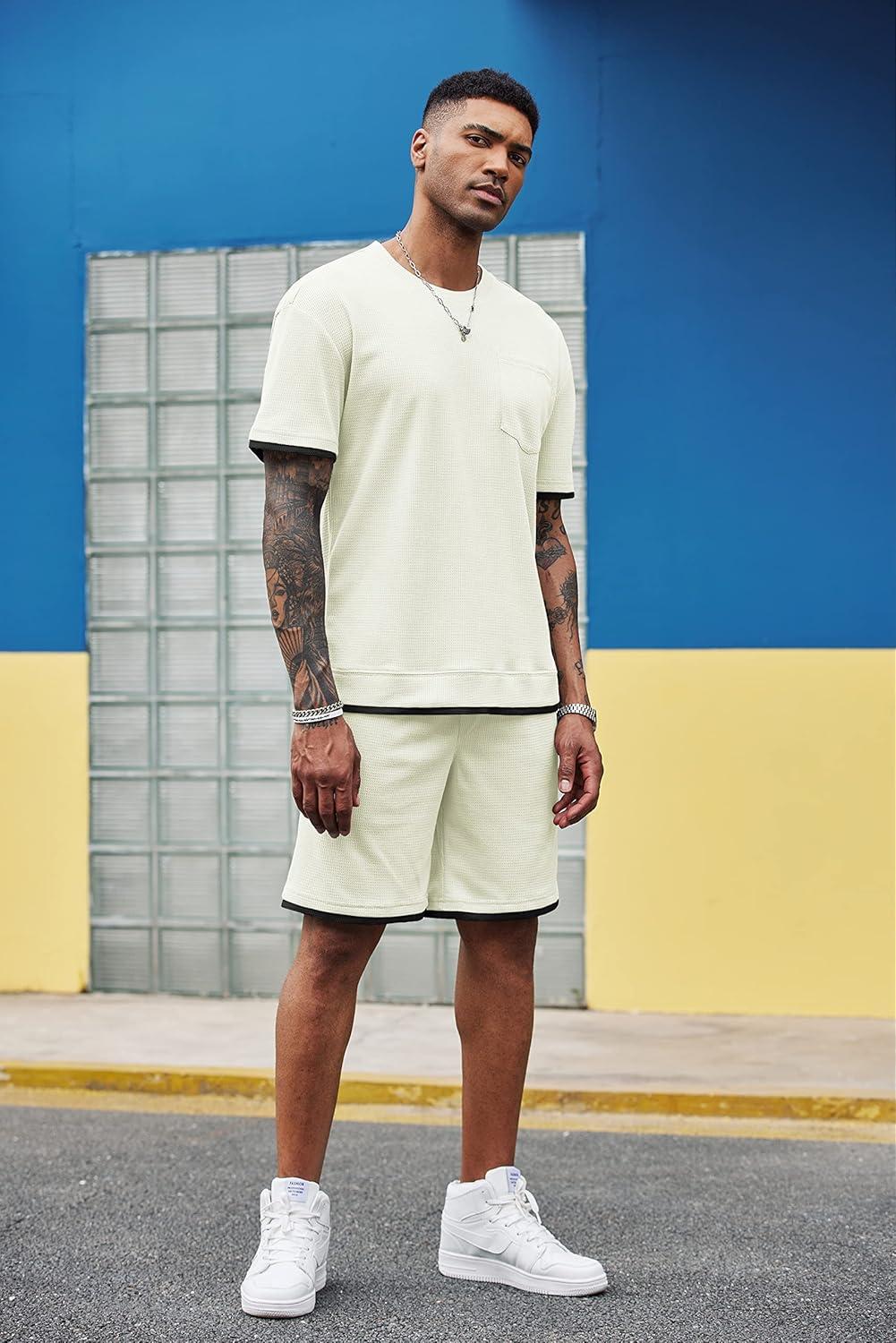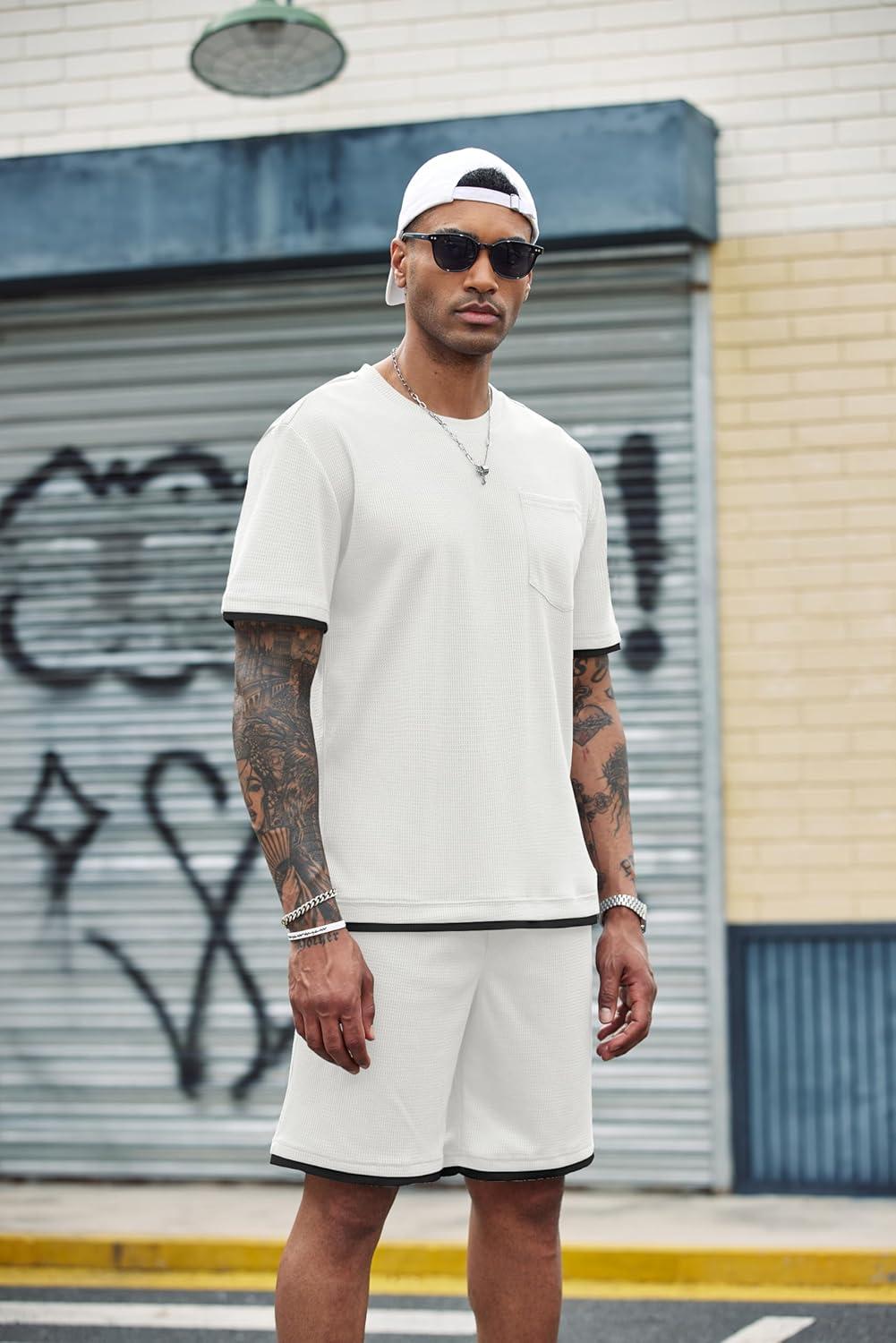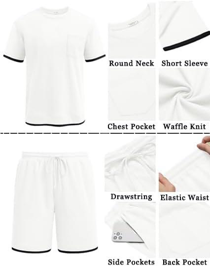 COOFANDY Men’s Waffle Shirt and Shorts Set 2 Piece Outfits Casual Summer Tracksuits Set with Pockets(White)