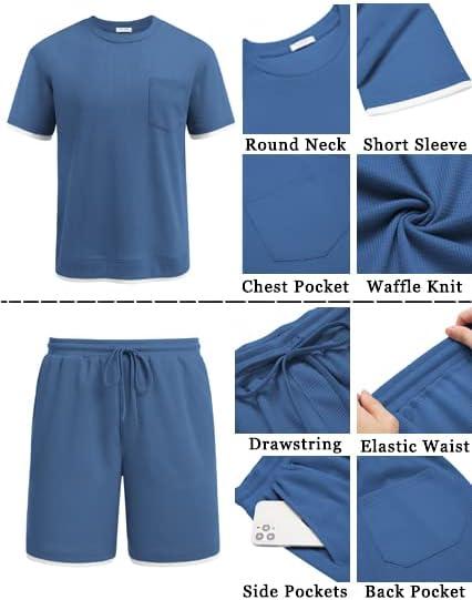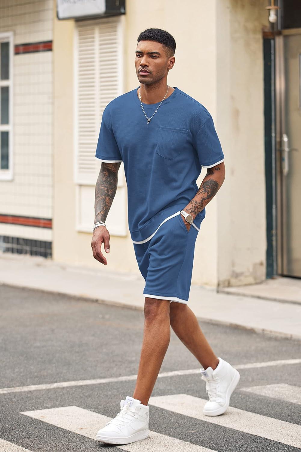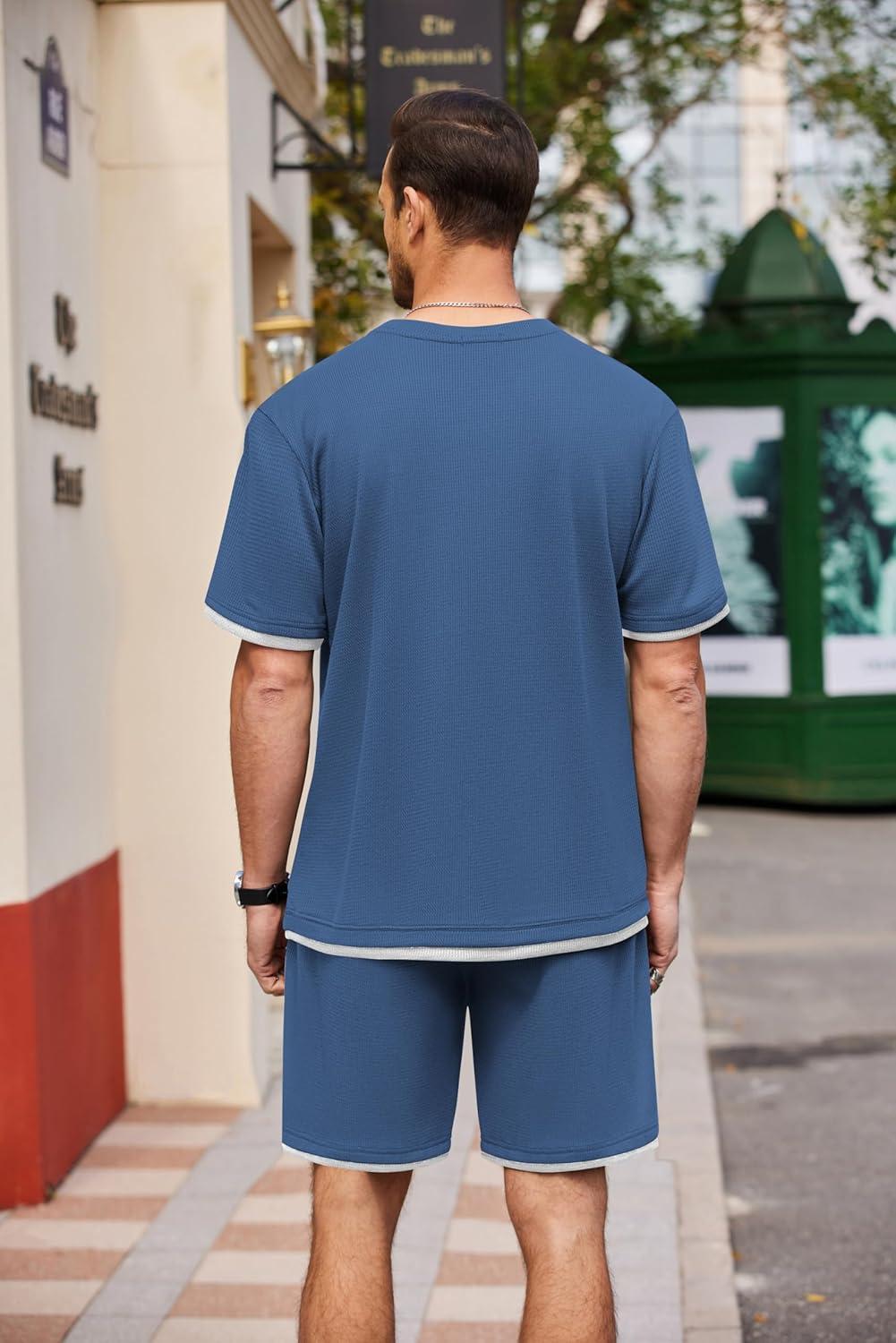 COOFANDY Men’s Waffle Shirt and Shorts Set 2 Piece Outfits Casual Summer Tracksuits Set with Pockets(Blue)
