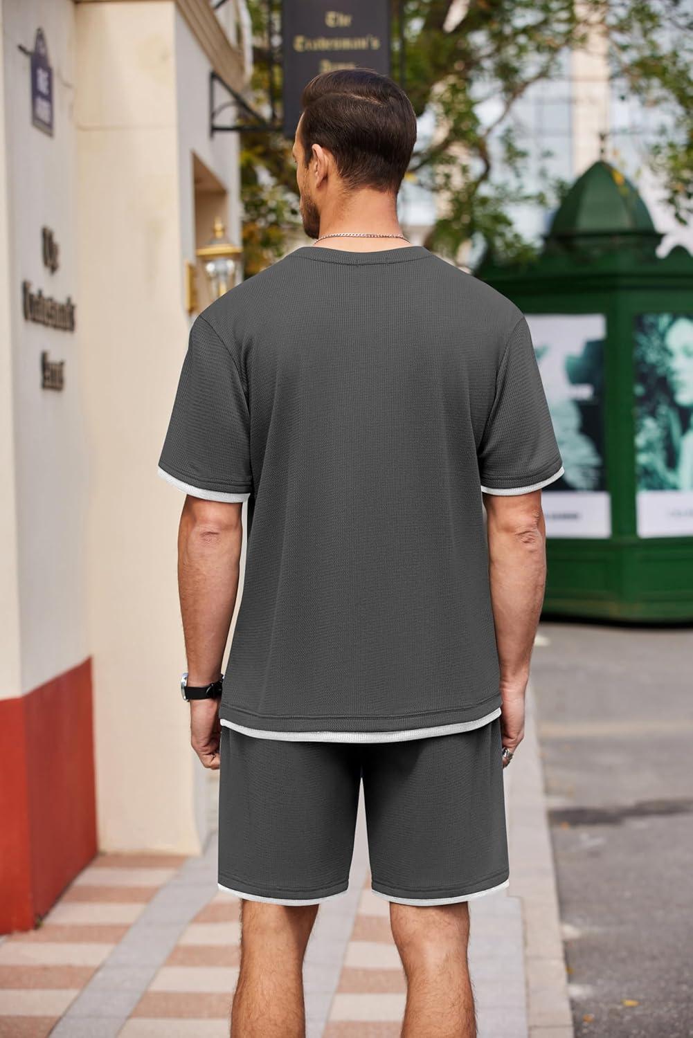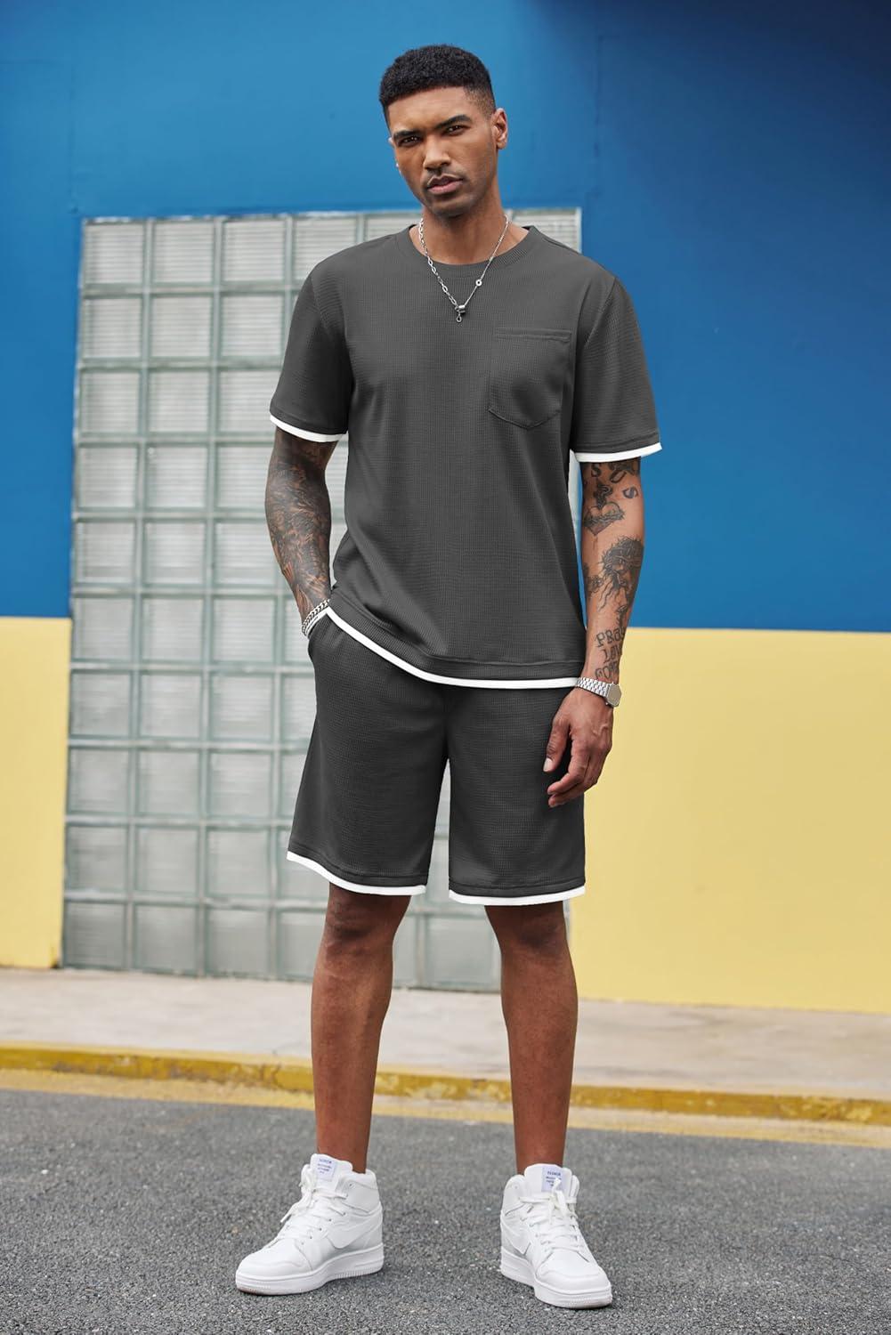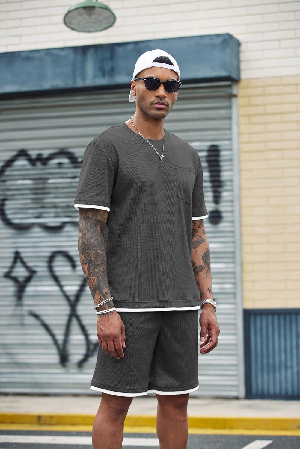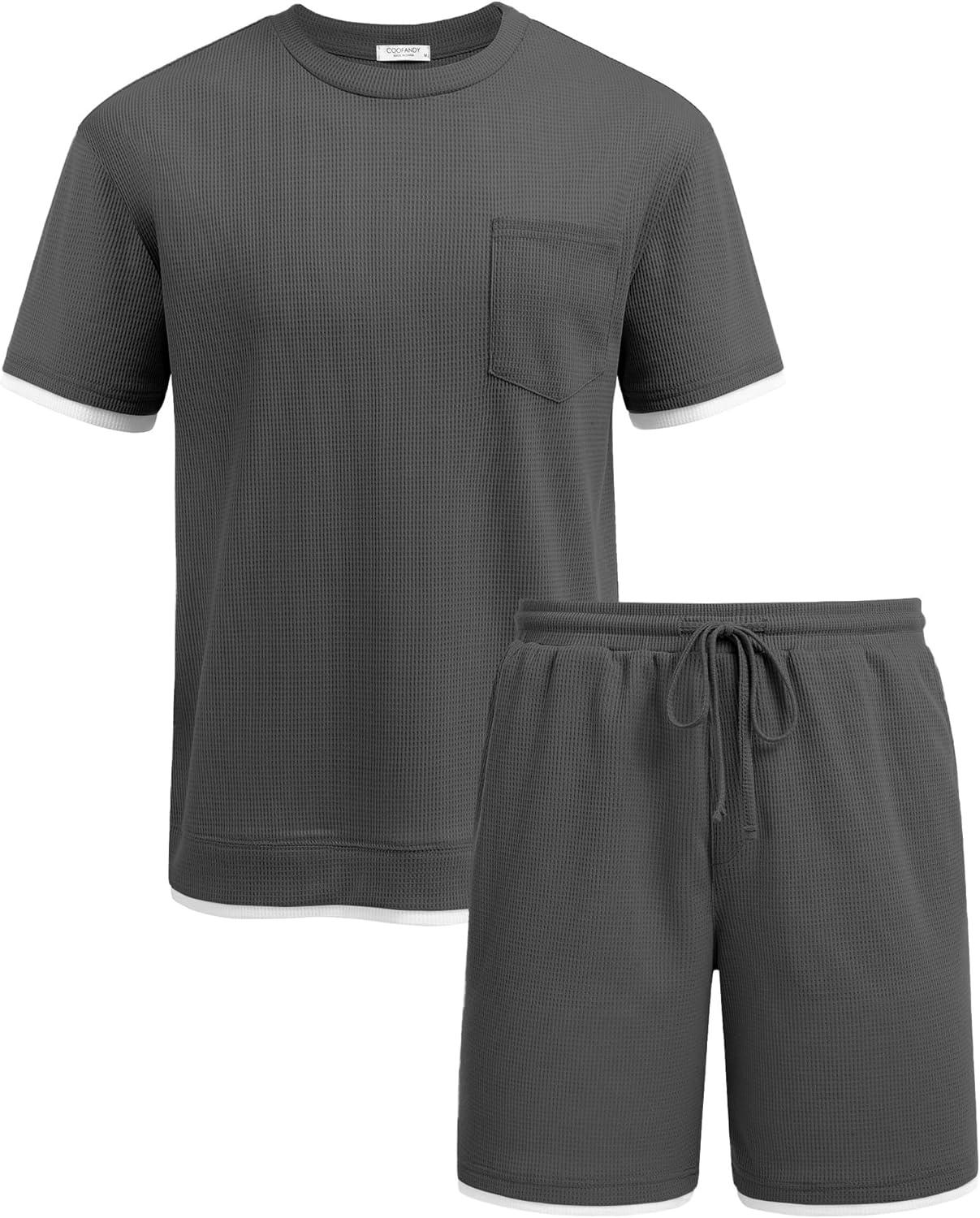 COOFANDY Men’s Waffle Shirt and Shorts Set 2 Piece Outfits Casual Summer Tracksuits Set with Pockets(Dark Grey)