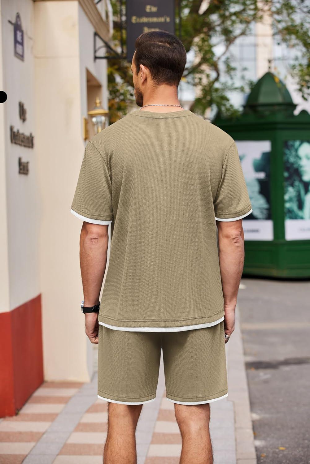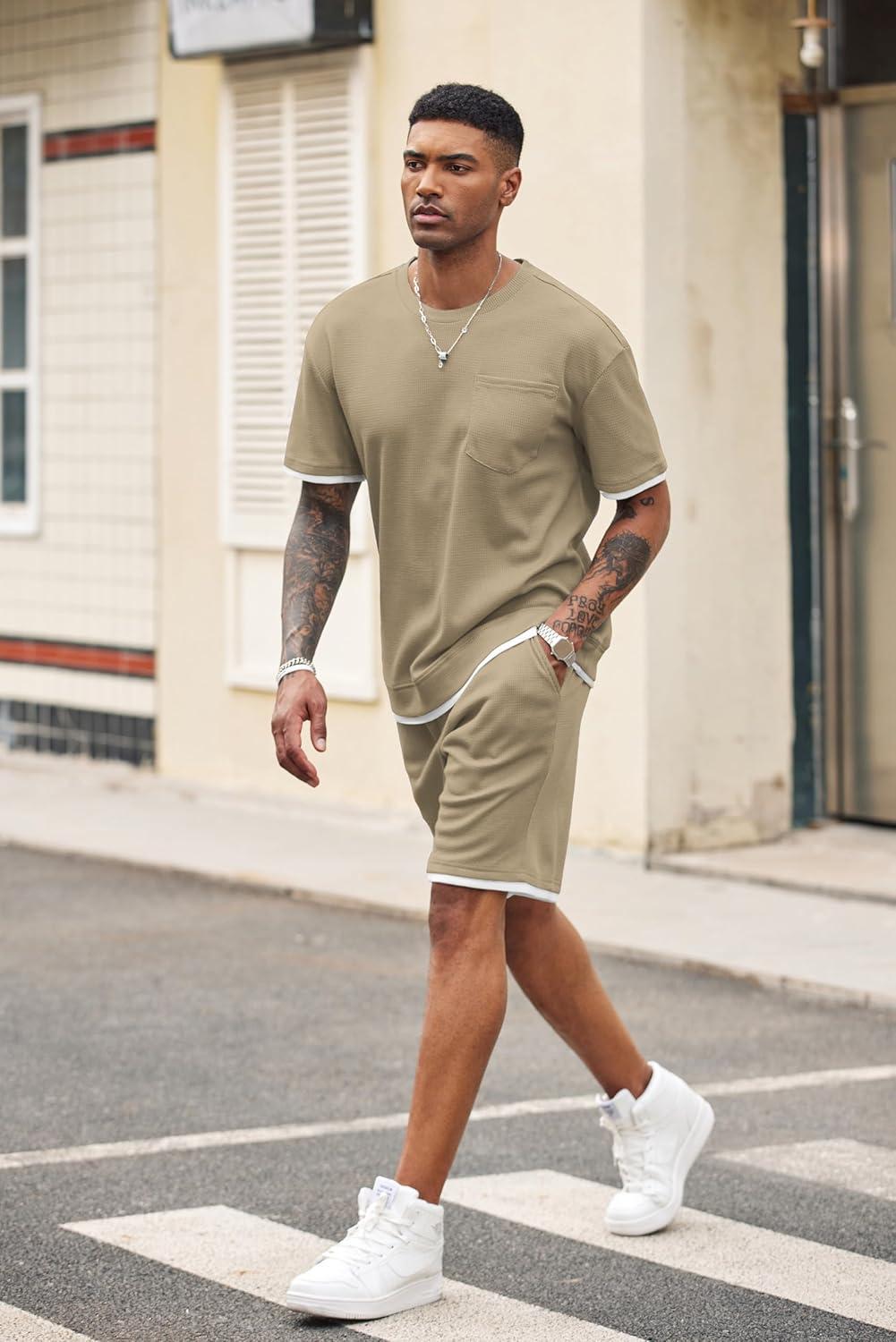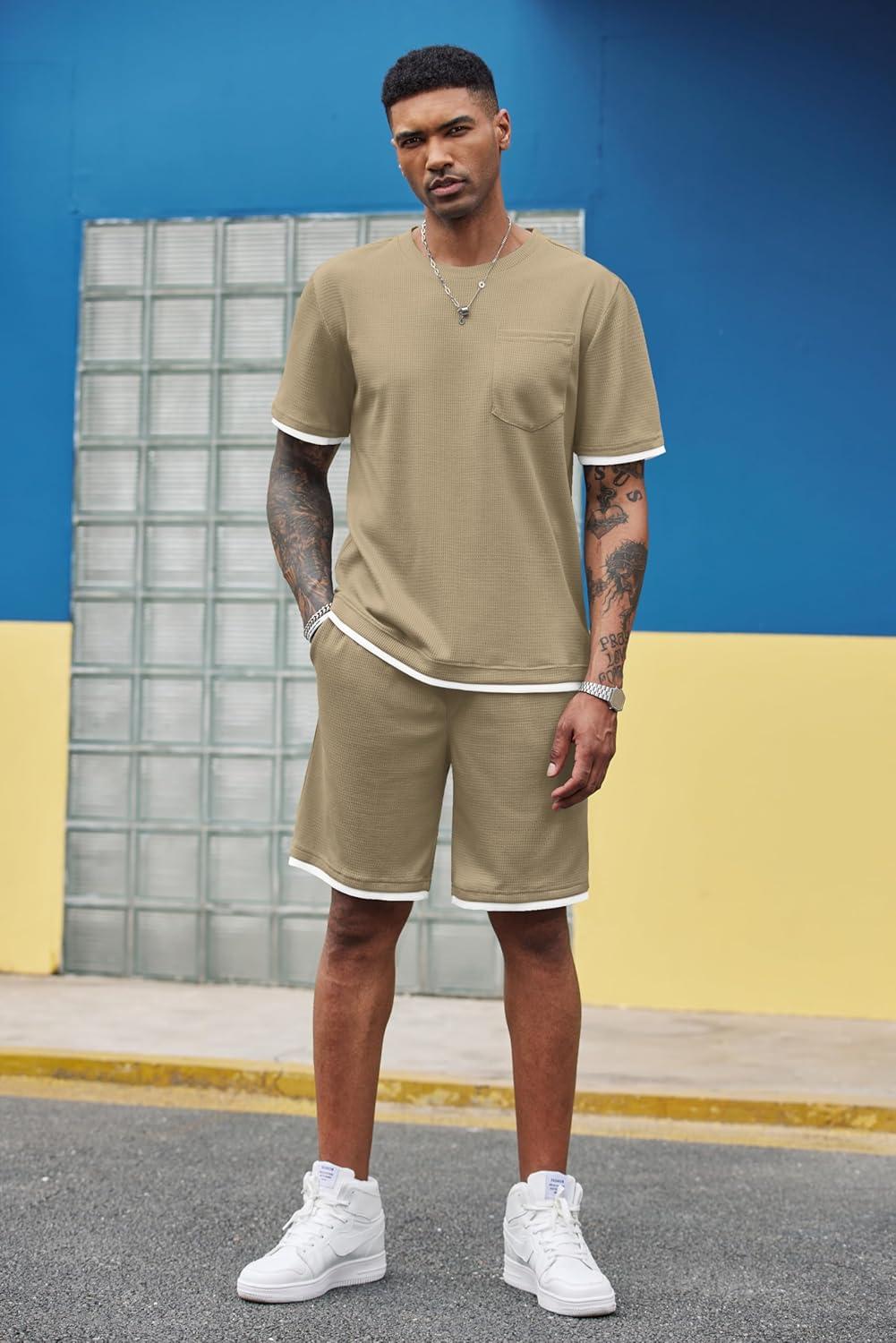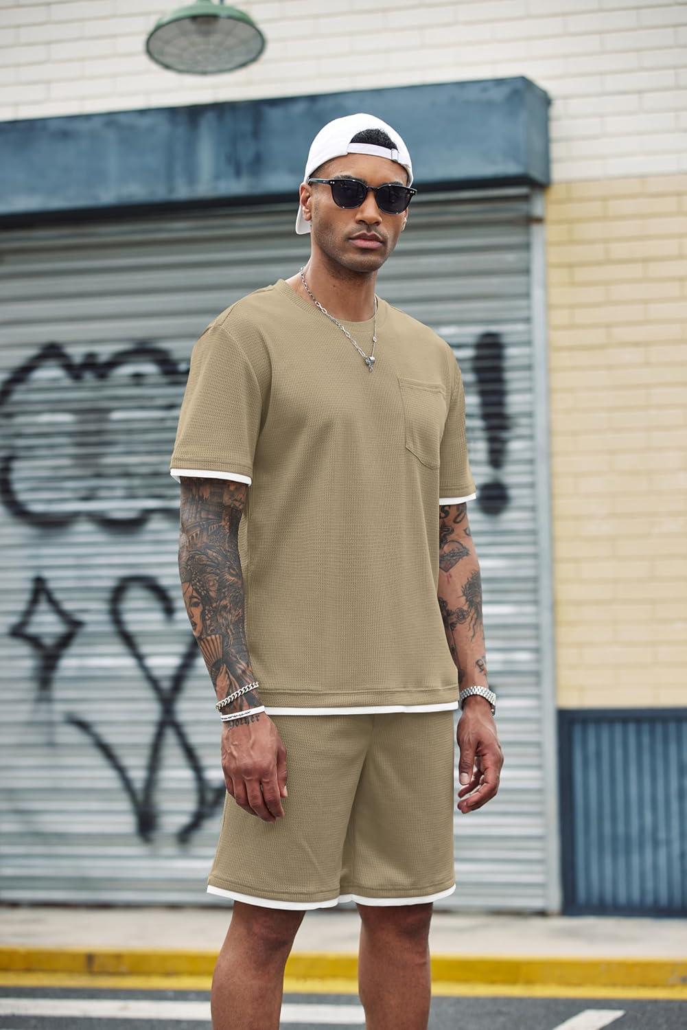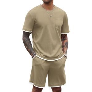 COOFANDY Men’s Waffle Shirt and Shorts Set 2 Piece Outfits Casual Summer Tracksuits Set with Pockets(Khaki)