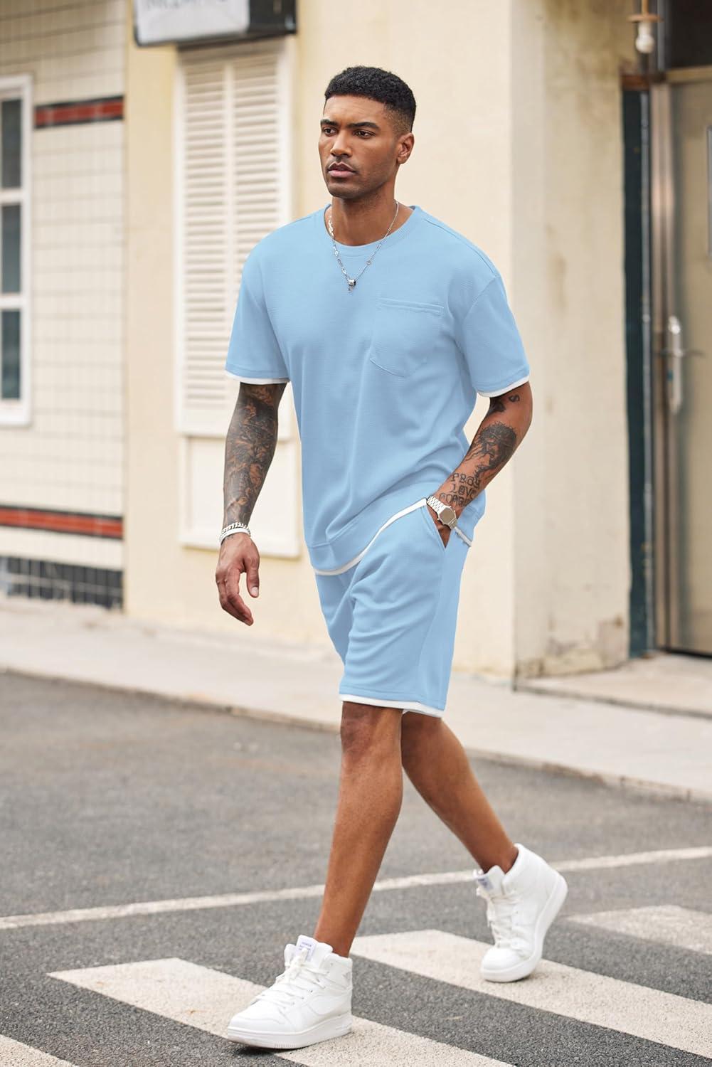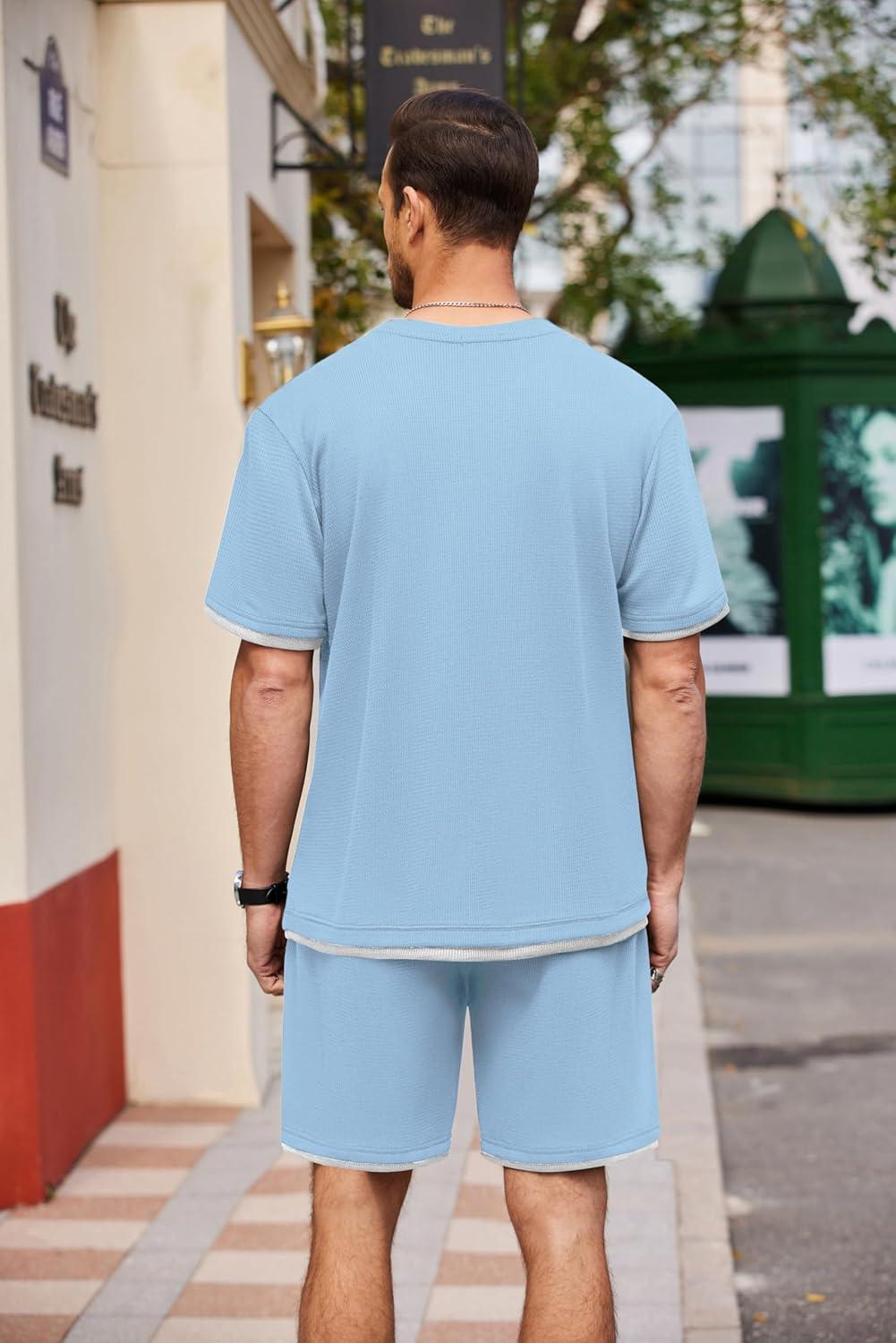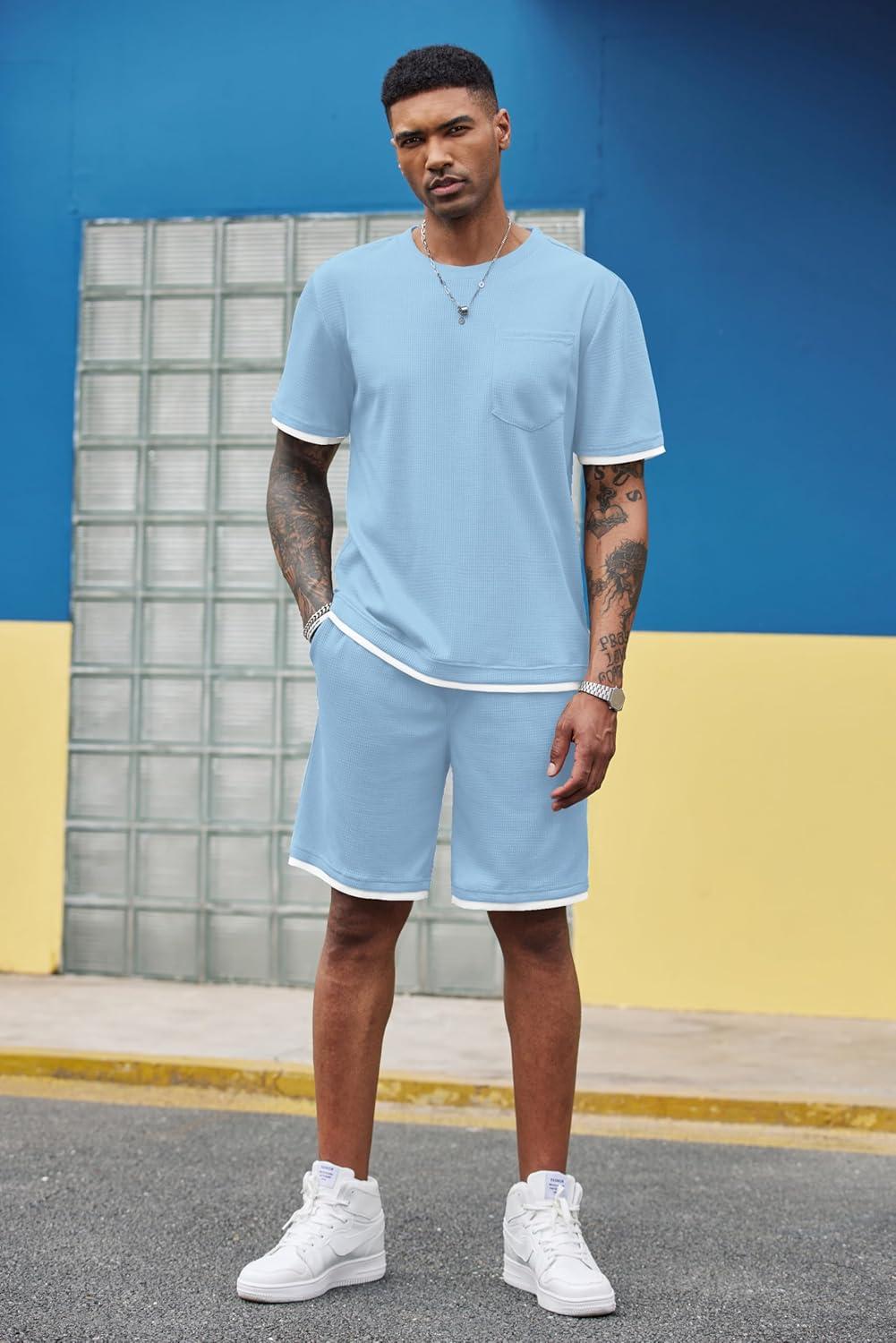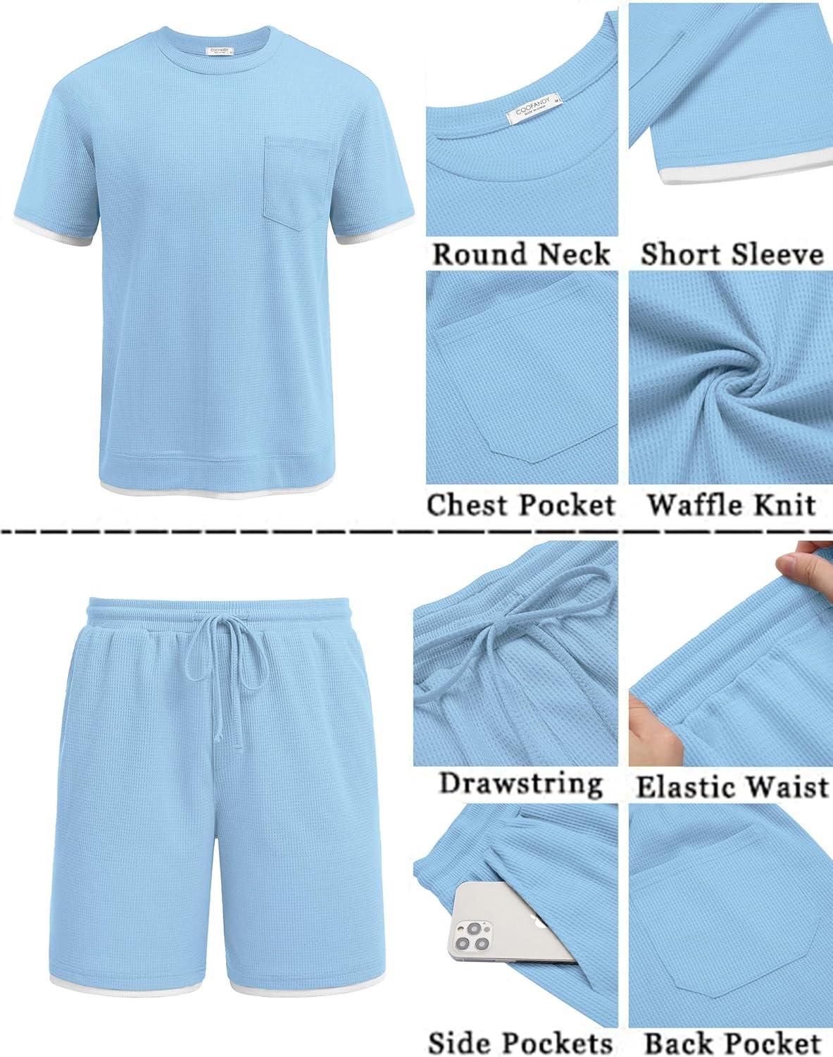 COOFANDY Men’s Waffle Shirt and Shorts Set 2 Piece Outfits Casual Summer Tracksuits Set with Pockets(Light Blue)