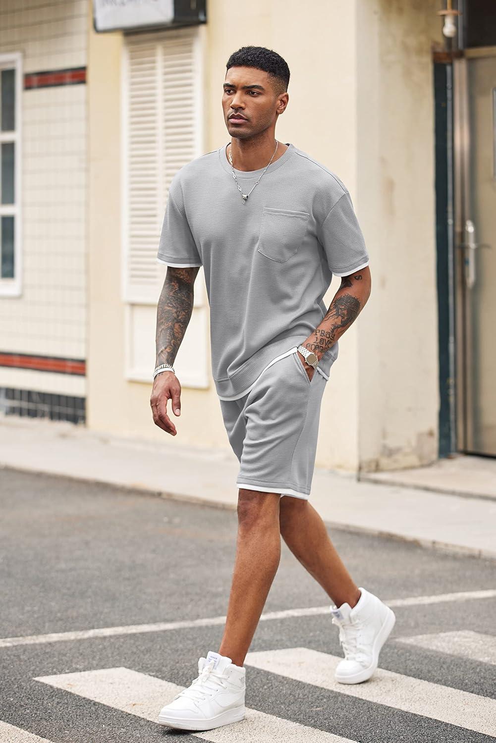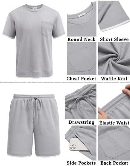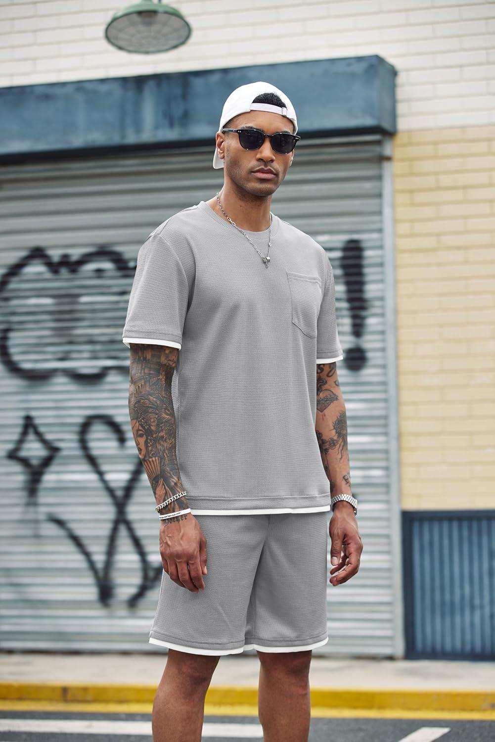 COOFANDY Men’s Waffle Shirt and Shorts Set 2 Piece Outfits Casual Summer Tracksuits Set with Pockets(Light Grey)