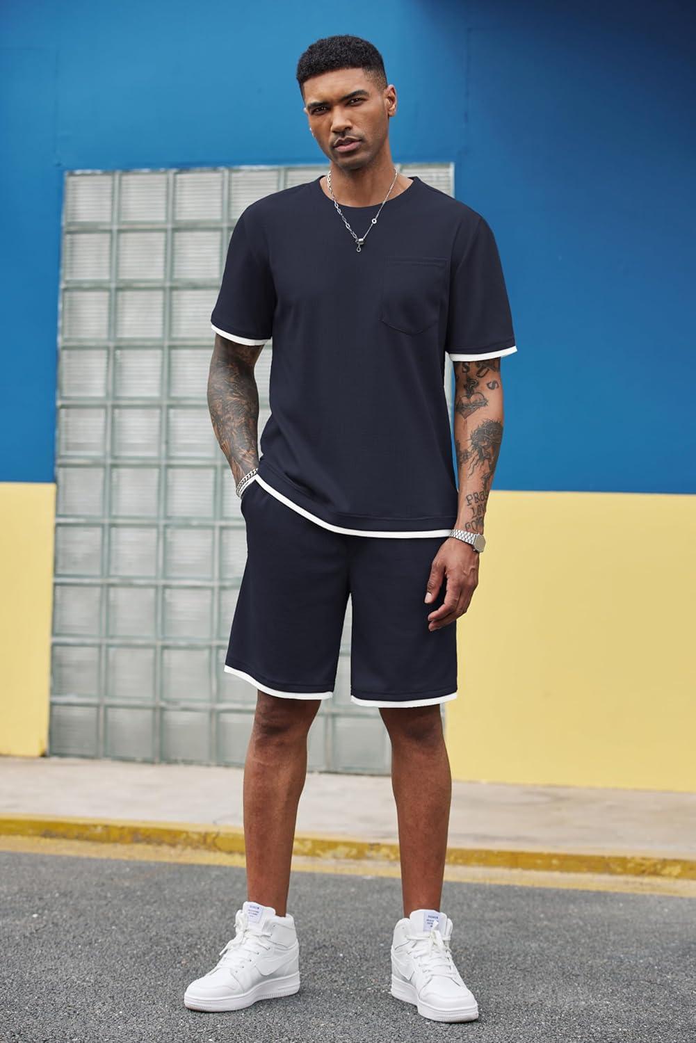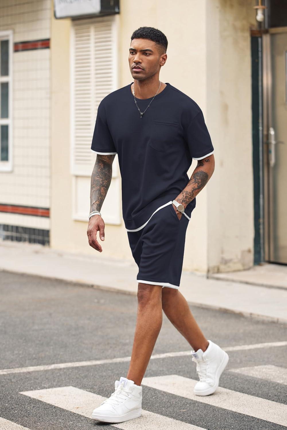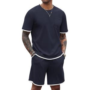 COOFANDY Men’s Waffle Shirt and Shorts Set 2 Piece Outfits Casual Summer Tracksuits Set with Pockets(Navy Blue)