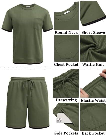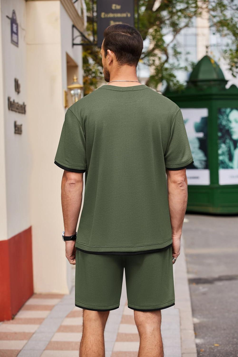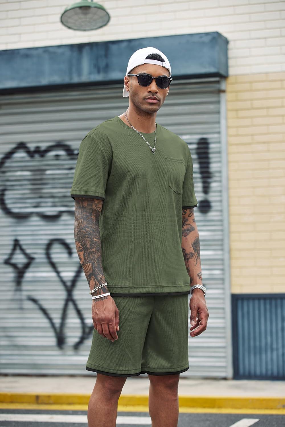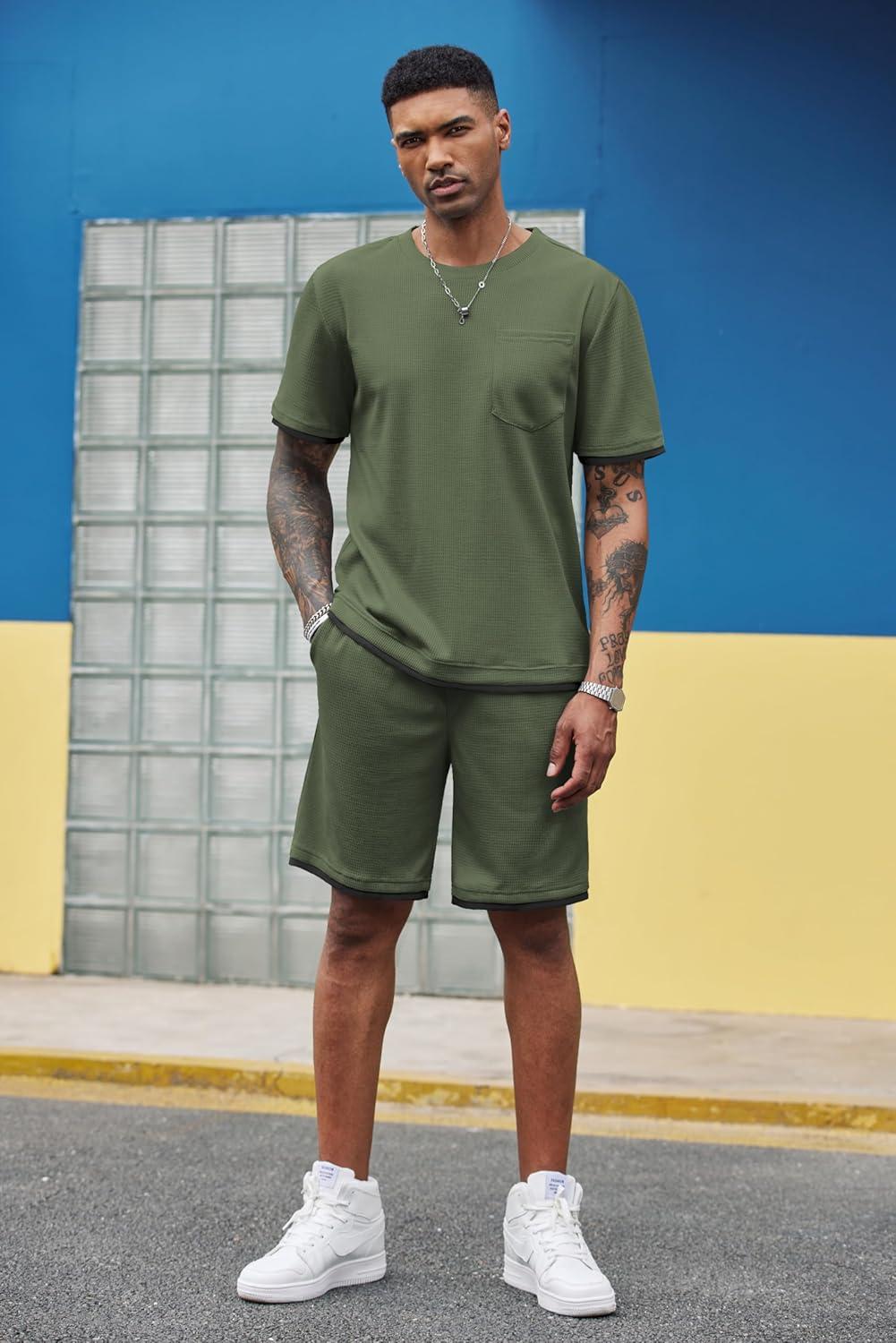 COOFANDY Men’s Waffle Shirt and Shorts Set 2 Piece Outfits Casual Summer Tracksuits Set with Pockets(Olive Green)