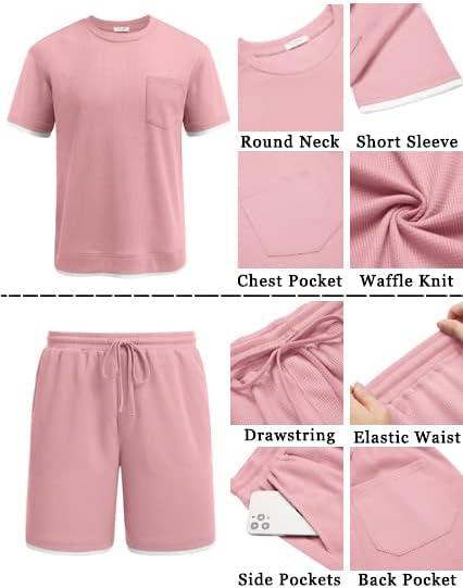 COOFANDY Men’s Waffle Shirt and Shorts Set 2 Piece Outfits Casual Summer Tracksuits Set with Pockets(Pink)