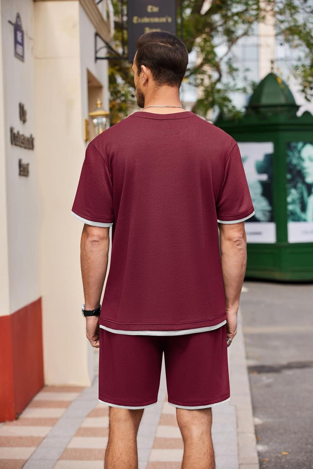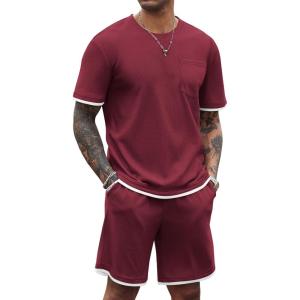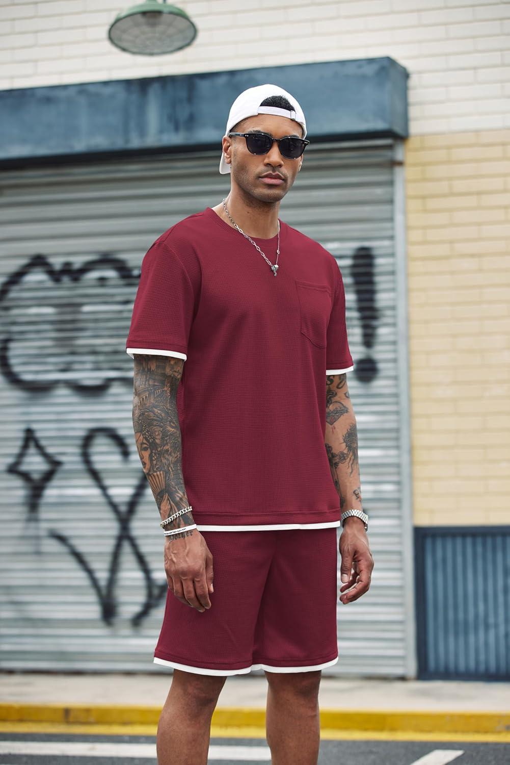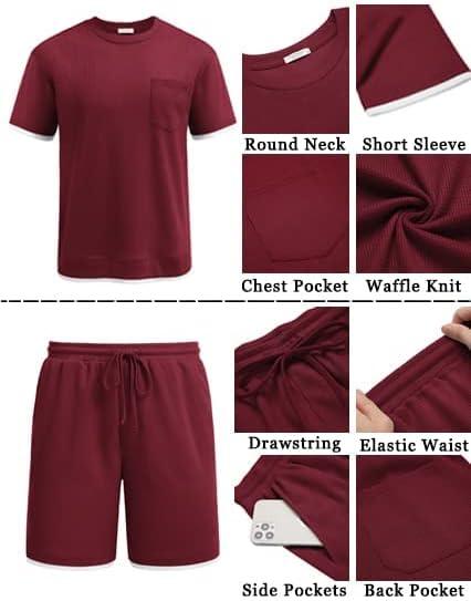 COOFANDY Men’s Waffle Shirt and Shorts Set 2 Piece Outfits Casual Summer Tracksuits Set with Pockets(Wine Red)