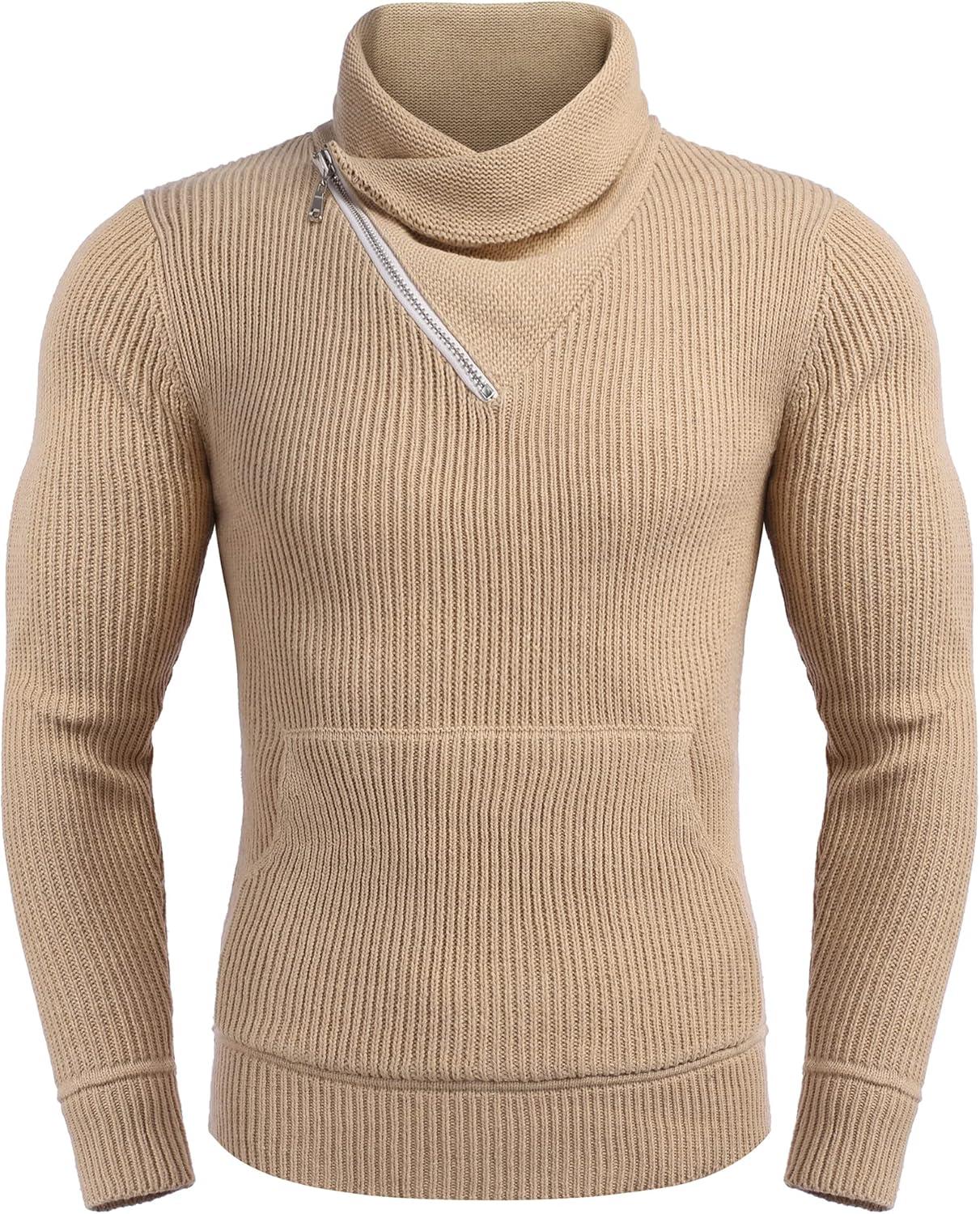 COOFANDY Men’s Knitted Turtleneck Pullover Shawl Collar Sweaters Slim Fit High Neck Hoodies with Pockets(Khaki)
