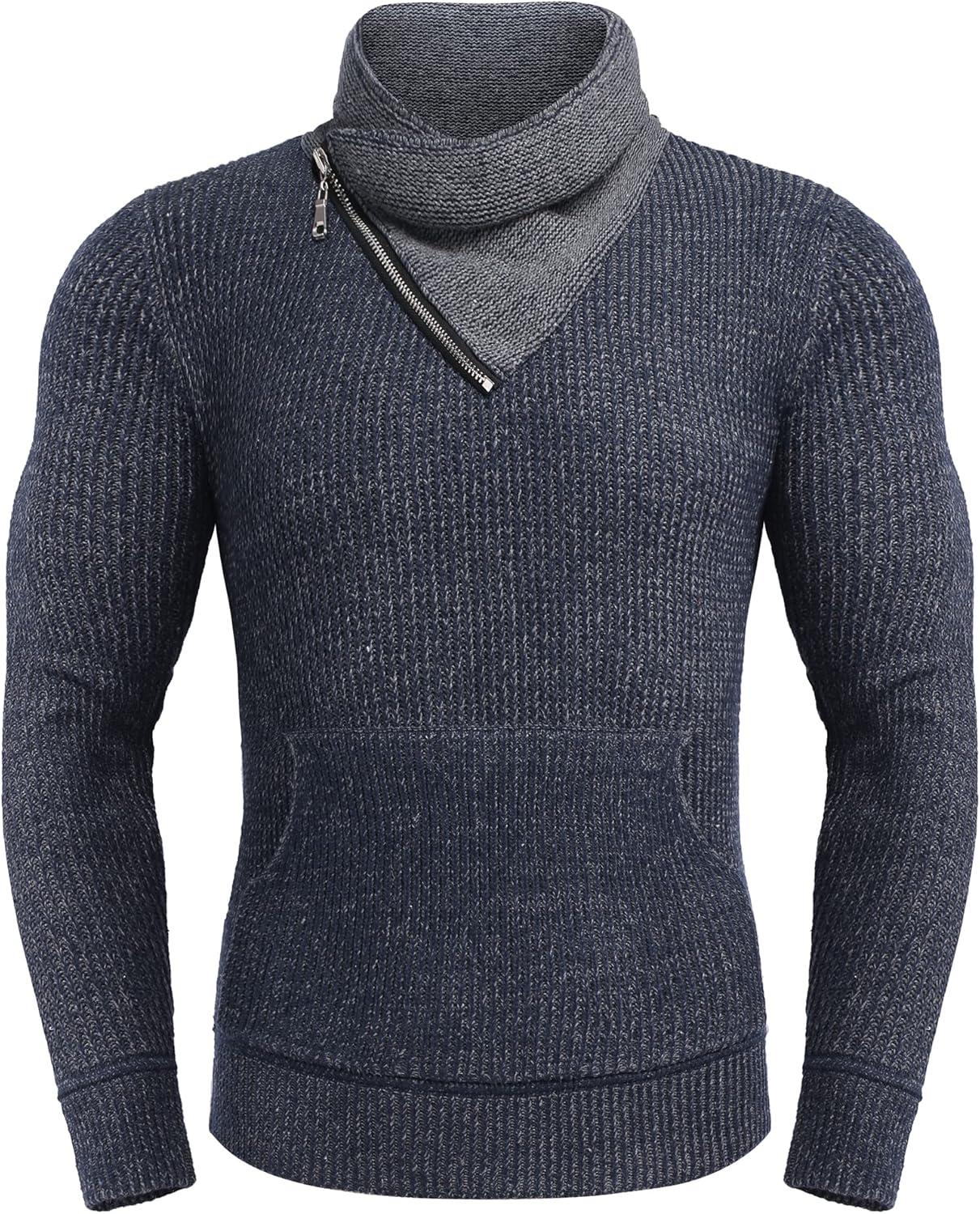 COOFANDY Men’s Knitted Turtleneck Pullover Shawl Collar Sweaters Slim Fit High Neck Hoodies with Pockets(Blue)