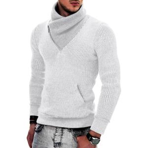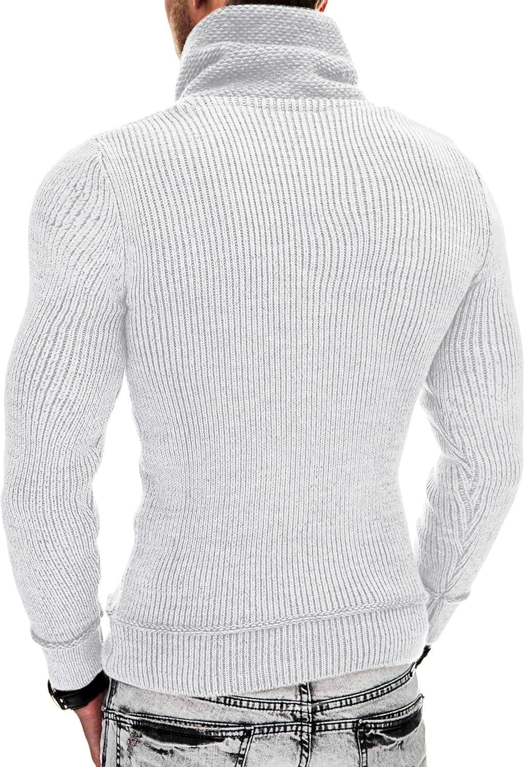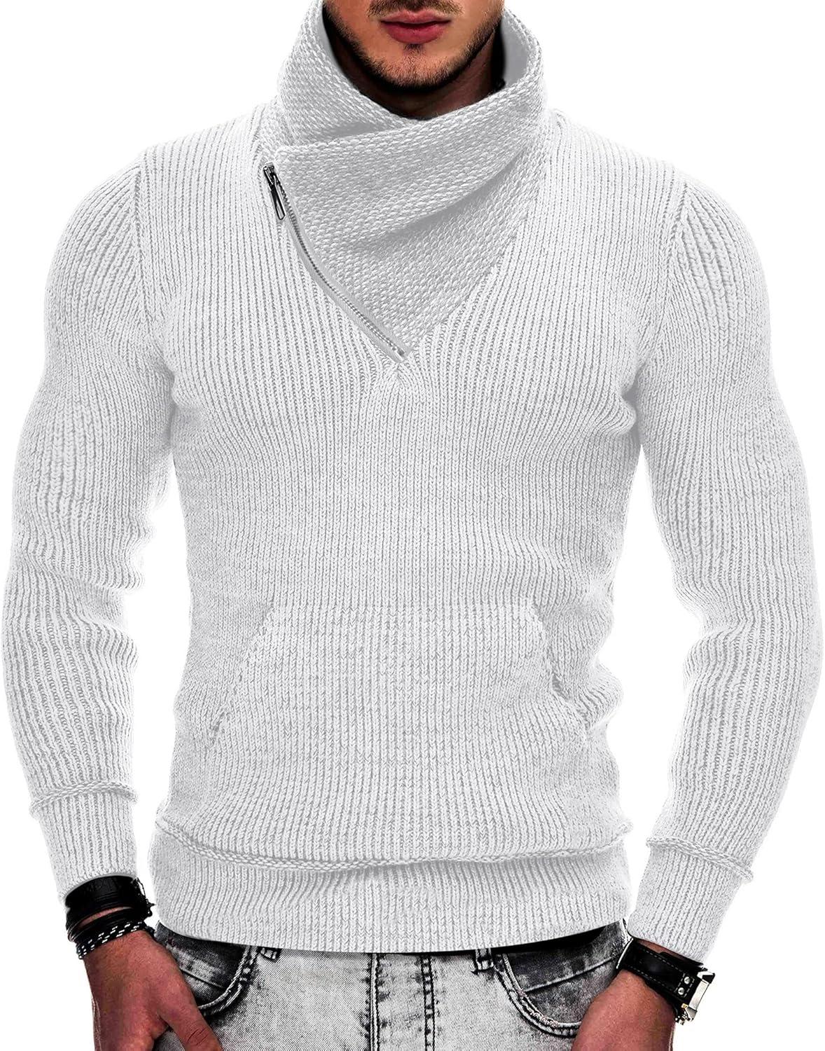 COOFANDY Men’s Knitted Turtleneck Pullover Shawl Collar Sweaters Slim Fit High Neck Hoodies with Pockets(White)