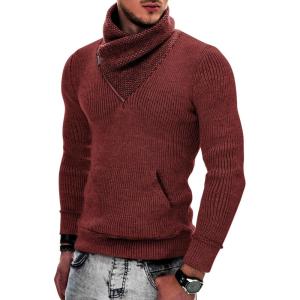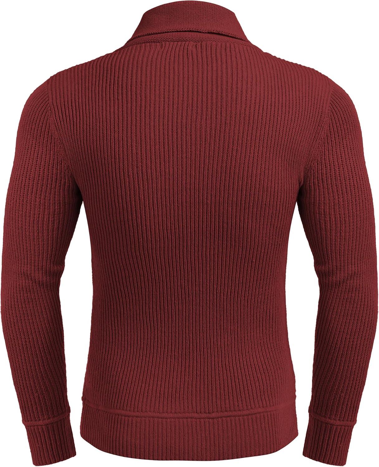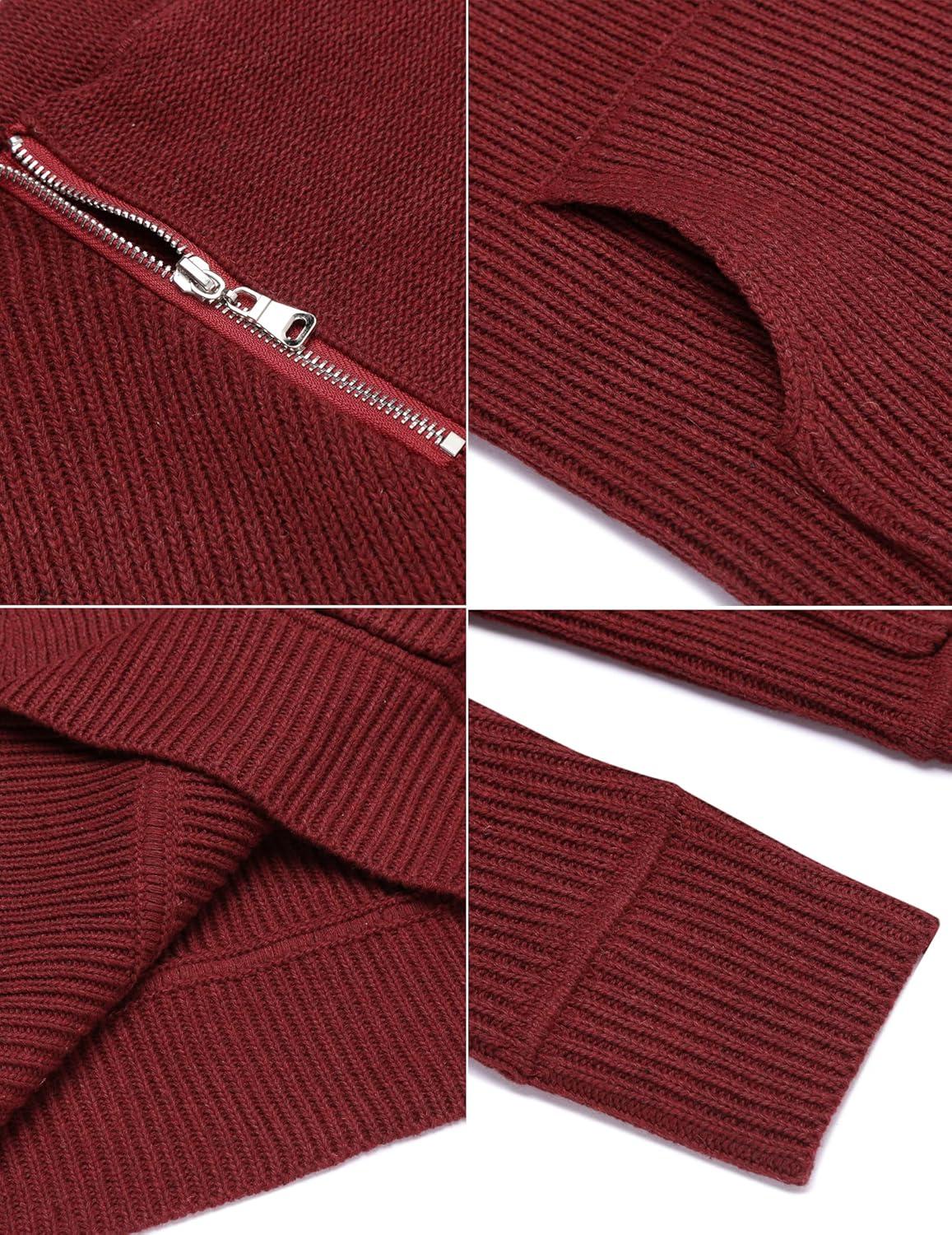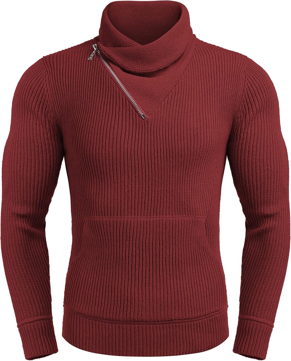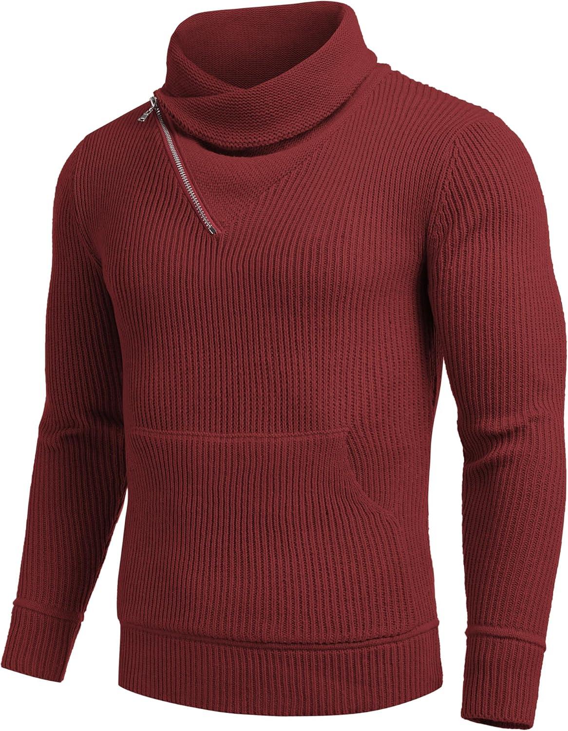 COOFANDY Men’s Knitted Turtleneck Pullover Shawl Collar Sweaters Slim Fit High Neck Hoodies with Pockets(Wine Red)