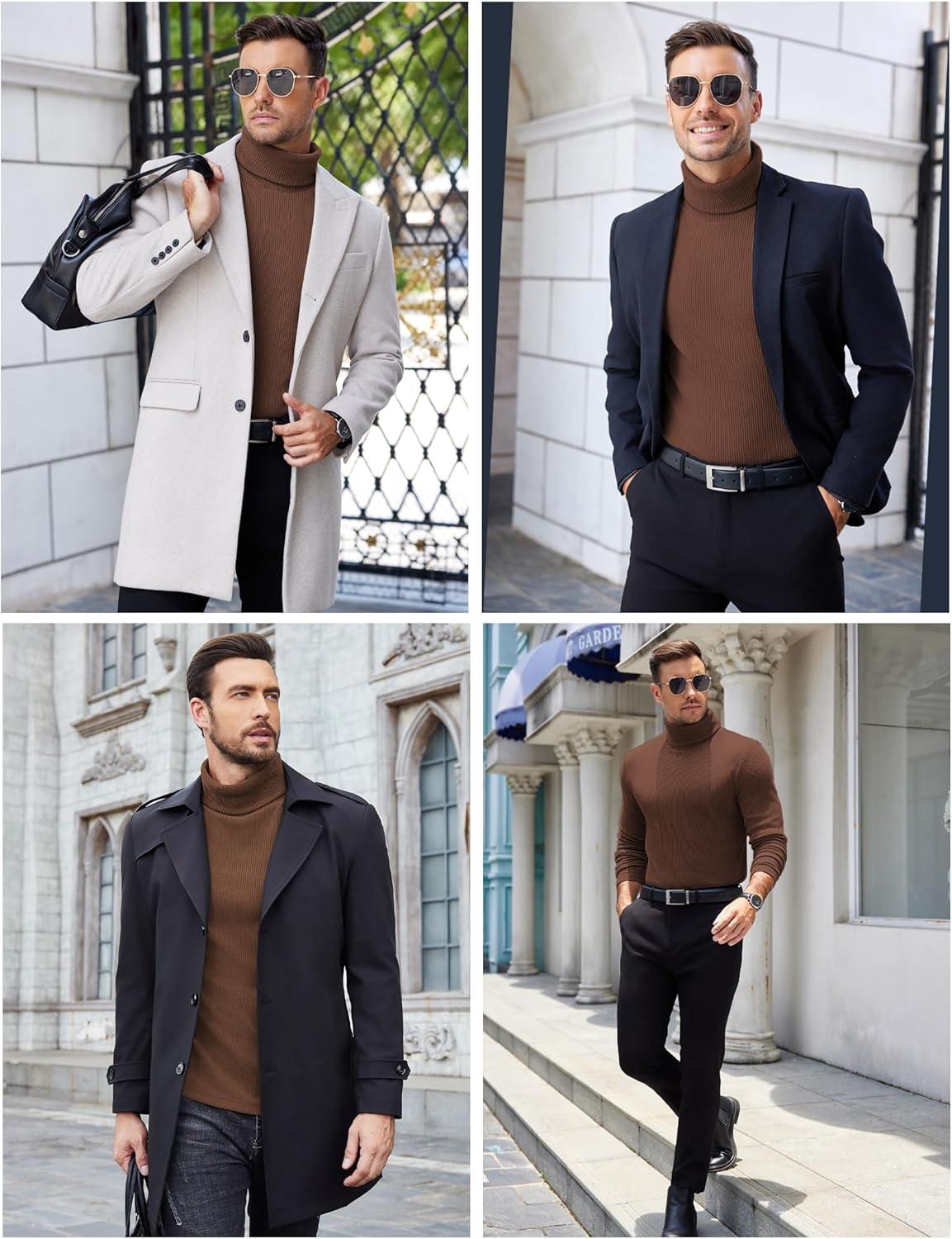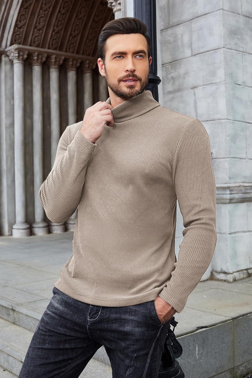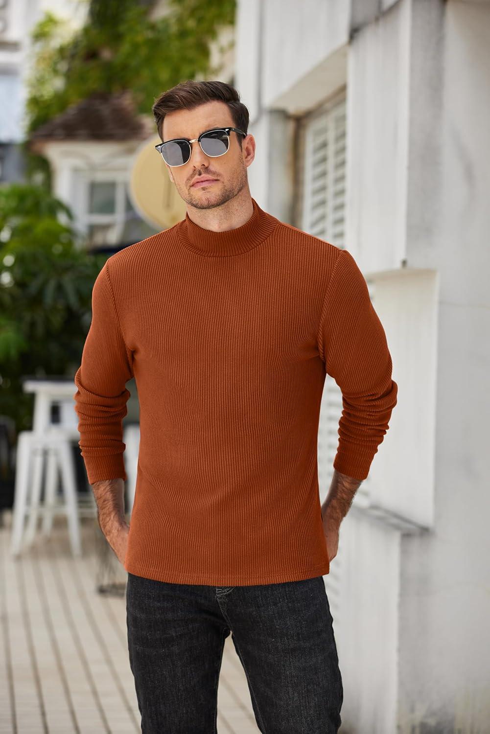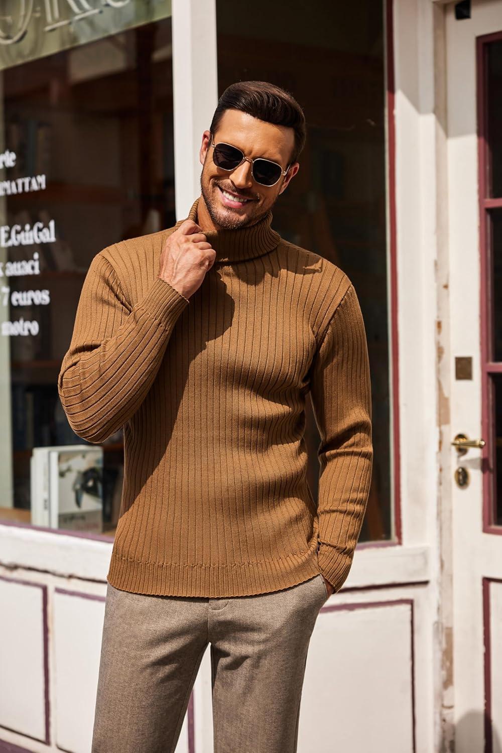 COOFANDY Men’s Turtleneck Sweater Slim Fit Lightweight Basic Ribbed Sweaters(Brown)