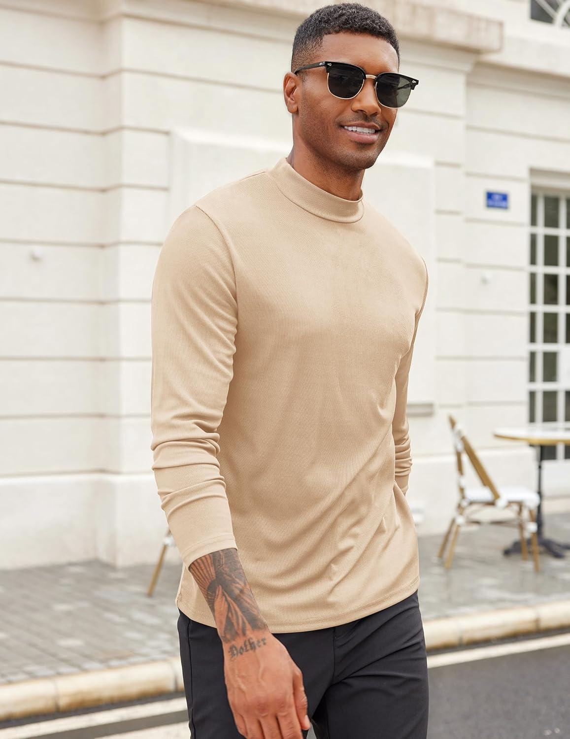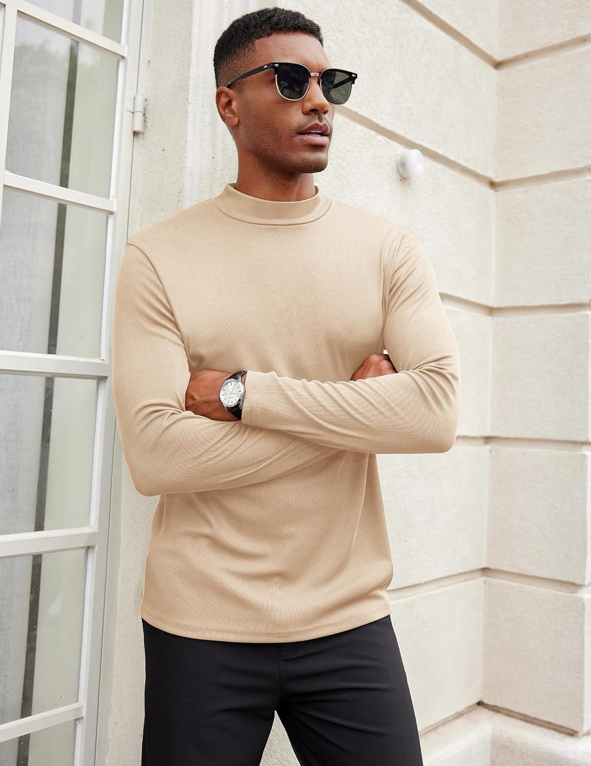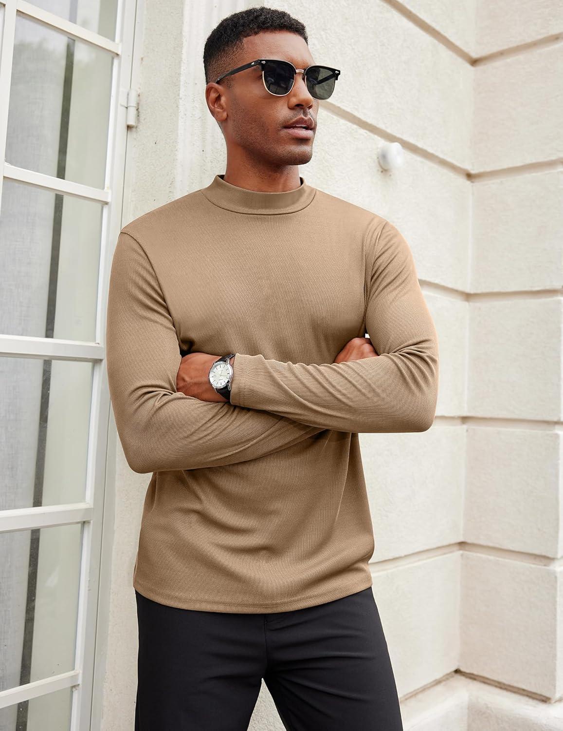 COOFANDY Men’s Mock Turtleneck Long Sleeve Shirts Slim Fit Basic T-Shirt Lightweight Ribbed Pullover Sweater(1 Pack-khaki)