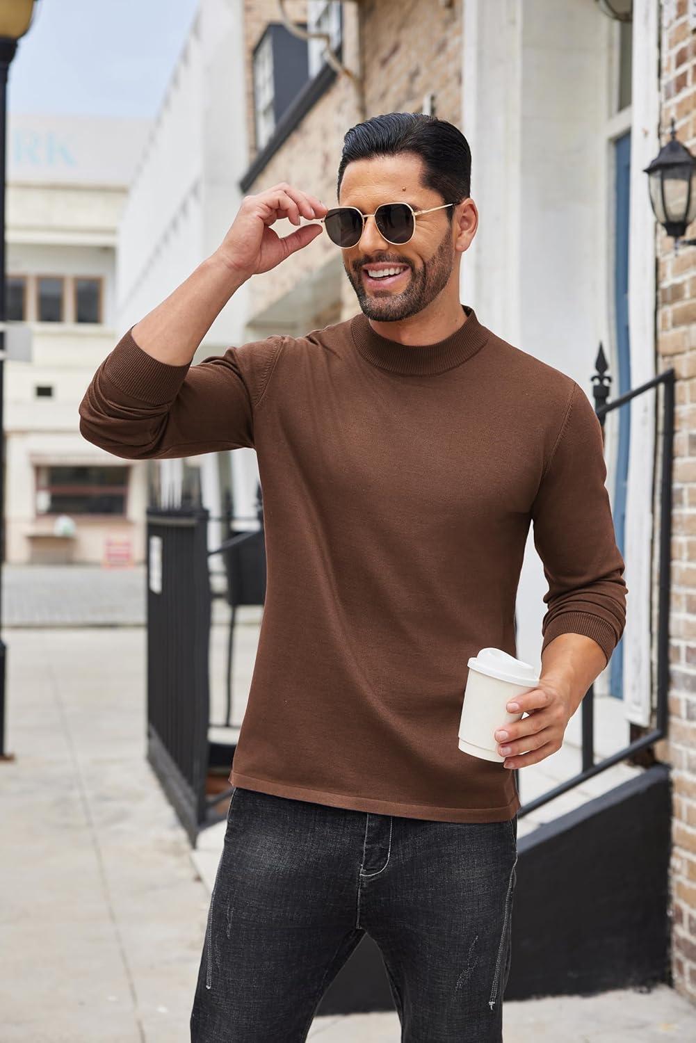 COOFANDY Men’s Slim Fit Mock Turtleneck Pullover Sweater Casual Basic Knitted Thermal Sweaters(Brown)