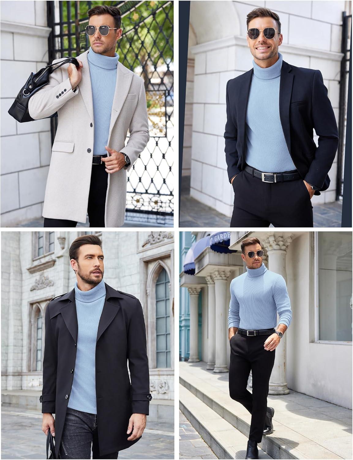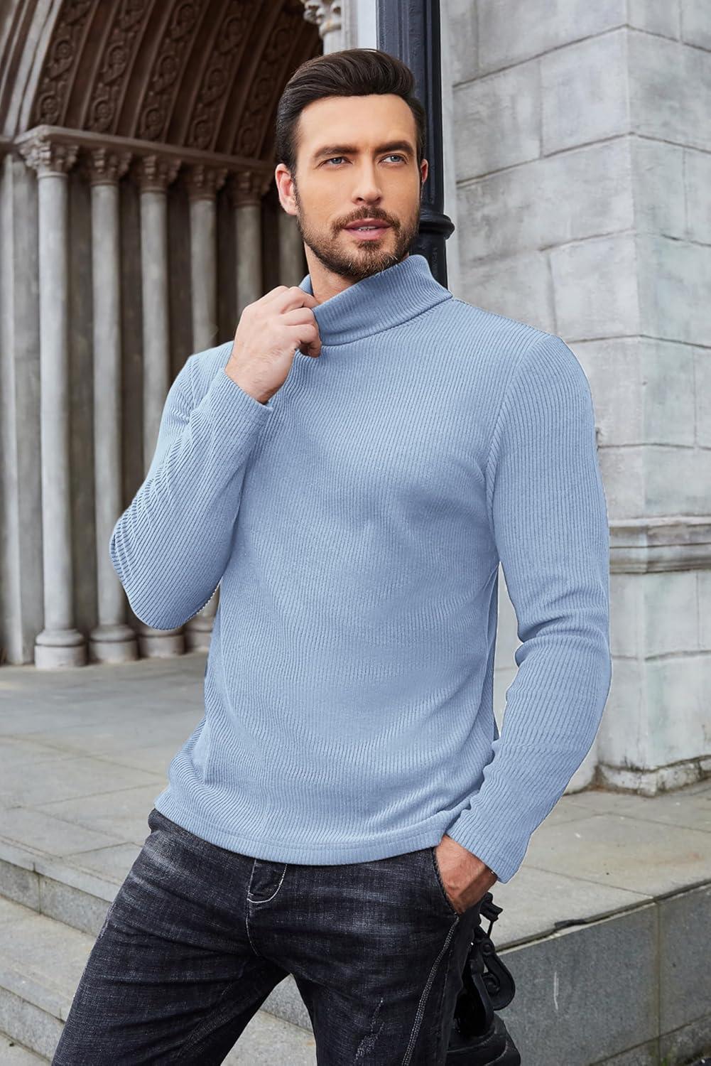 COOFANDY Men’s Slim Fit Turtleneck Sweater Casual Pullover Sweater Lightweight Ribbed Sweater(Light Blue)
