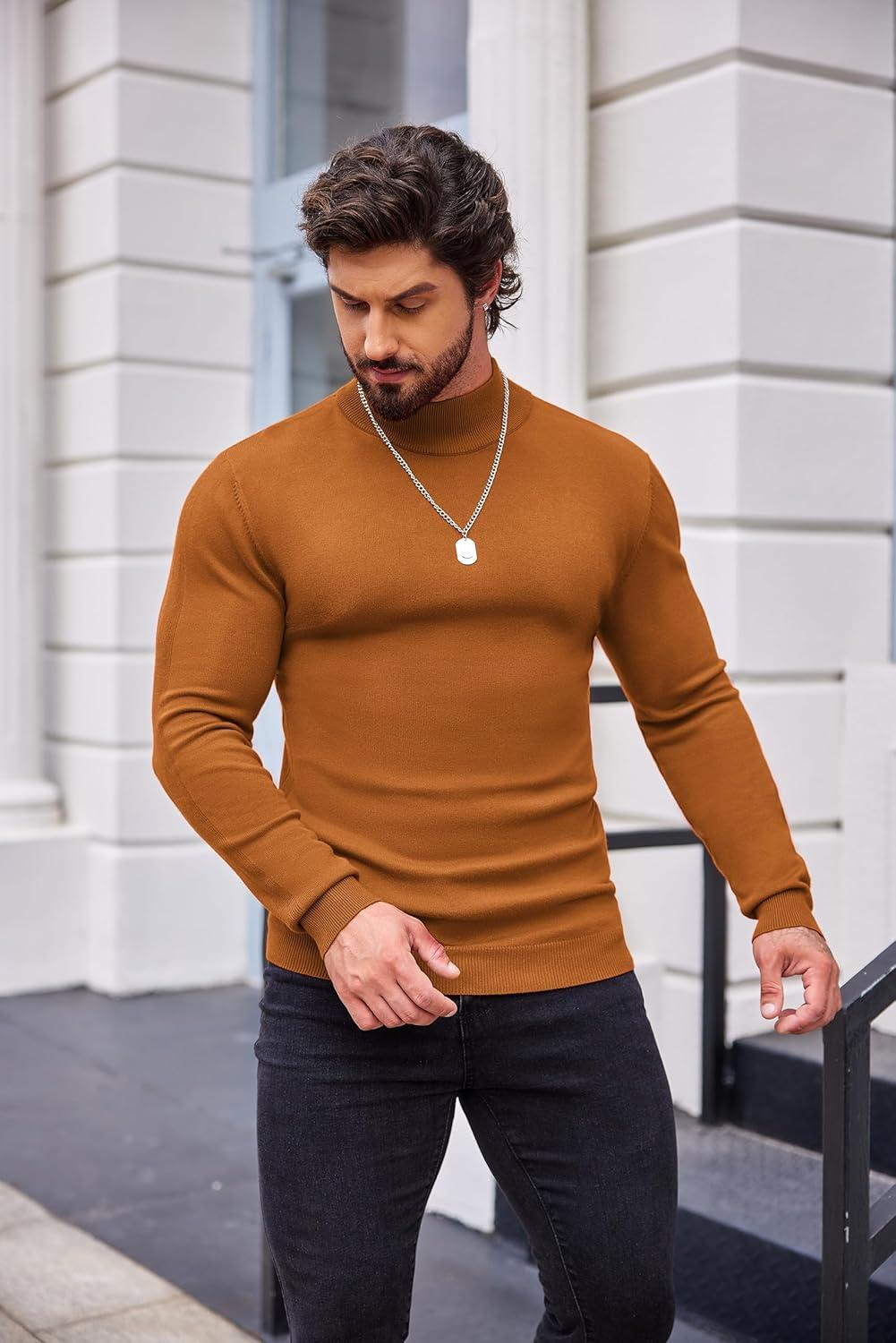 COOFANDY Men’s Slim Fit Mock Turtleneck Pullover Sweater Casual Basic Knitted Thermal Sweaters(Caramel)