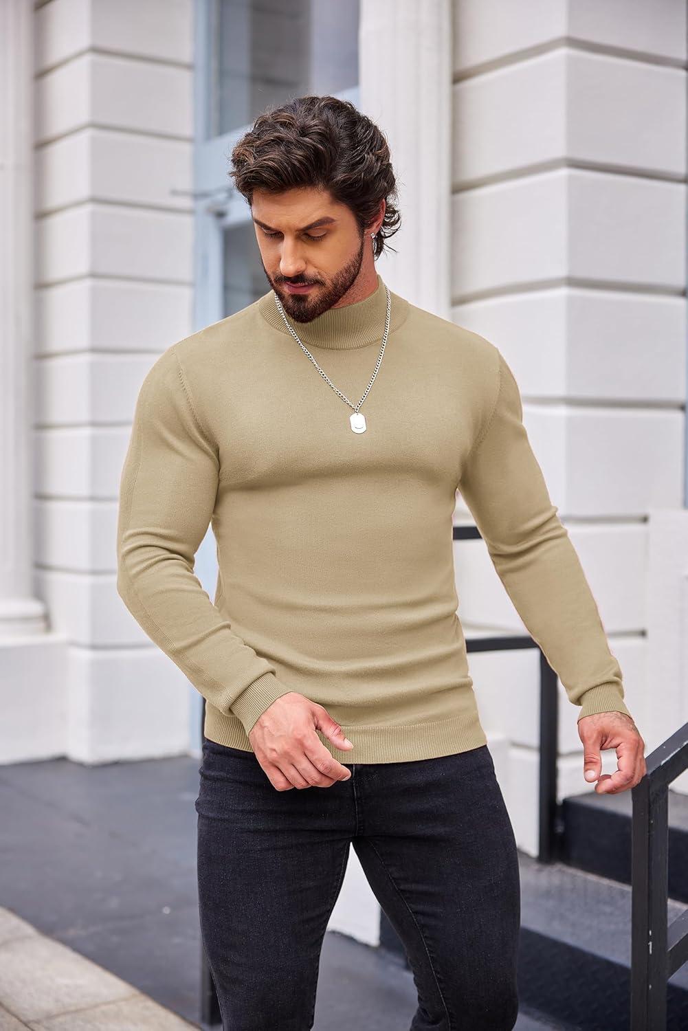COOFANDY Men’s Slim Fit Mock Turtleneck Pullover Sweater Casual Basic Knitted Thermal Sweaters(Khaki)