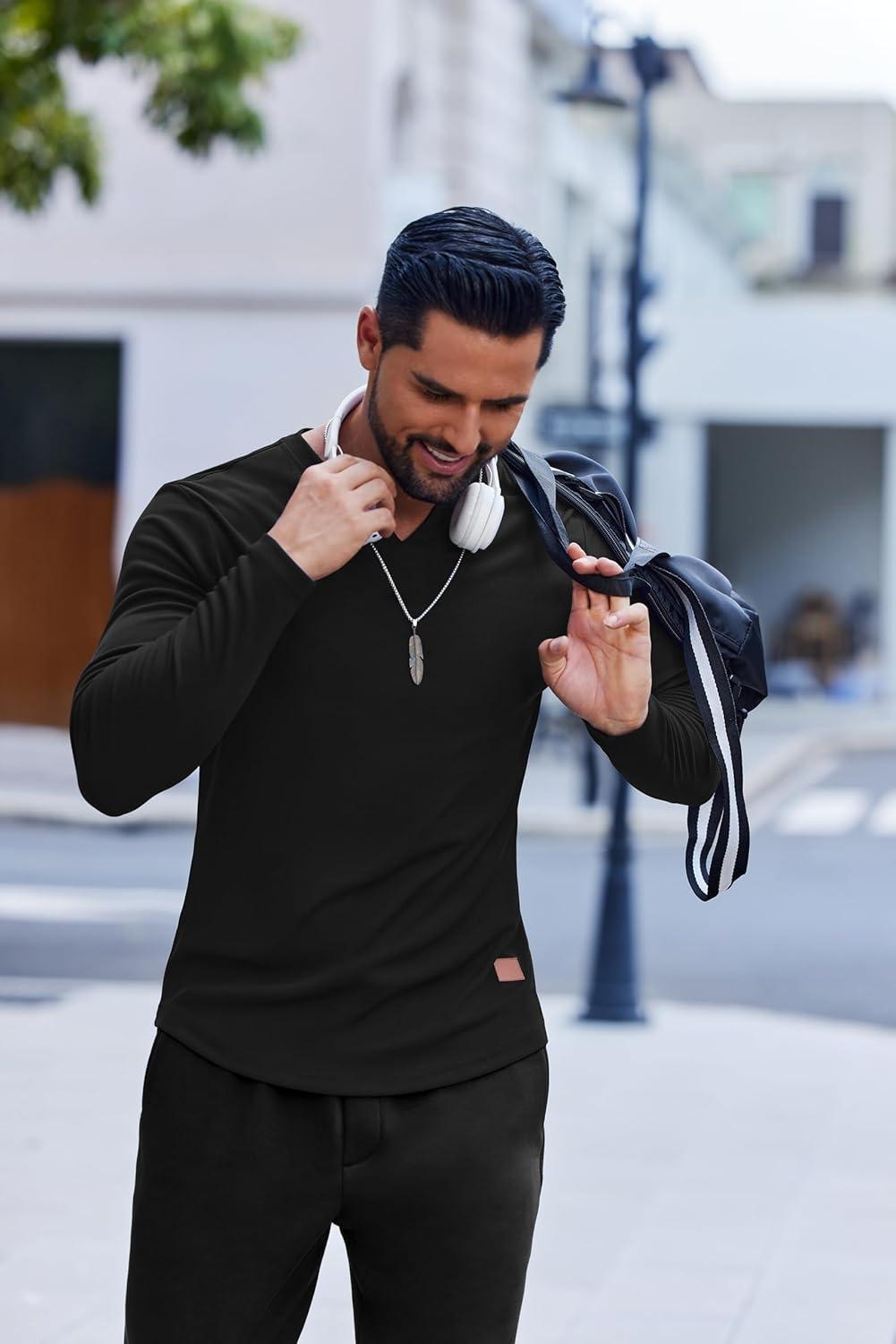 COOFANDY Men’s Long Sleeve Muscle T Shirts Casual V-Neck Slim Fit Longline Ribbed Shirts Stretch Tee Shirts(All Black)