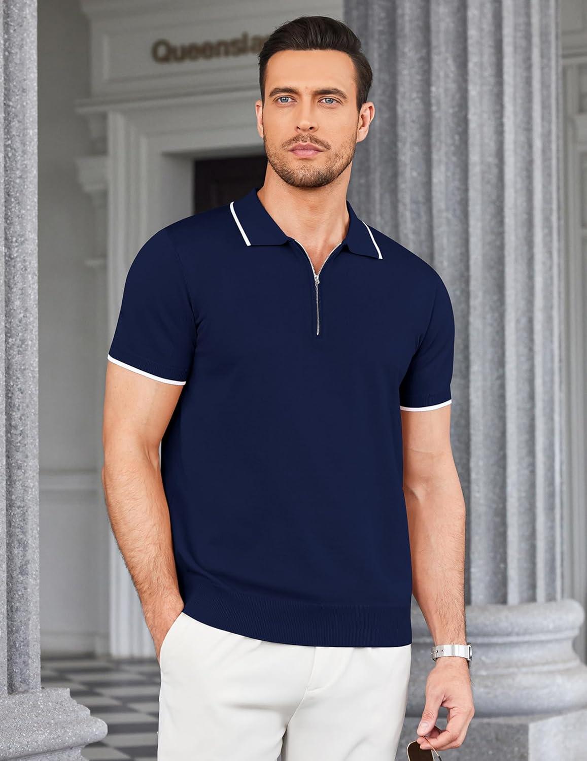 COOFANDY Men’s Zipper Polo Shirt Casual Knit Short Sleeve Polo T Shirt Classic Fit Shirts(Navy Blue-white)