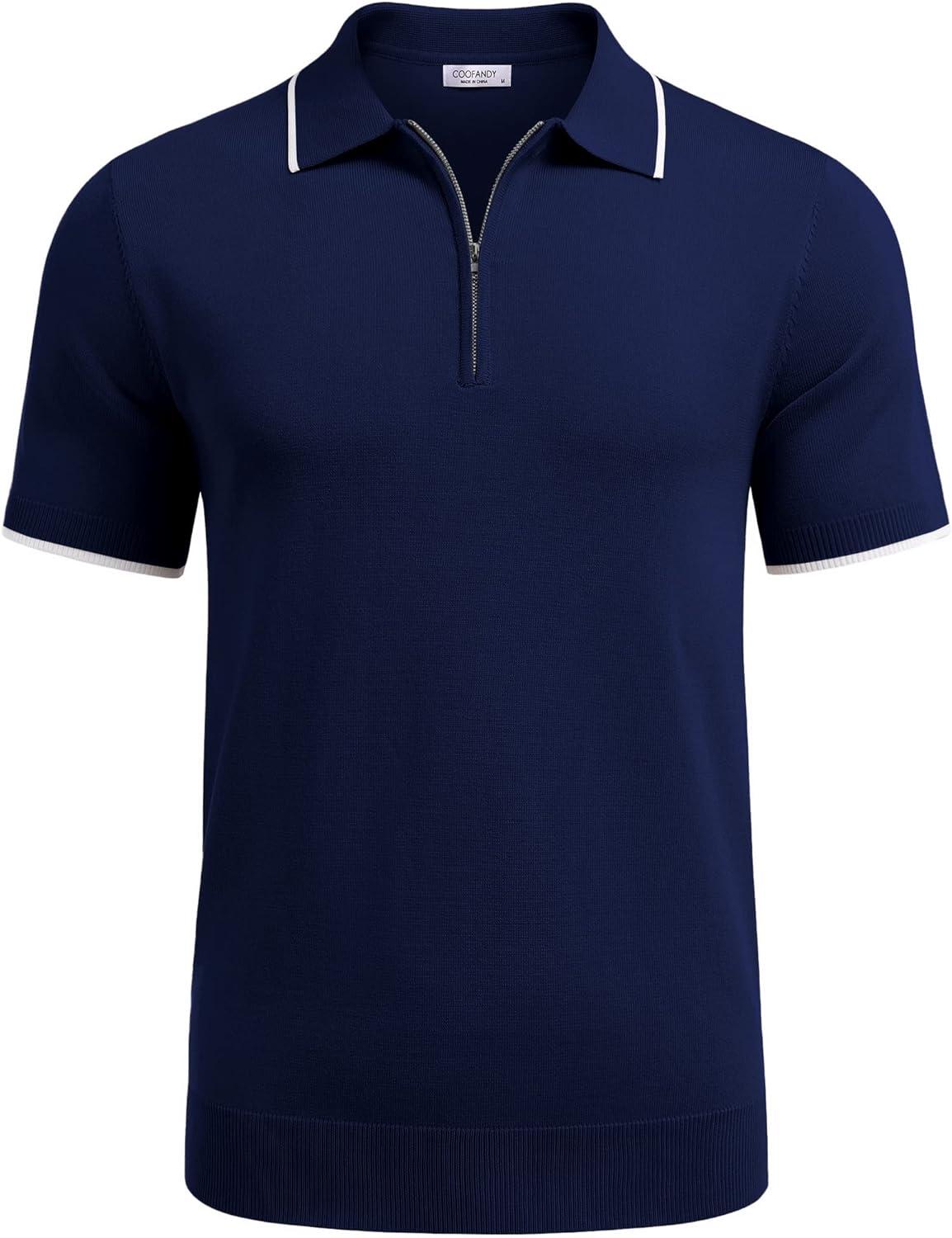 COOFANDY Men’s Zipper Polo Shirt Casual Knit Short Sleeve Polo T Shirt Classic Fit Shirts(Navy Blue)