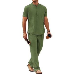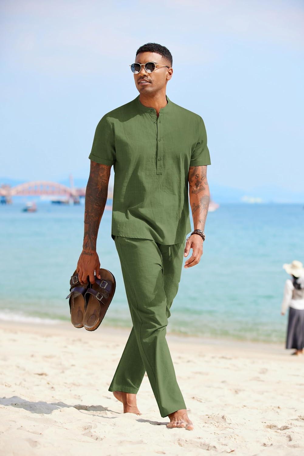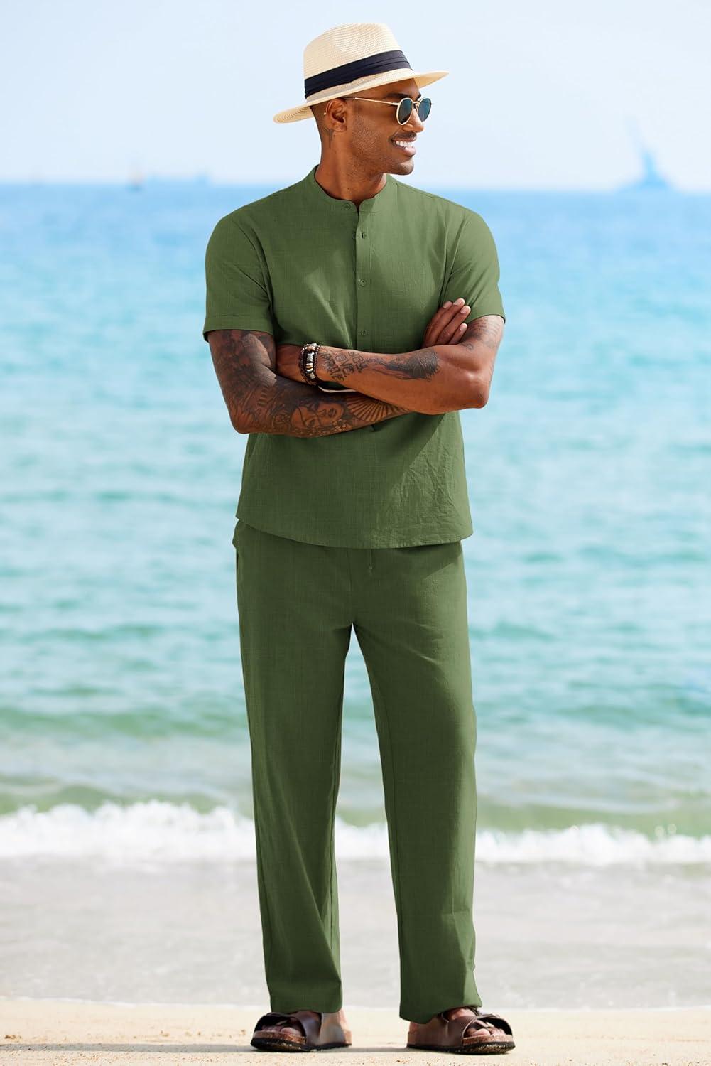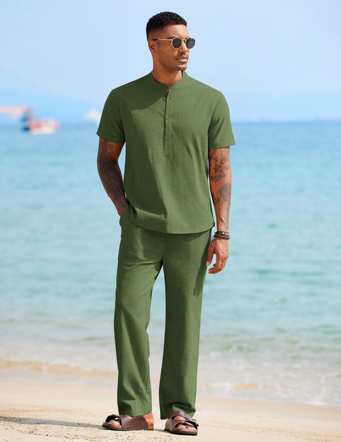 COOFANDY Mens 2 Pieces Cotton Linen Sets Short Sleeve Casual Henley Shirt Summer Beach Pants Lounge Vacation Outfits Set(Army Green)