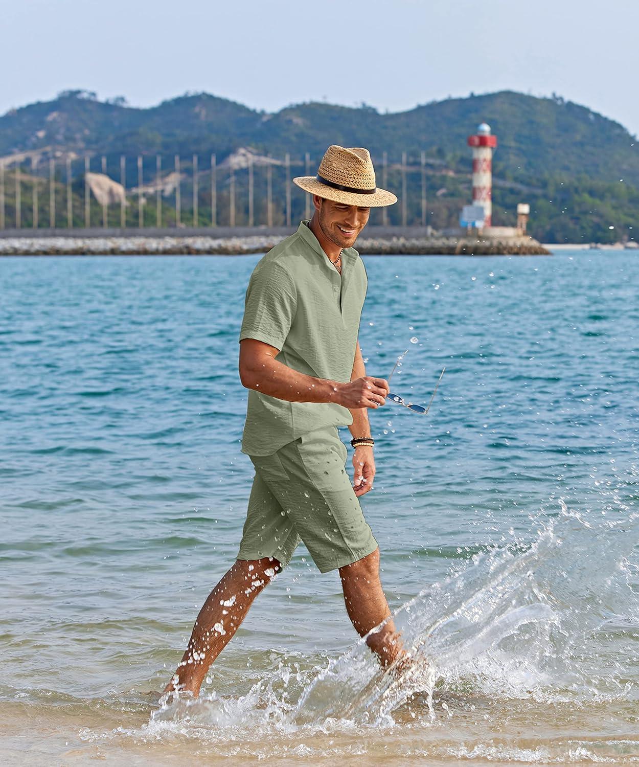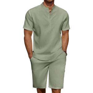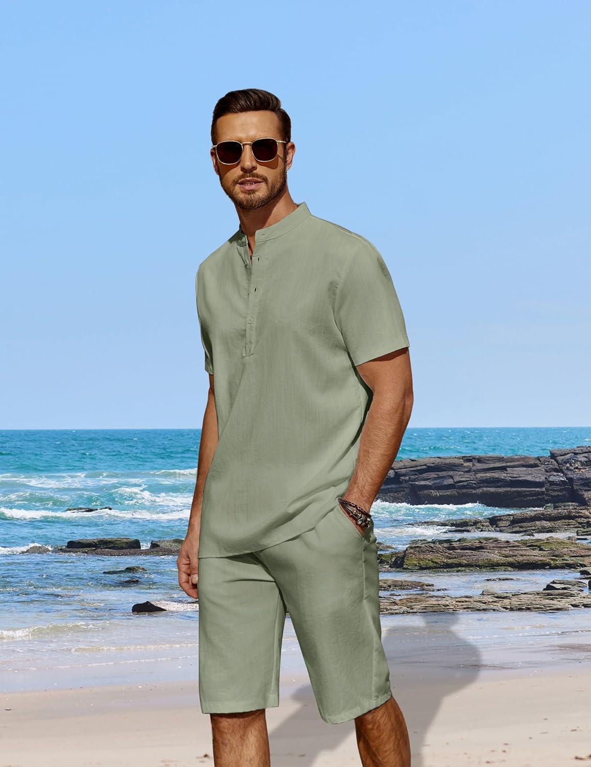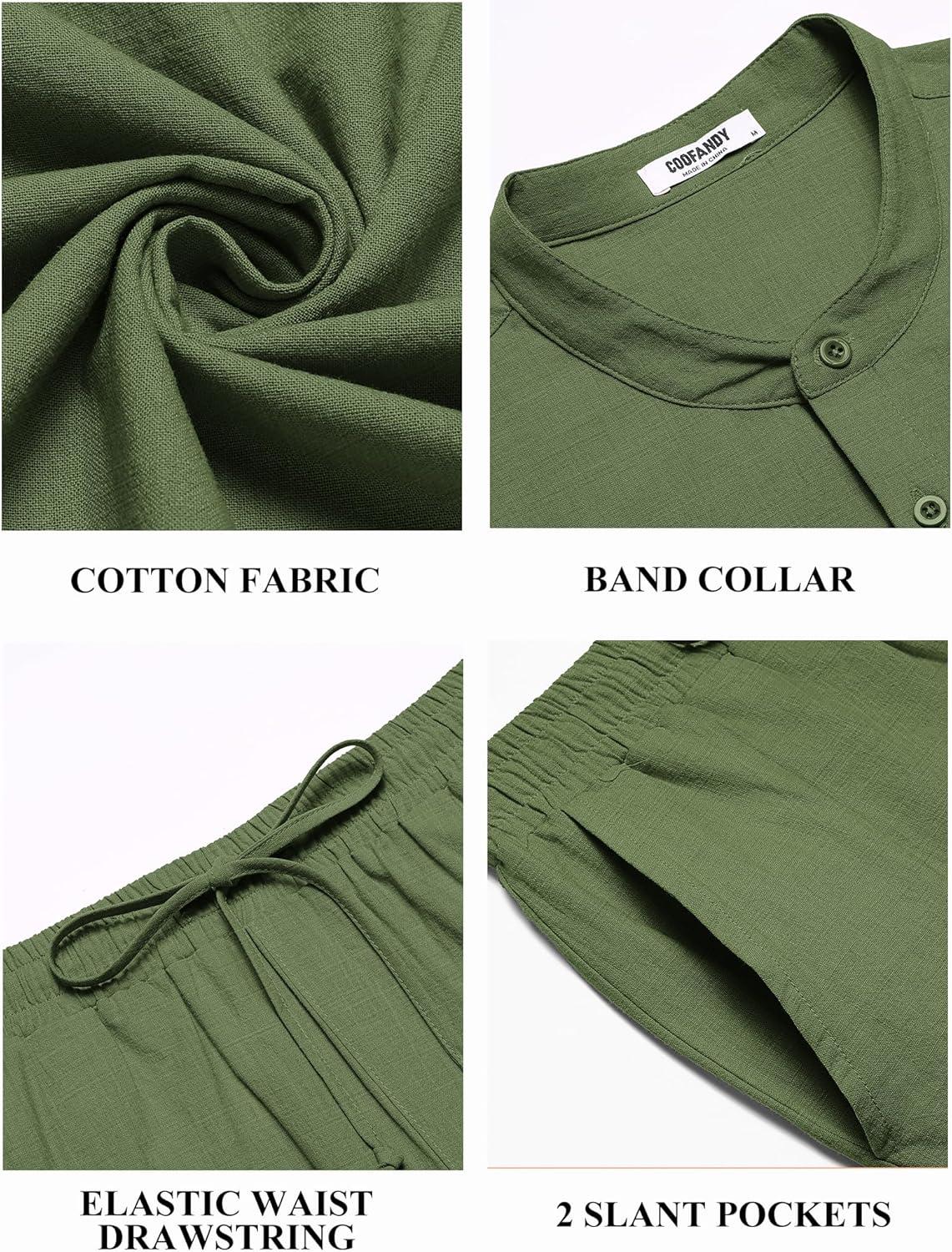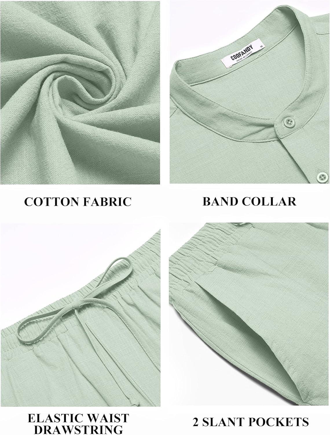 COOFANDY Men’s 2 Pieces Cotton Linen Set Casual Short Sleeve Henley Shirts Beach Yoga Pants Summer Outfits(Green)