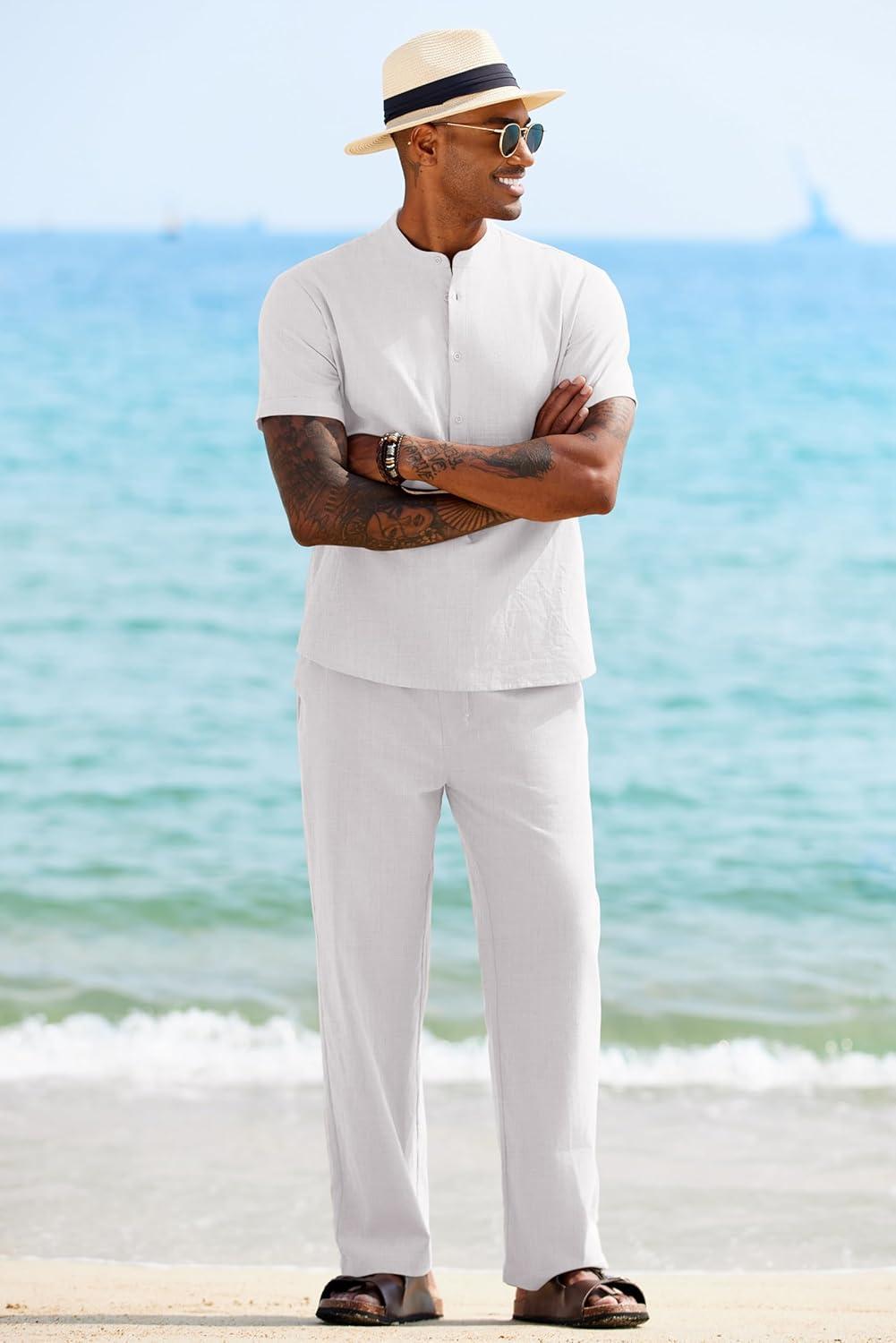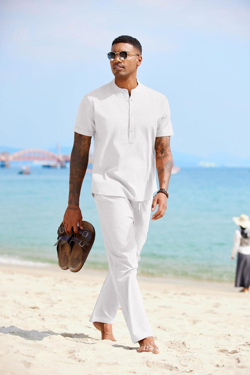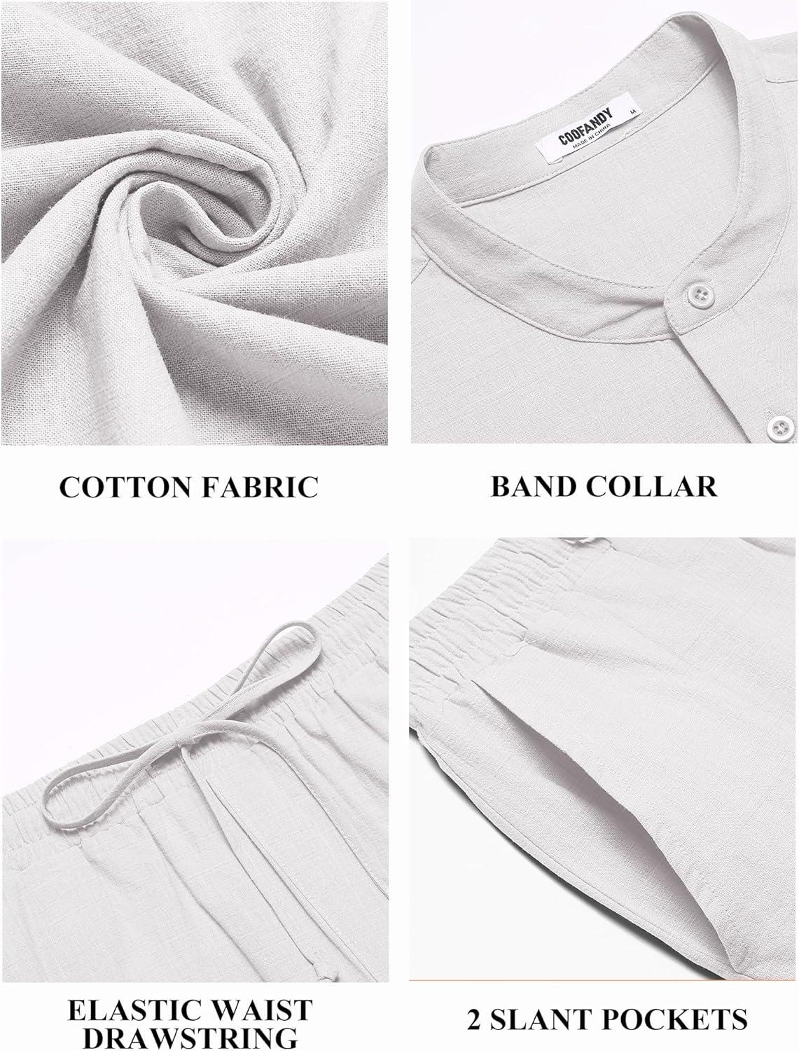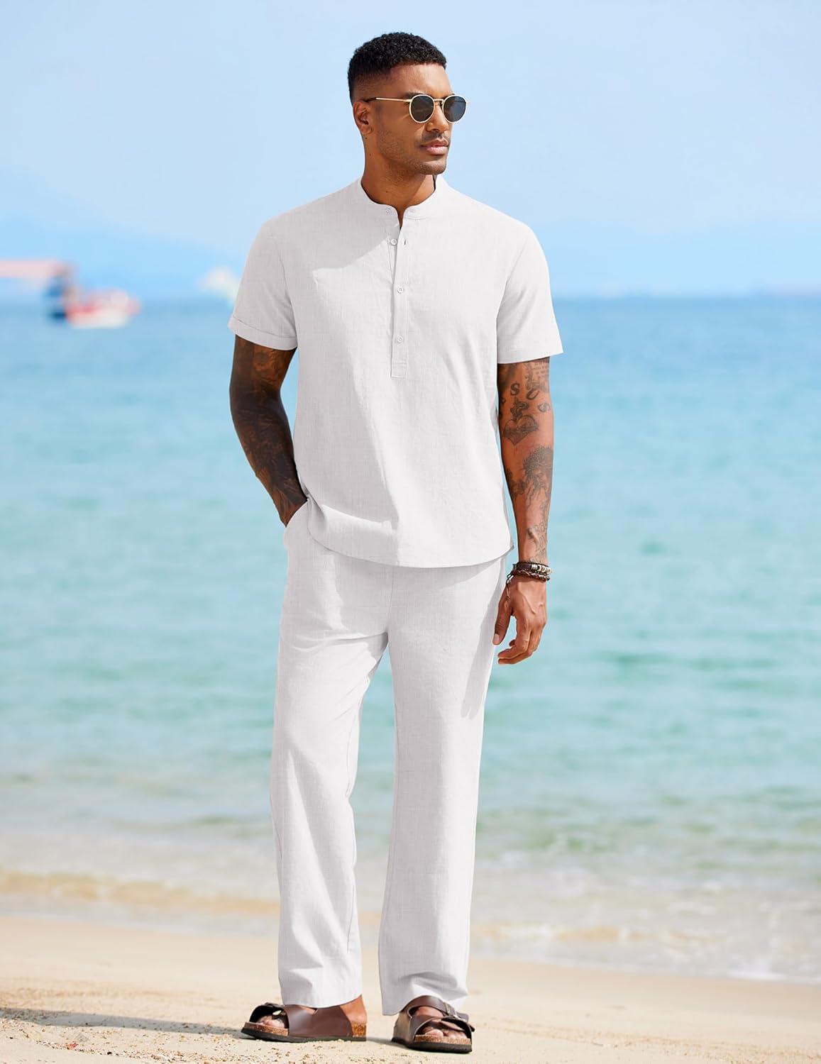 COOFANDY Men’s 2 Pieces Cotton Linen Set Casual Short Sleeve Henley Shirts Beach Yoga Pants Summer Outfits(All White)