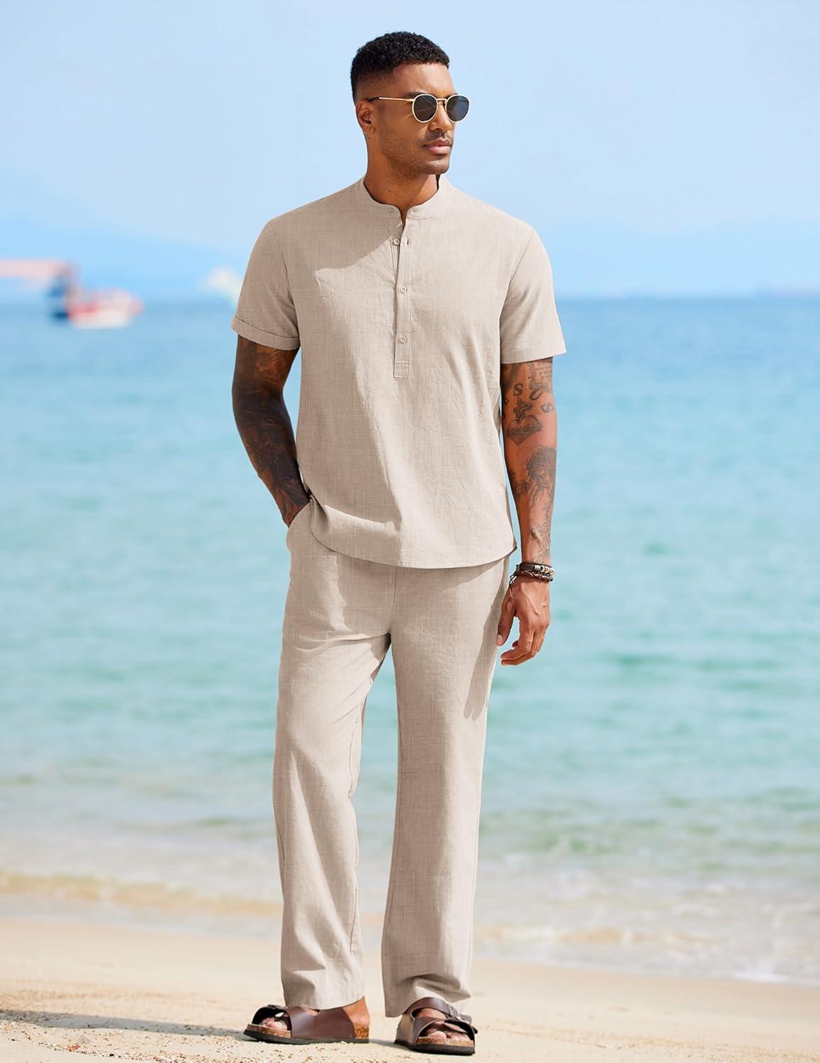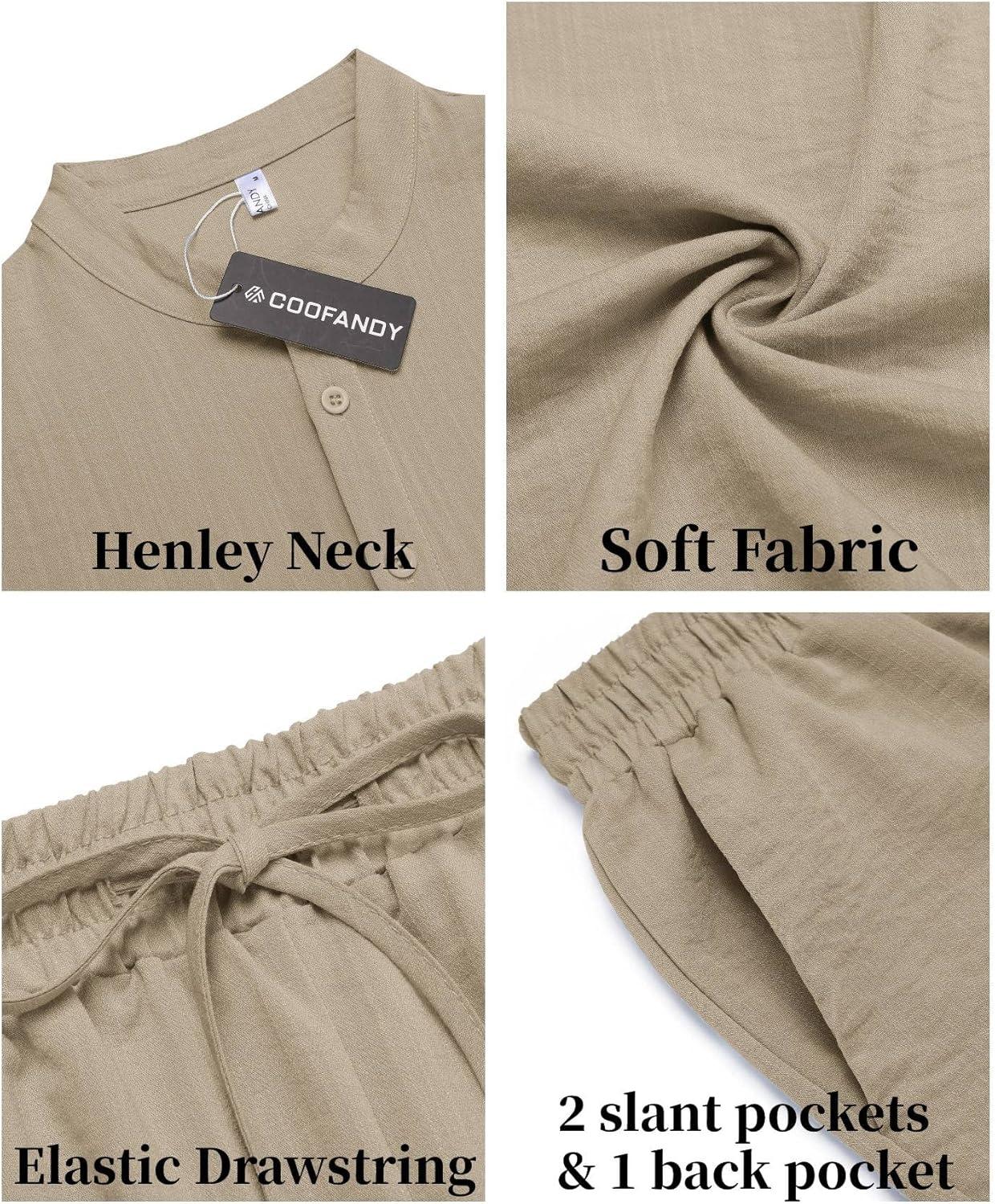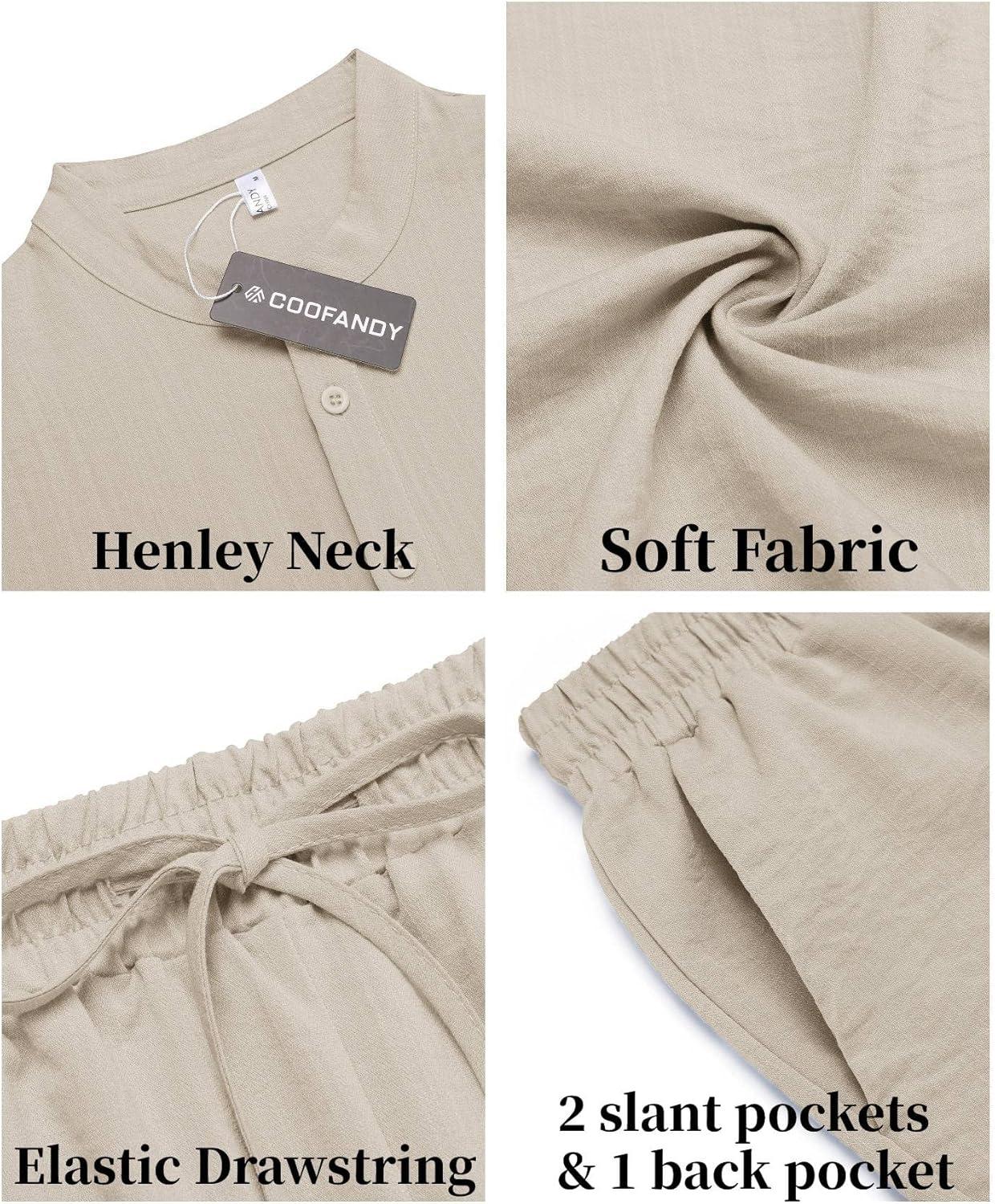 COOFANDY Men’s 2 Pieces Cotton Linen Set Casual Short Sleeve Henley Shirts Beach Yoga Pants Summer Outfits(Beige)