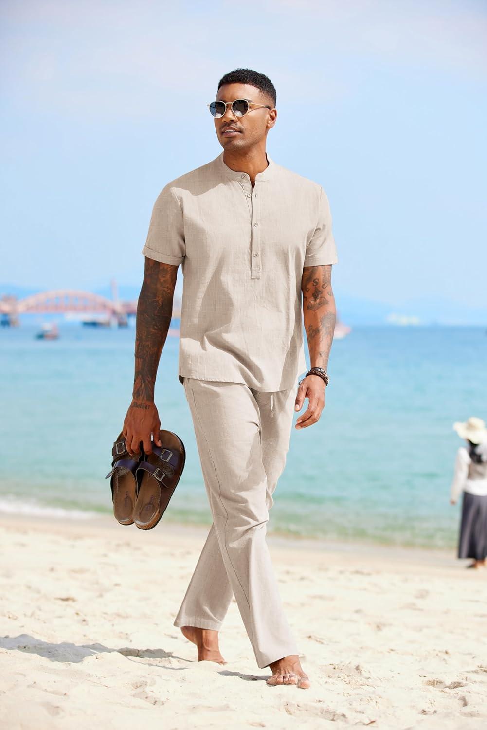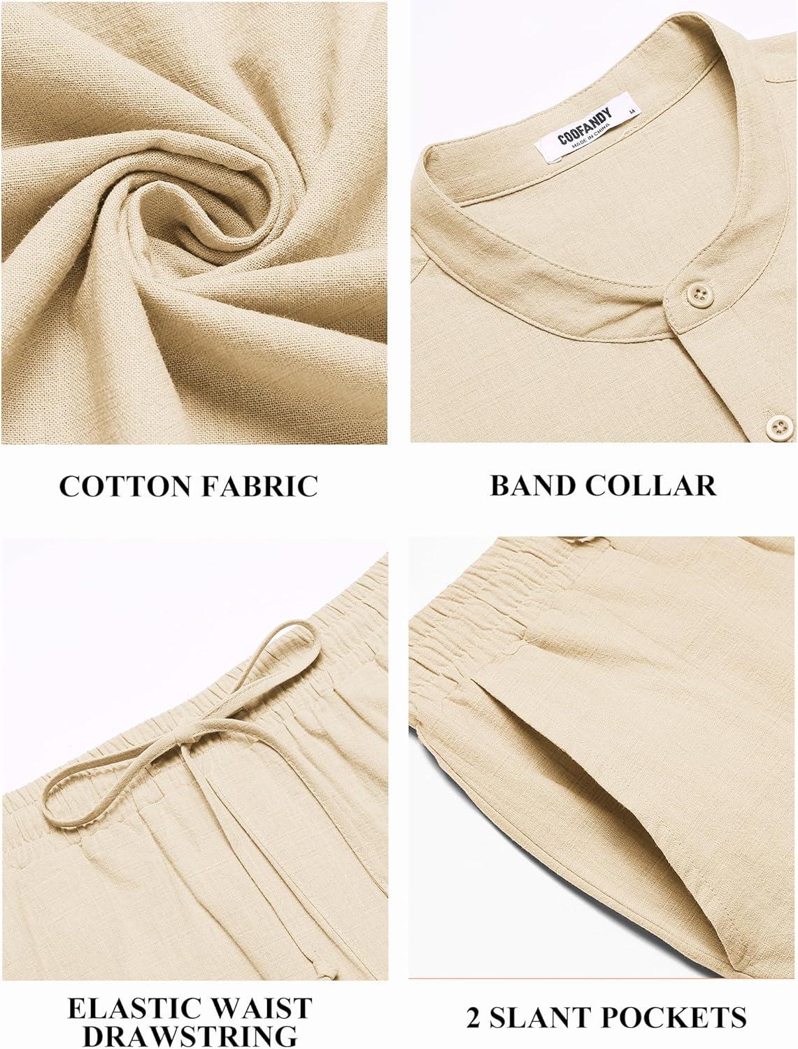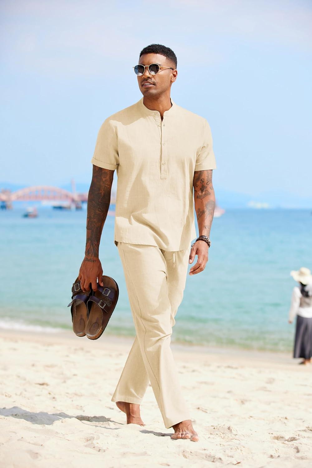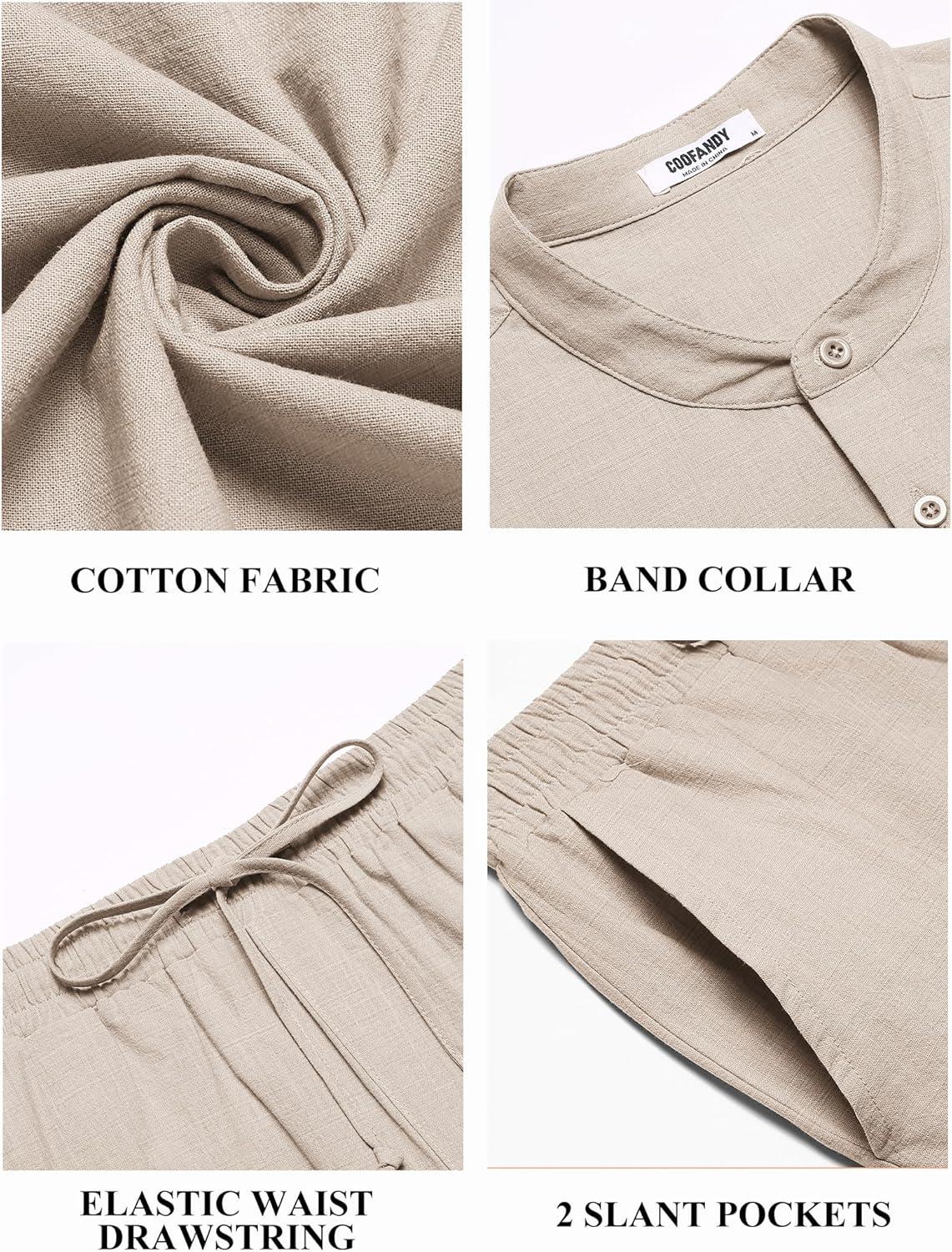 COOFANDY Men’s 2 Pieces Cotton Linen Set Casual Short Sleeve Henley Shirts Beach Yoga Pants Summer Outfits(Beige)