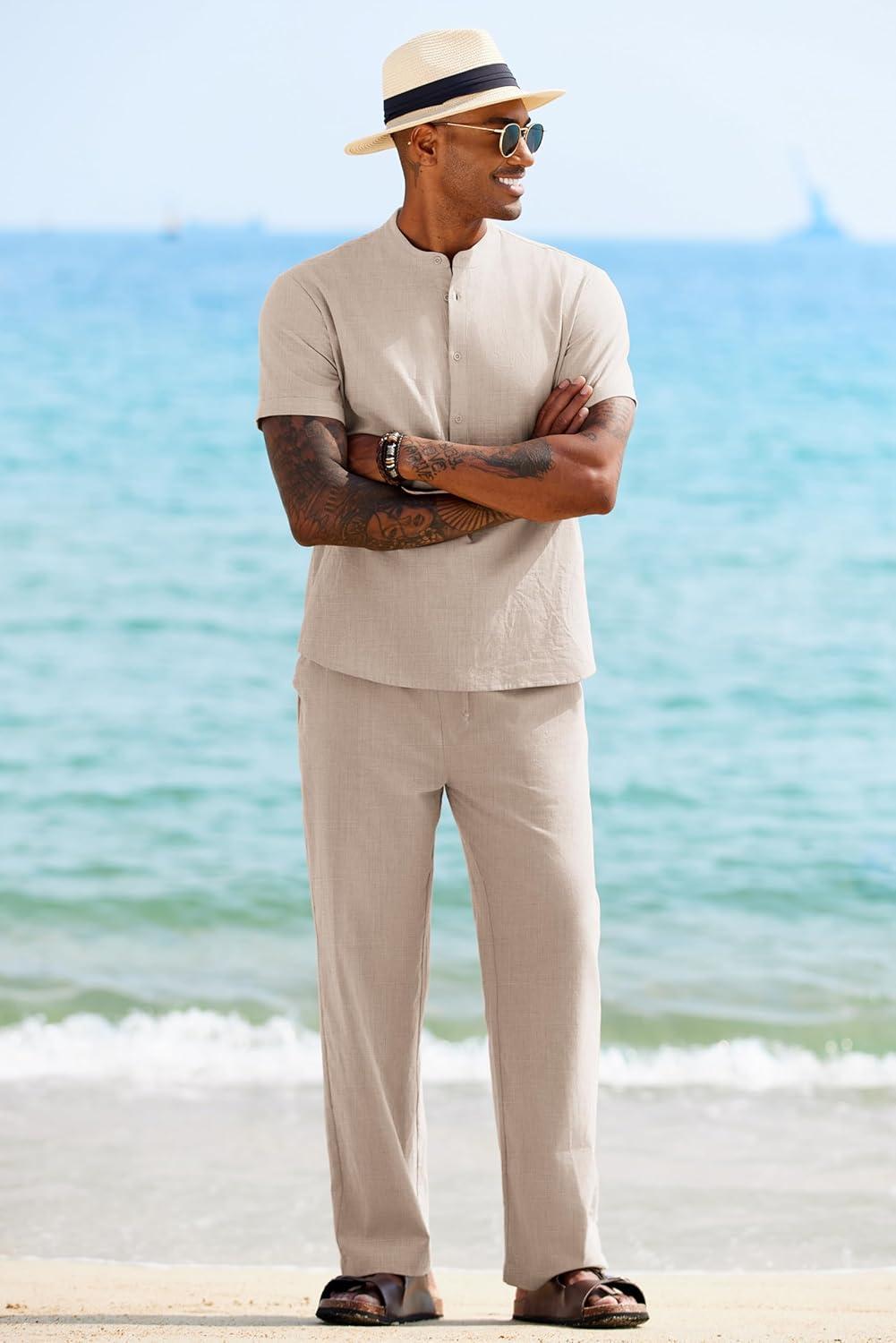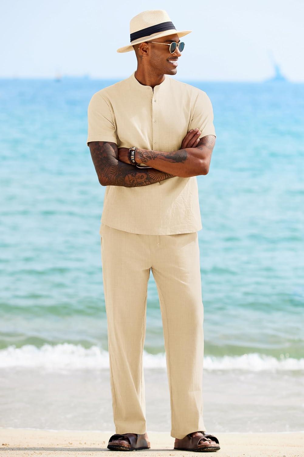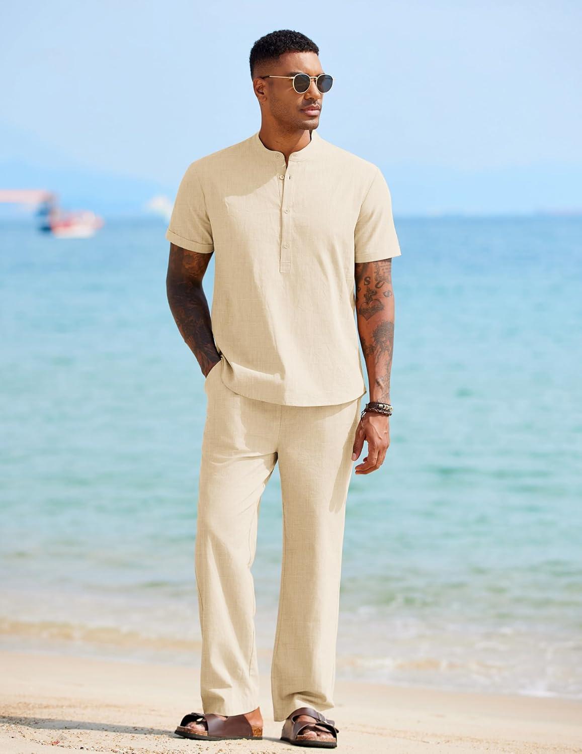 COOFANDY Mens 2 Pieces Cotton Linen Sets Short Sleeve Casual Henley Shirt Summer Beach Pants Lounge Vacation Outfits Set(Beige)
