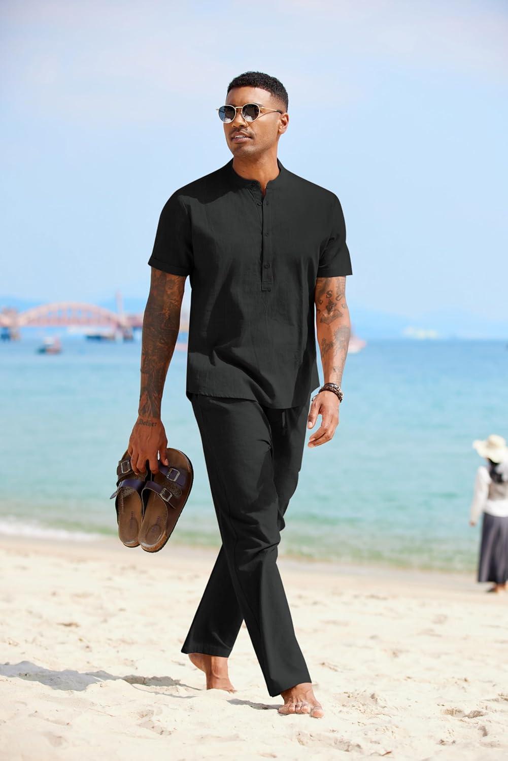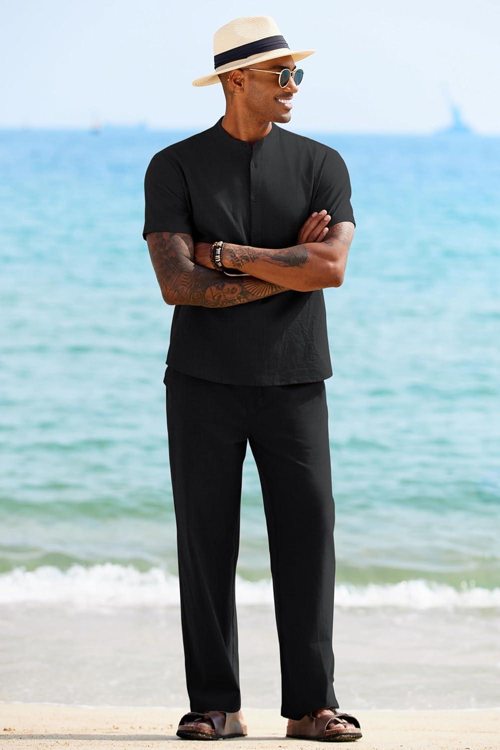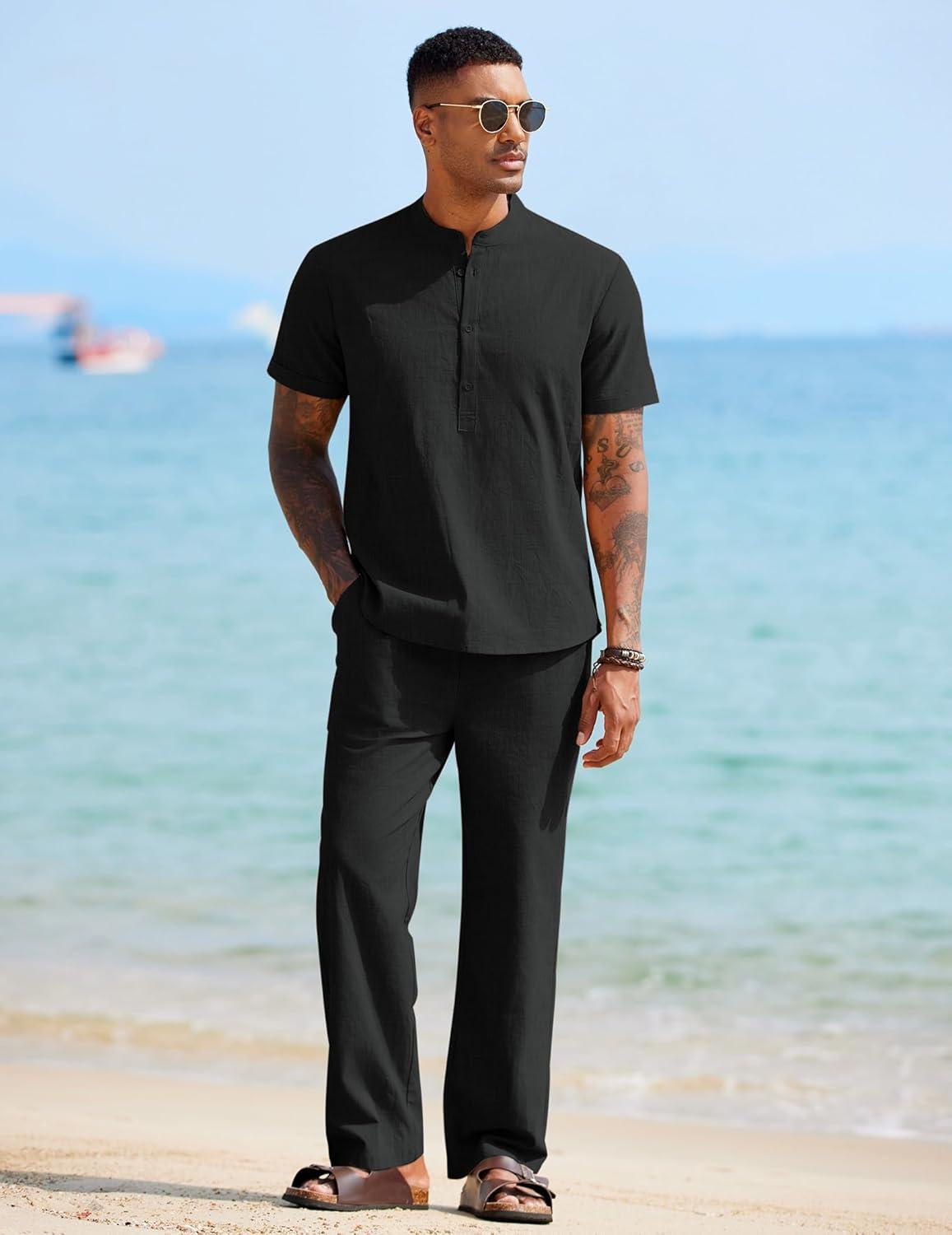 COOFANDY Mens 2 Pieces Cotton Linen Sets Short Sleeve Casual Henley Shirt Summer Beach Pants Lounge Vacation Outfits Set(Black)