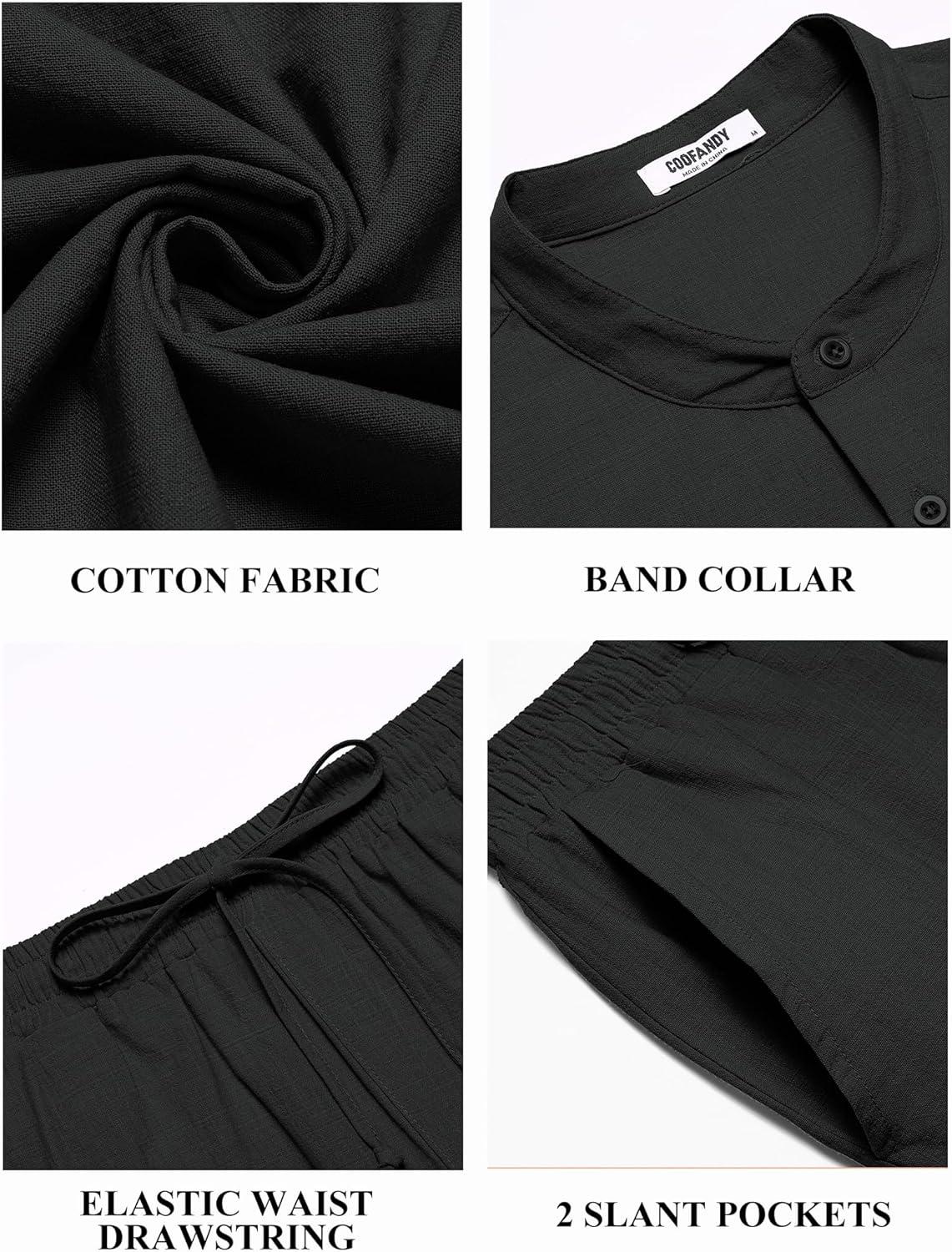 COOFANDY Men’s 2 Pieces Cotton Linen Set Casual Short Sleeve Henley Shirts Beach Yoga Pants Summer Outfits(Black)