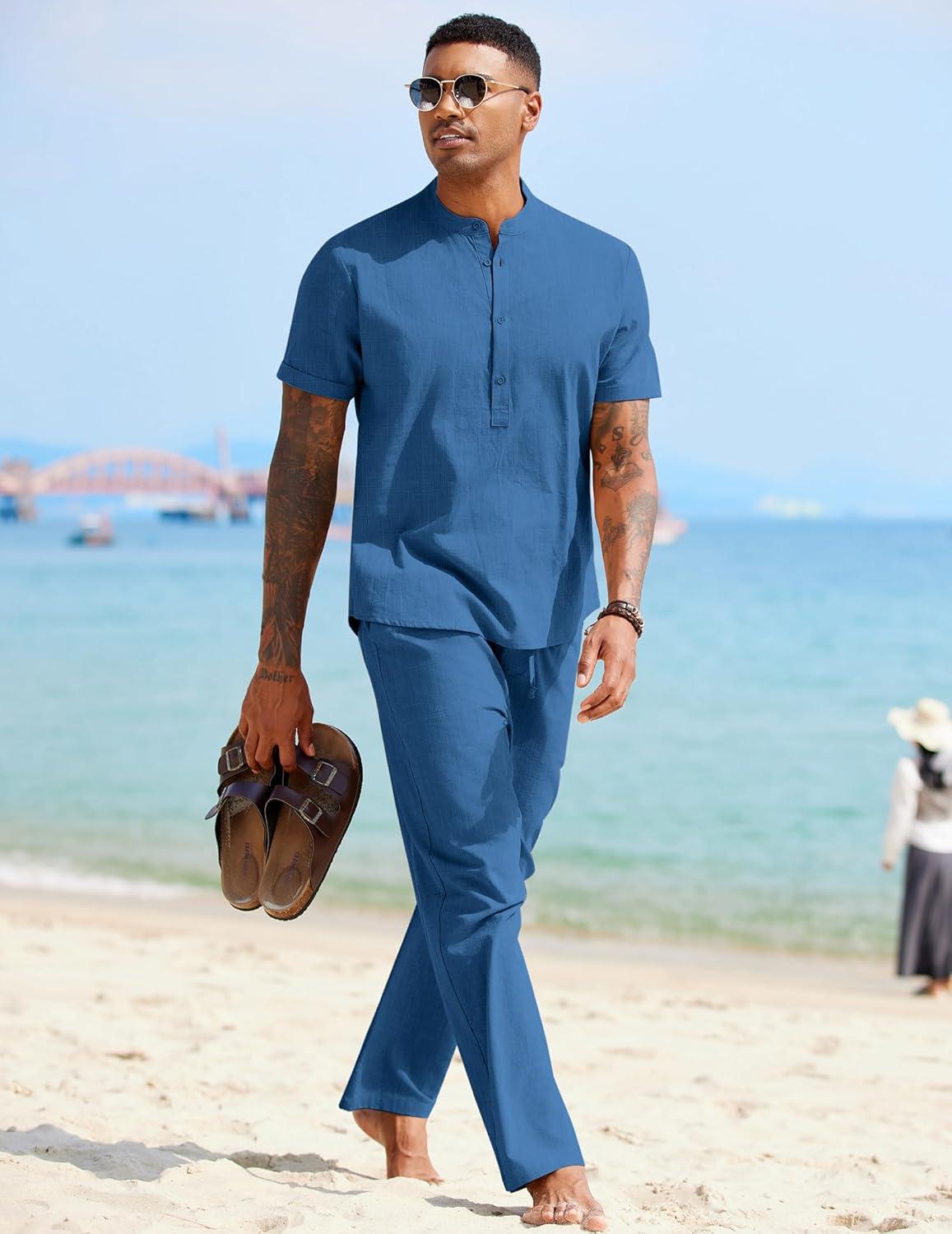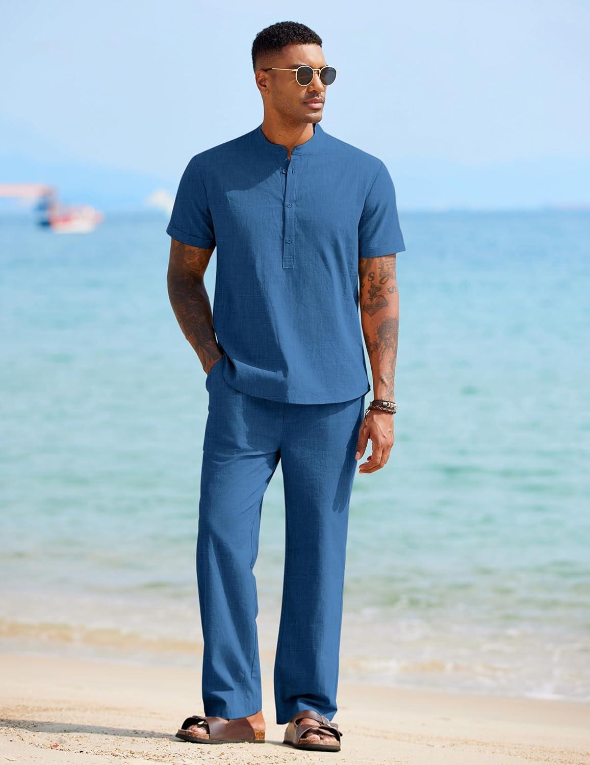 COOFANDY Men’s 2 Pieces Cotton Linen Set Casual Short Sleeve Henley Shirts Beach Yoga Pants Summer Outfits(Blue)
