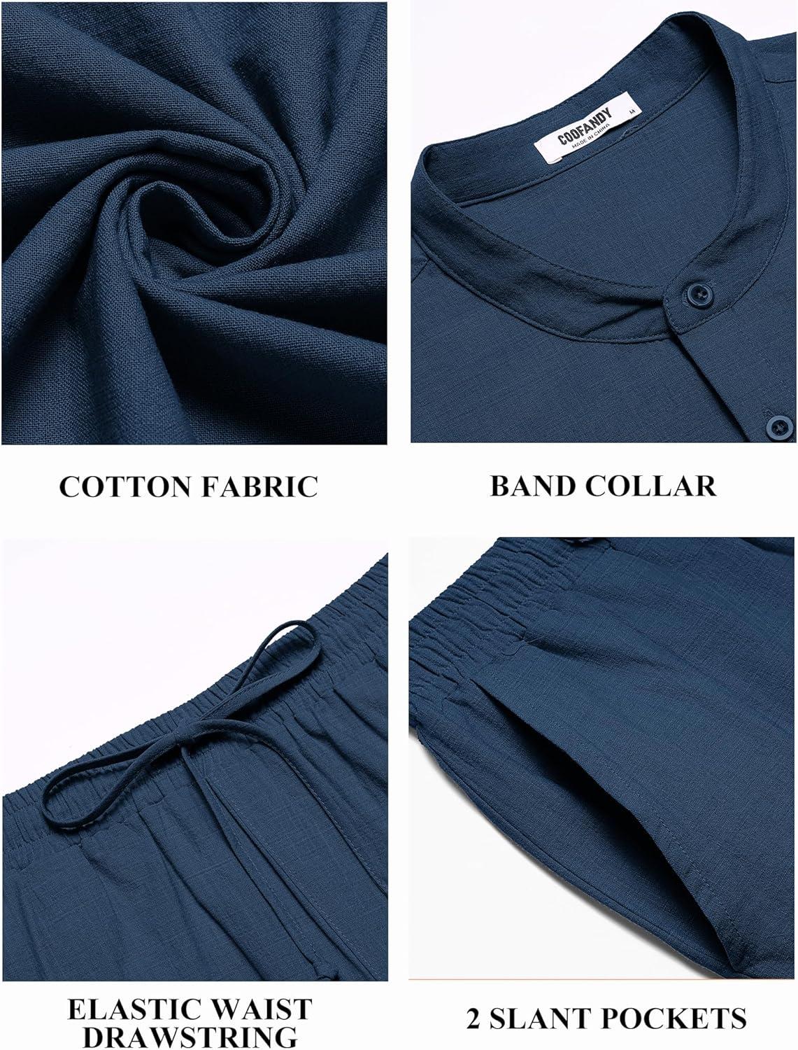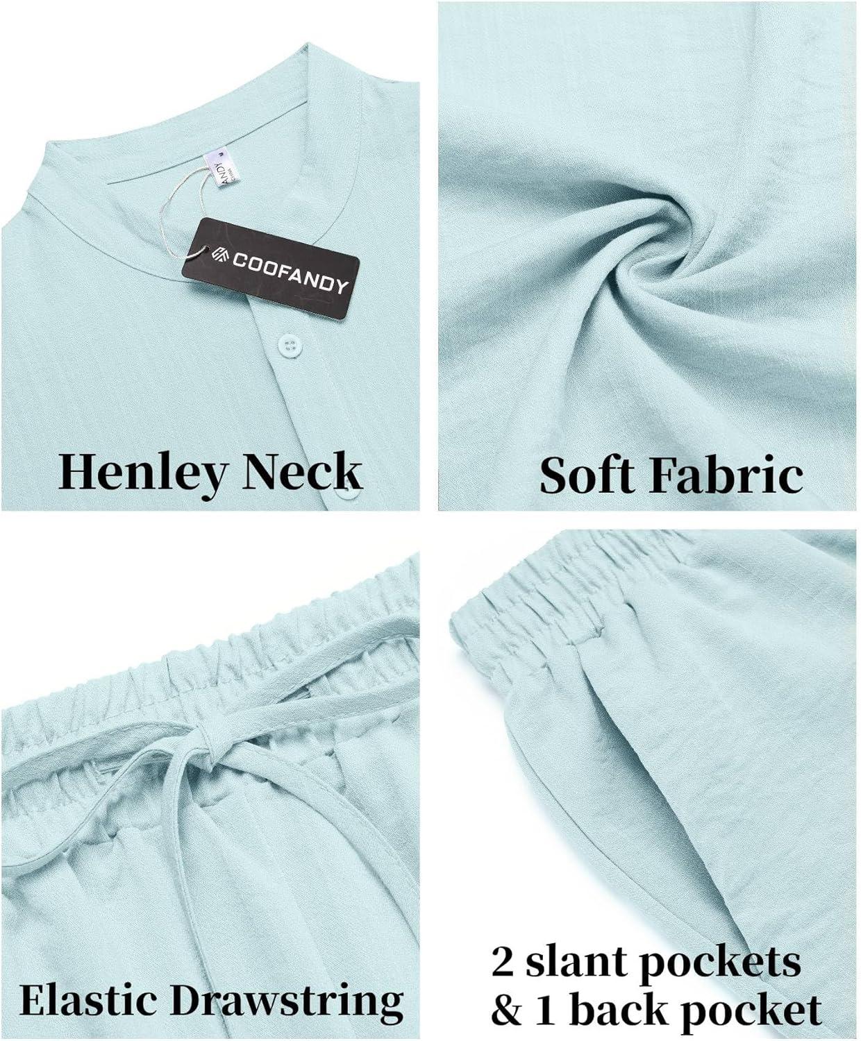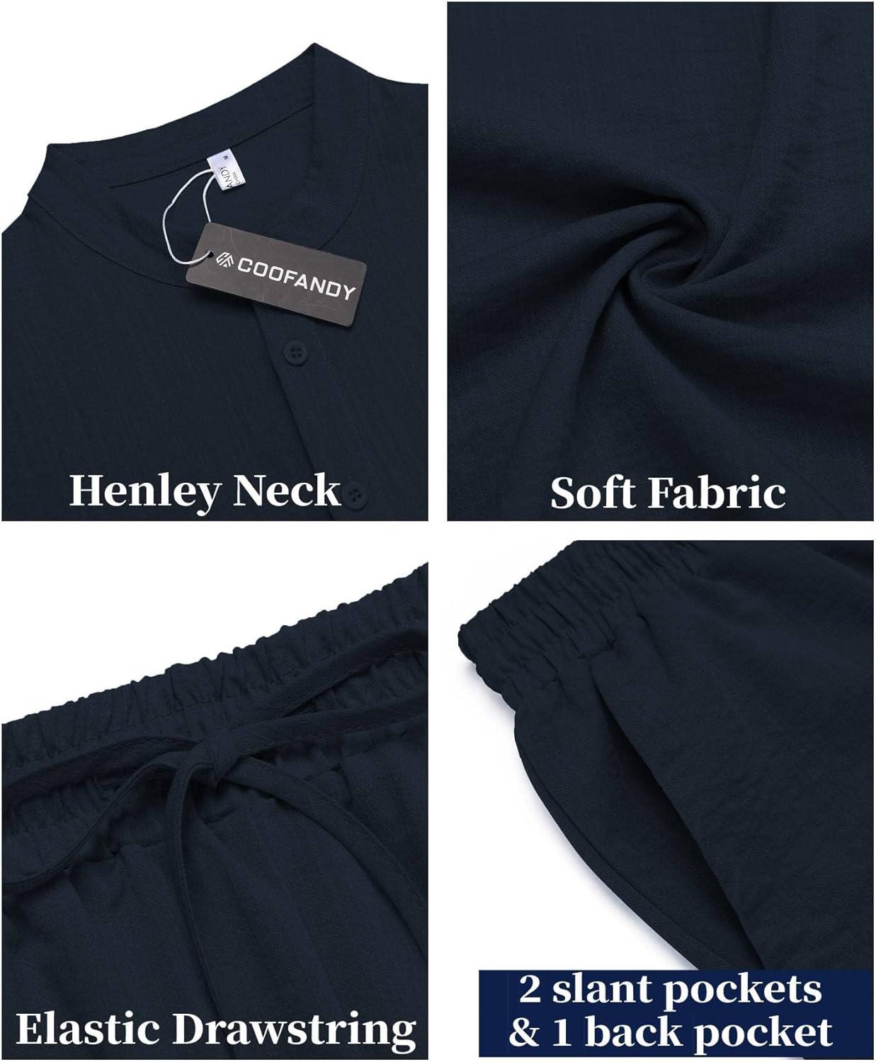 COOFANDY Men’s 2 Pieces Cotton Linen Set Casual Short Sleeve Henley Shirts Beach Yoga Pants Summer Outfits(Light Navy)