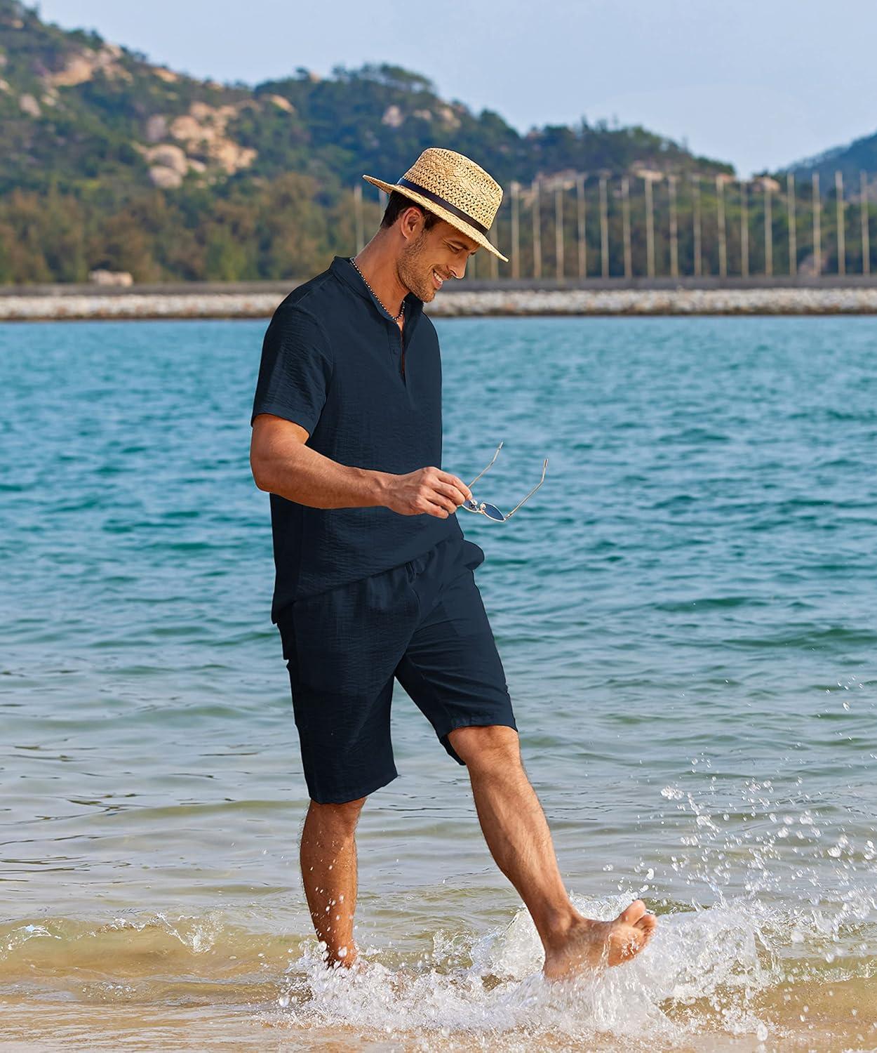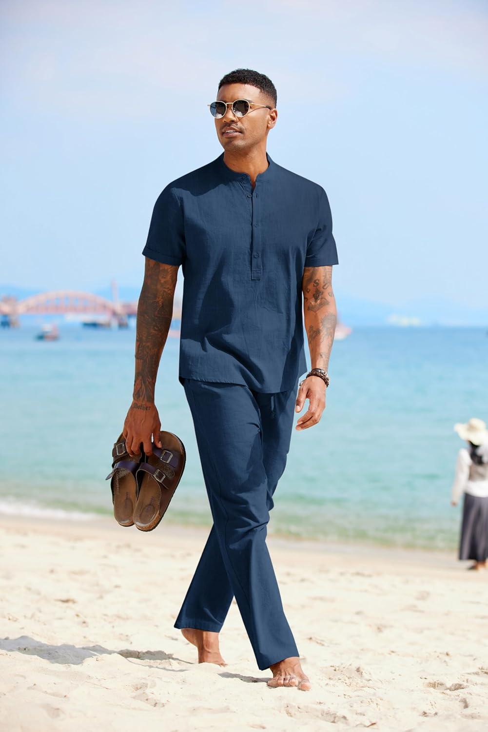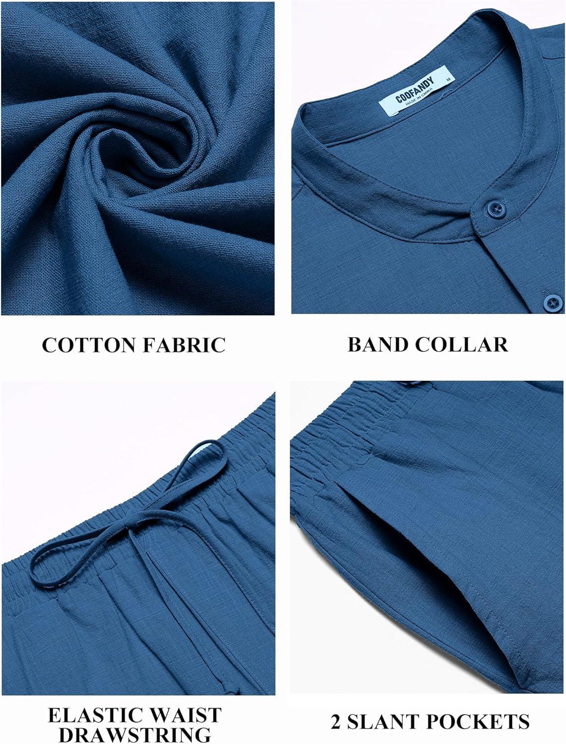 COOFANDY Men’s 2 Pieces Cotton Linen Set Casual Short Sleeve Henley Shirts Beach Yoga Pants Summer Outfits(Light Navy)