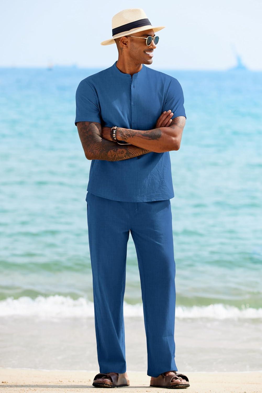 COOFANDY Mens 2 Pieces Cotton Linen Sets Short Sleeve Casual Henley Shirt Summer Beach Pants Lounge Vacation Outfits Set(Blue)