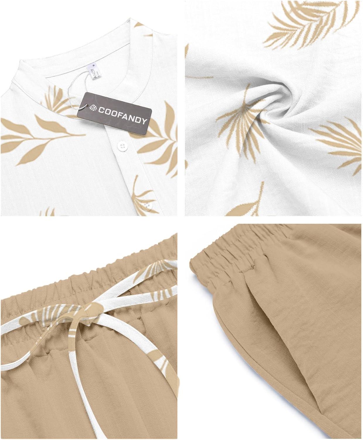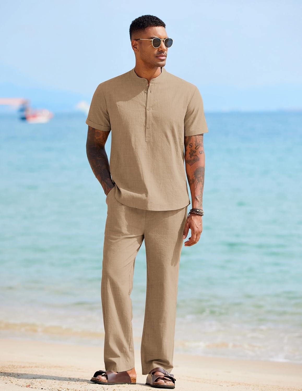 COOFANDY Mens 2 Pieces Cotton Linen Sets Short Sleeve Casual Henley Shirt Summer Beach Pants Lounge Vacation Outfits Set(Khaki)