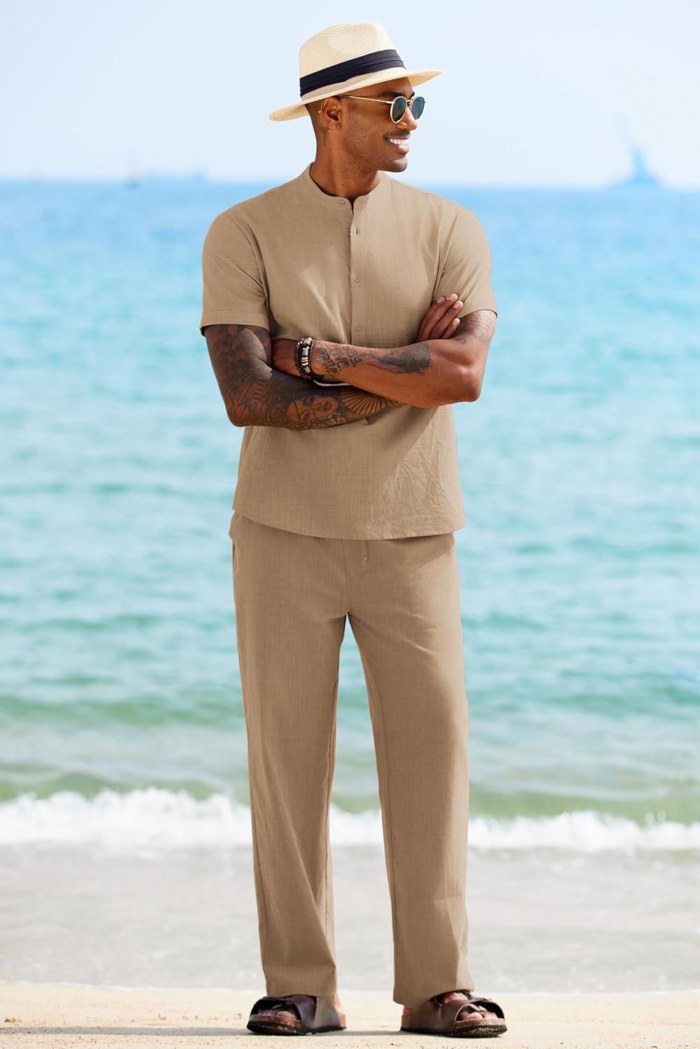 COOFANDY Mens 2 Pieces Cotton Linen Sets Short Sleeve Casual Henley Shirt Summer Beach Pants Lounge Vacation Outfits Set(Light Khaki)